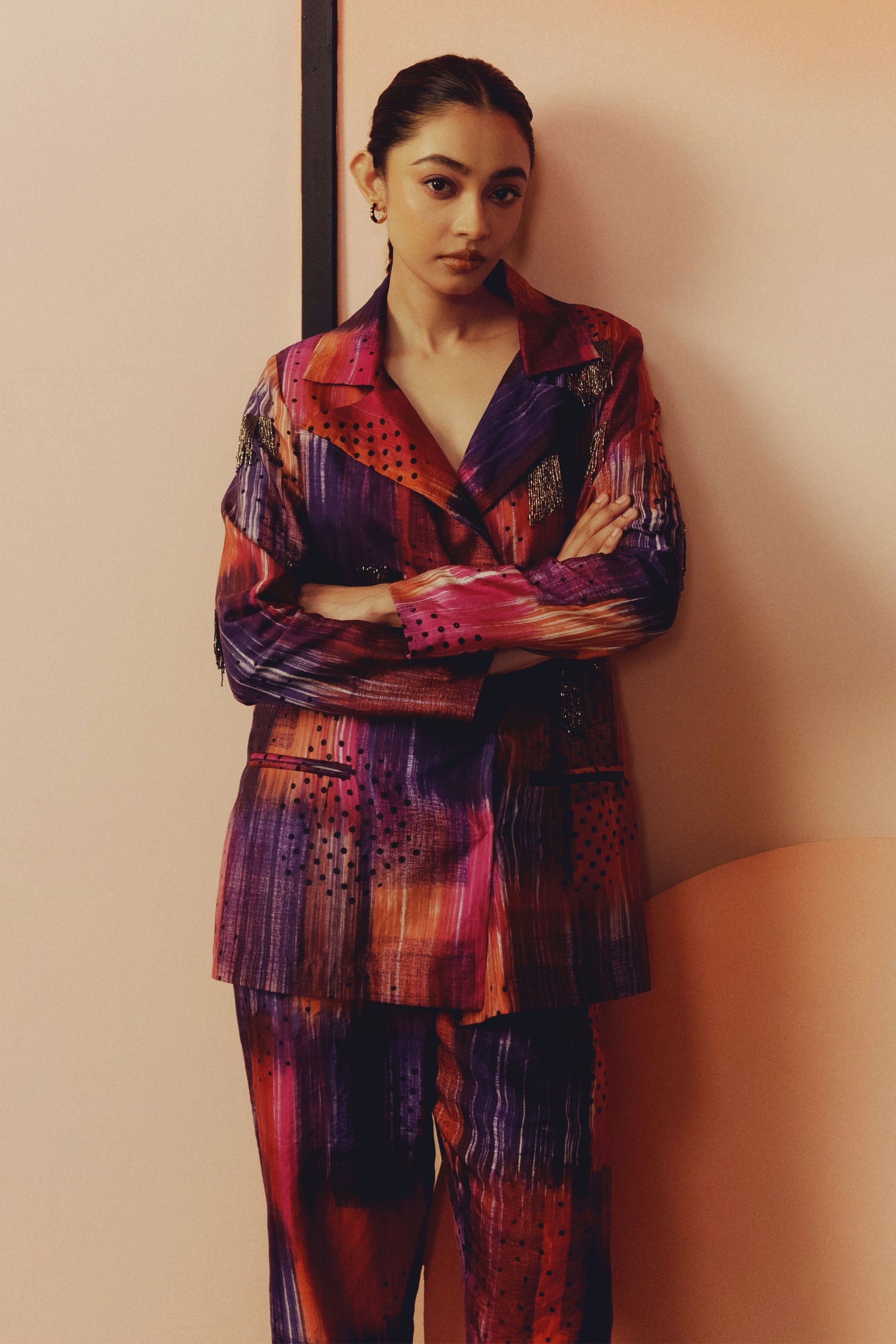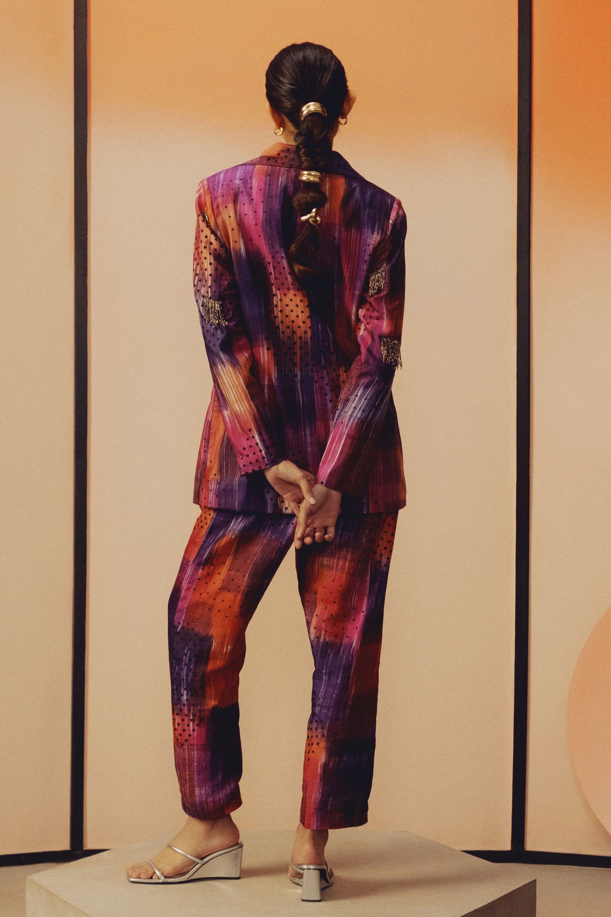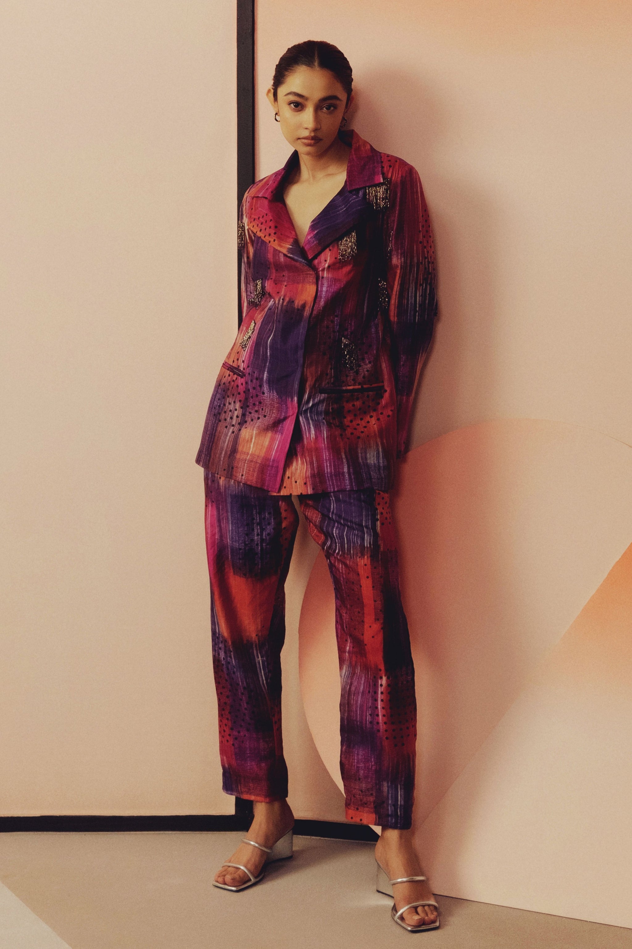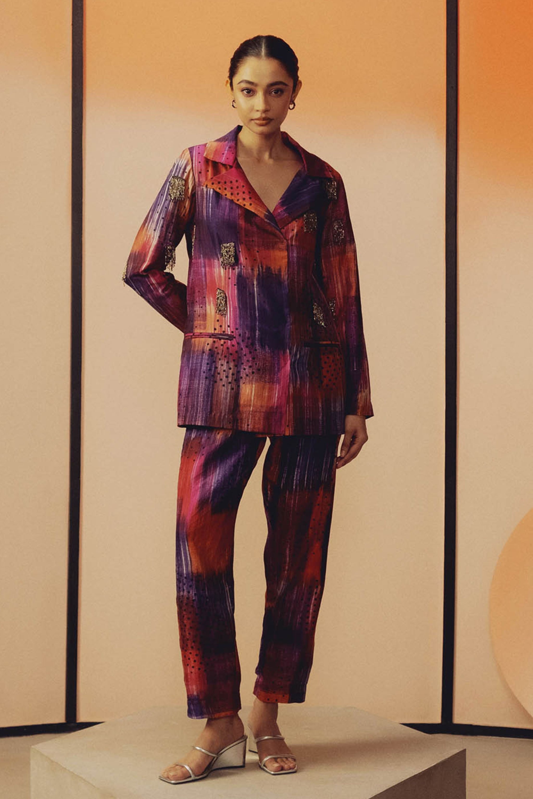 • This handwoven mulberry silk blazer set features a hand painted print highlighted with hand embroidery glass beadwork on the blazer. Designed in a classic easy fit silhouette, it is paired with narrow, ankle length pants featuring pockets on both the sides.