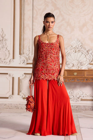 • Rust floral kurta with our signature floral cut-work embroidery. It is fully liner with the sheer cutwork top which is highlighted with cutdana, zari, dori and sequins. It is paired with georgette sharara pants.