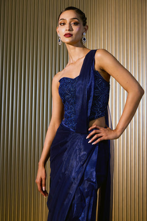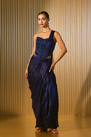 • A royal blue concept draped saree paired with a bejewelled hand beaded corset