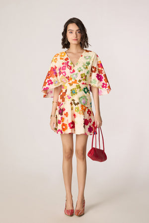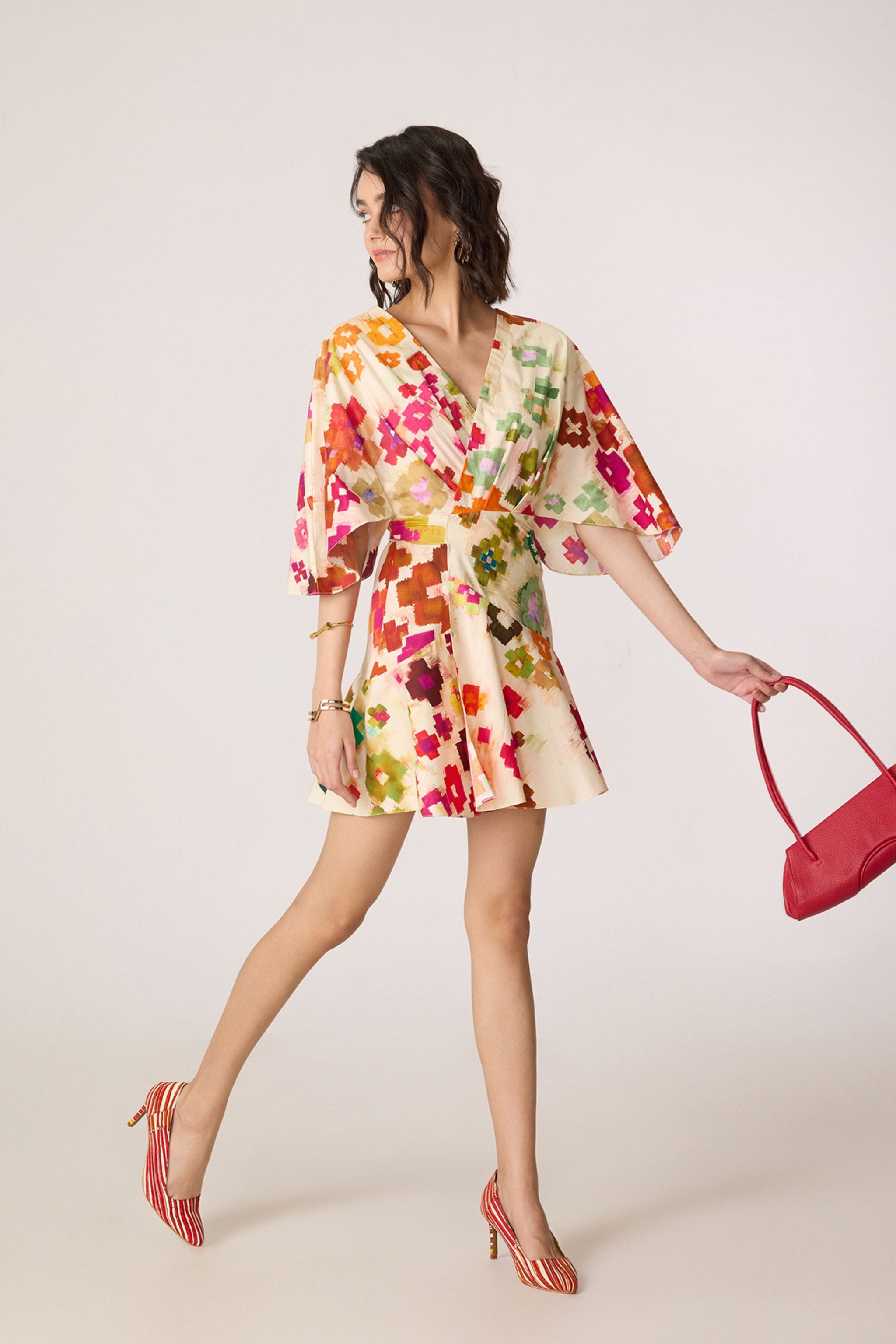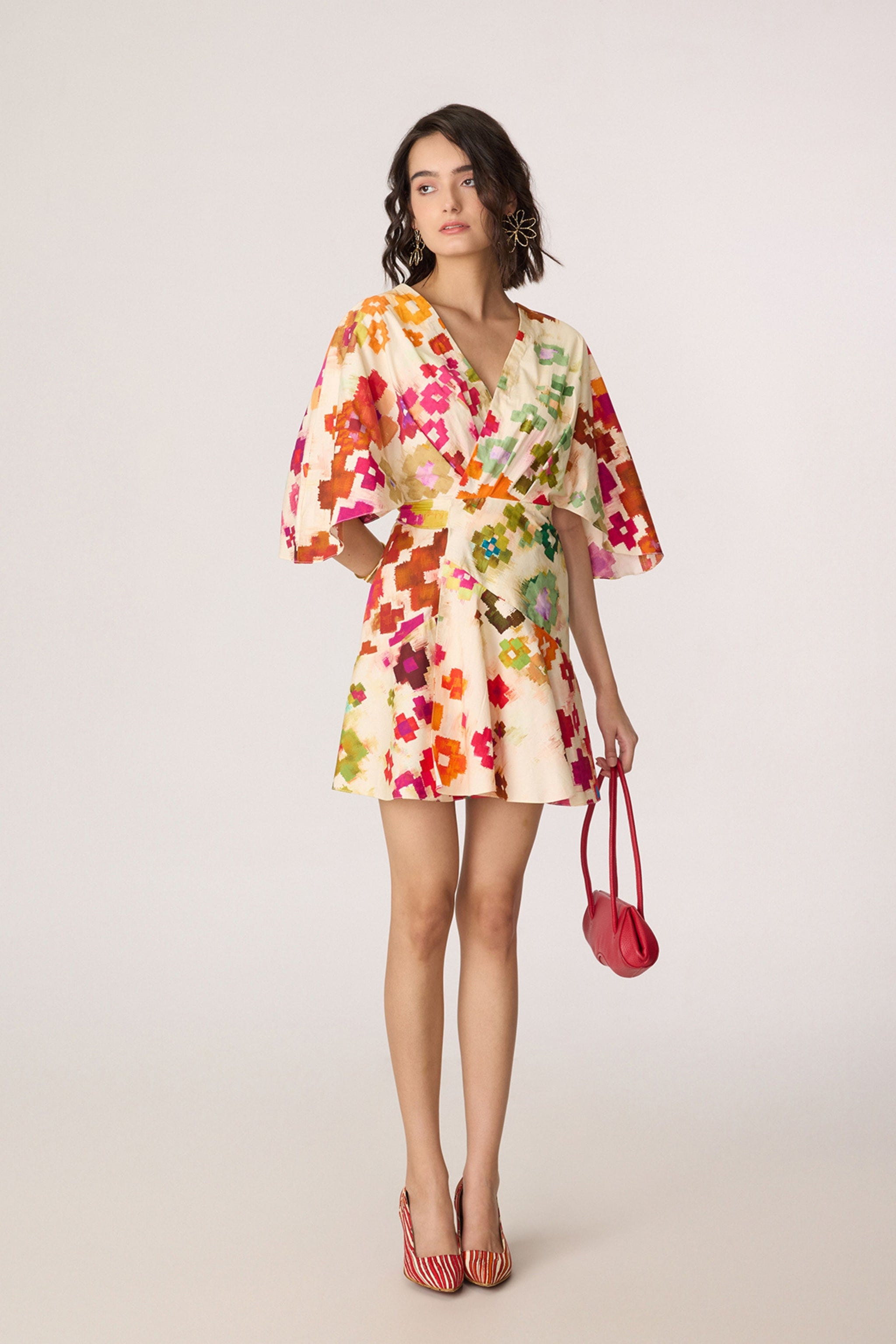 • Abstract ikat print kimono wrap style mini dress with batwing sleeves. Print placement will vary from piece to piece.
