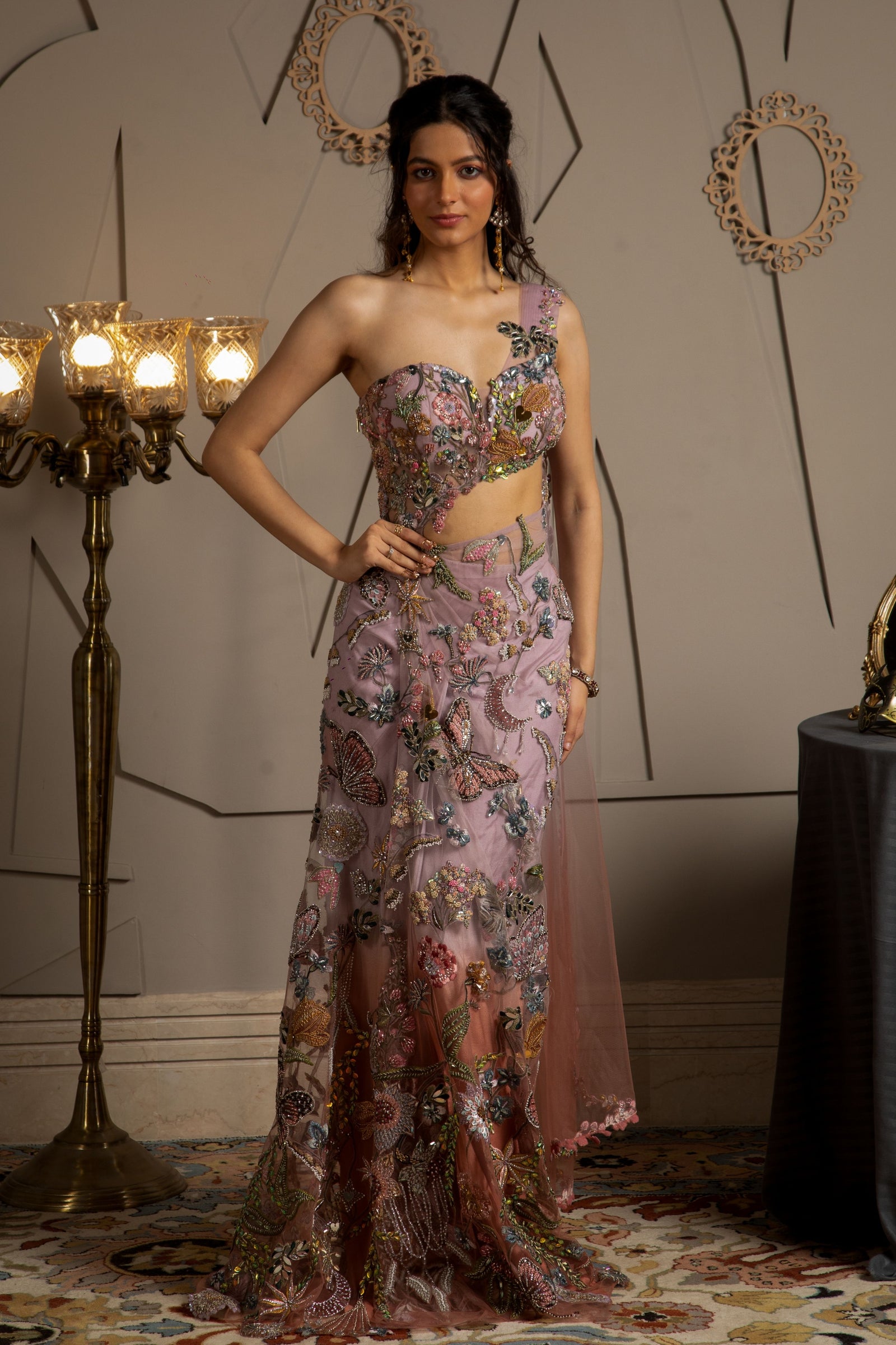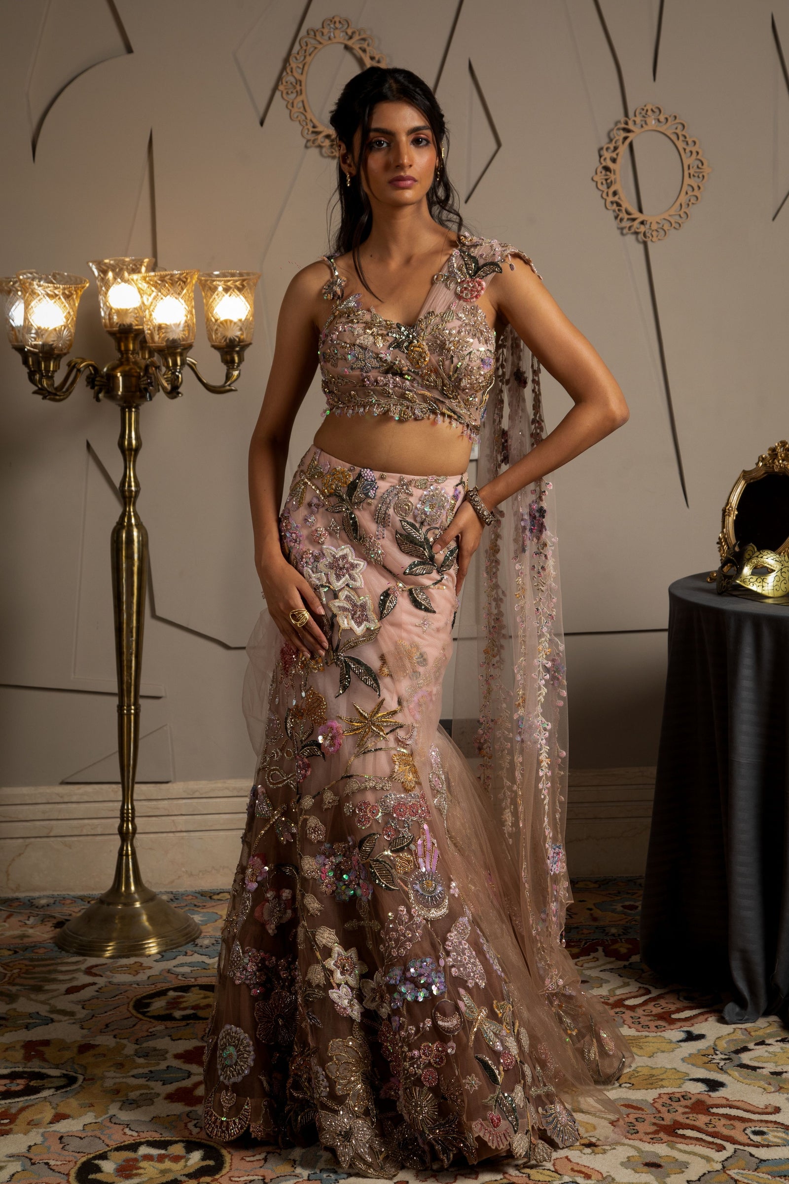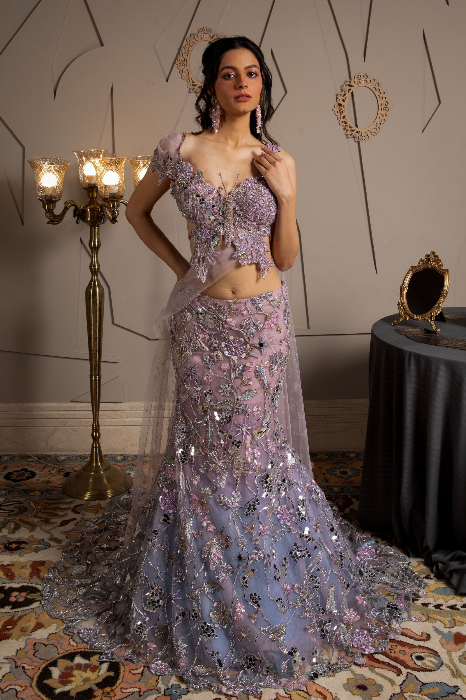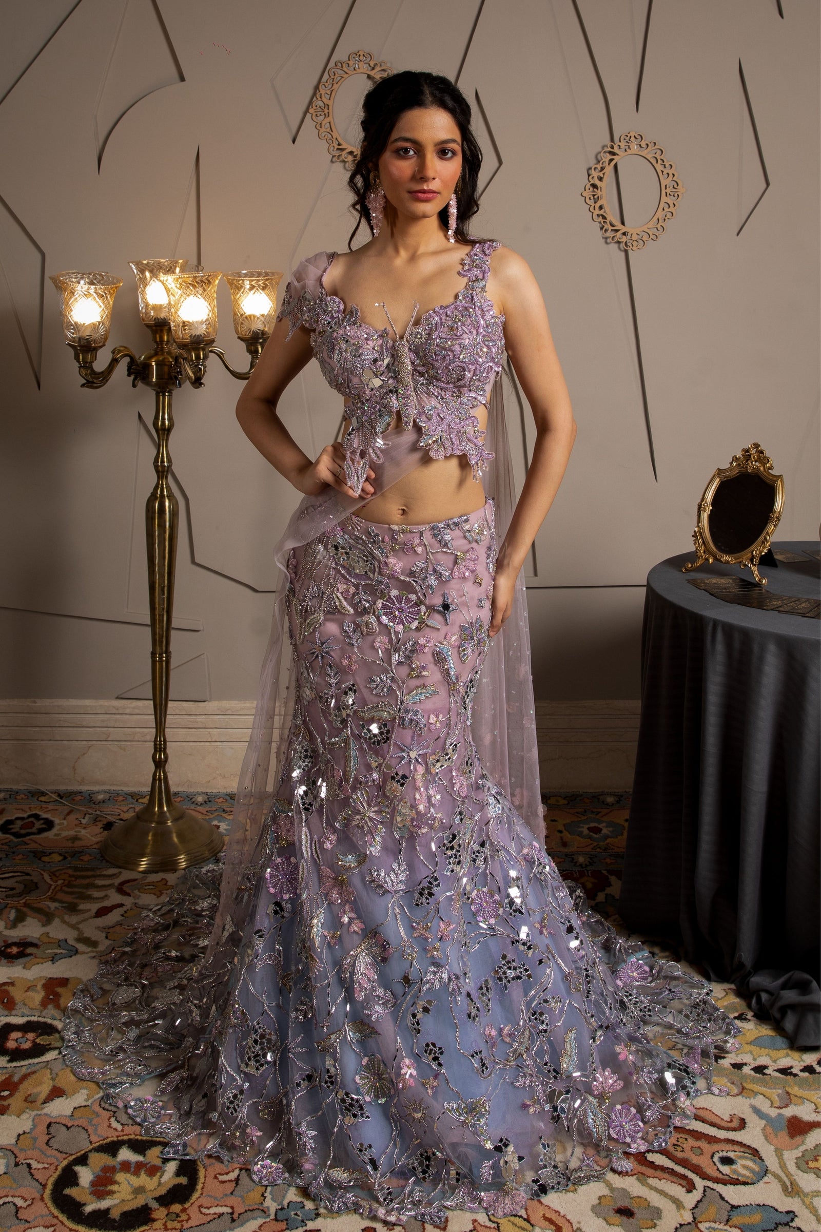 • Skye features dreamy signature butterfly-shaped blouse lehenga, designed to make every moment magical. The attached pallu, finished with delicate danglers at the edge, completes this captivating ensemble, blending celestial wonder with timeless elegance. Zip on the back centre side of the lehenga skirt. Flowy translucent butterfly net dupatta with scattered soft silver sequins. Floral strap blouse adorned with floral motifs with back knot closure.