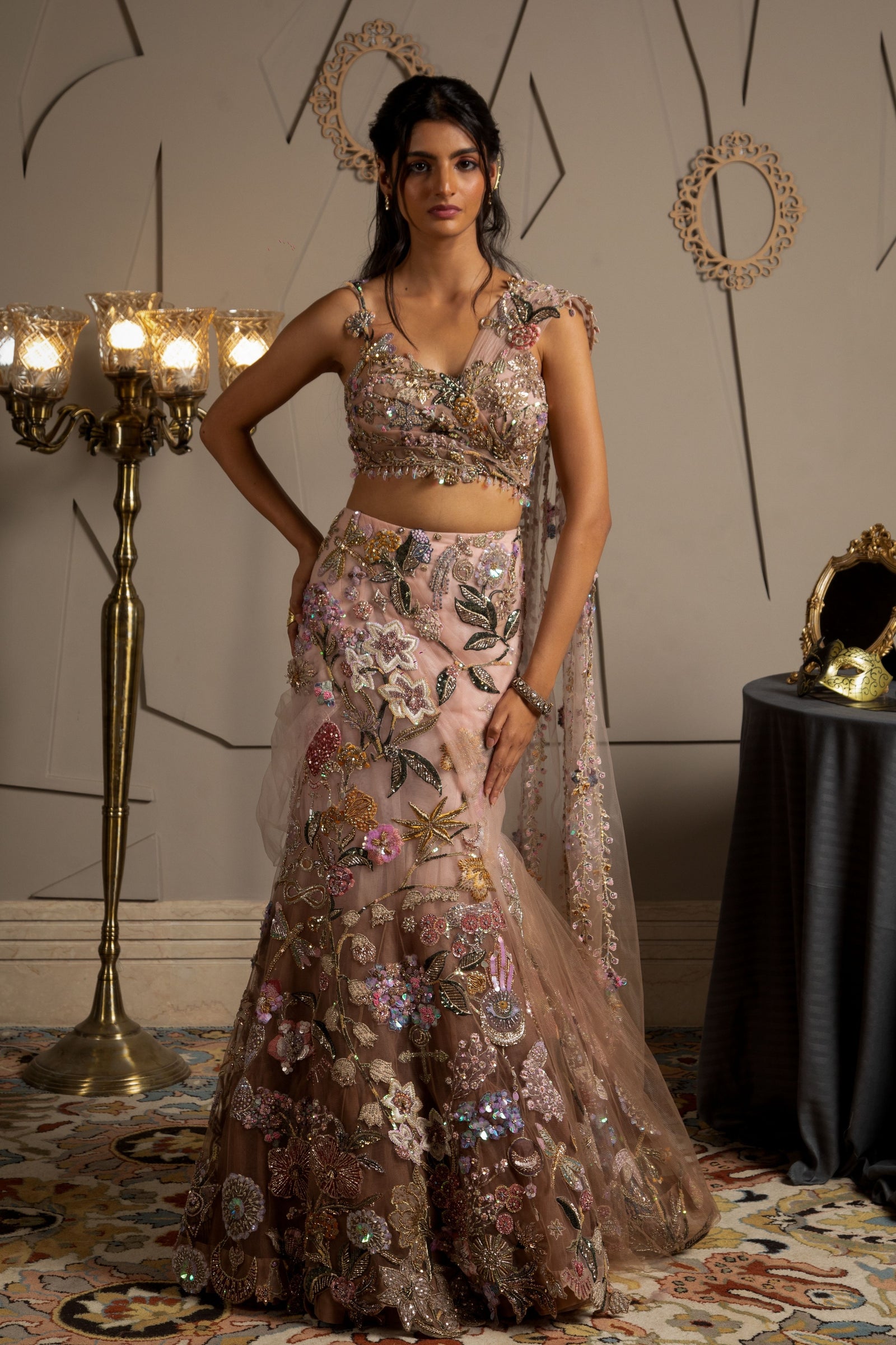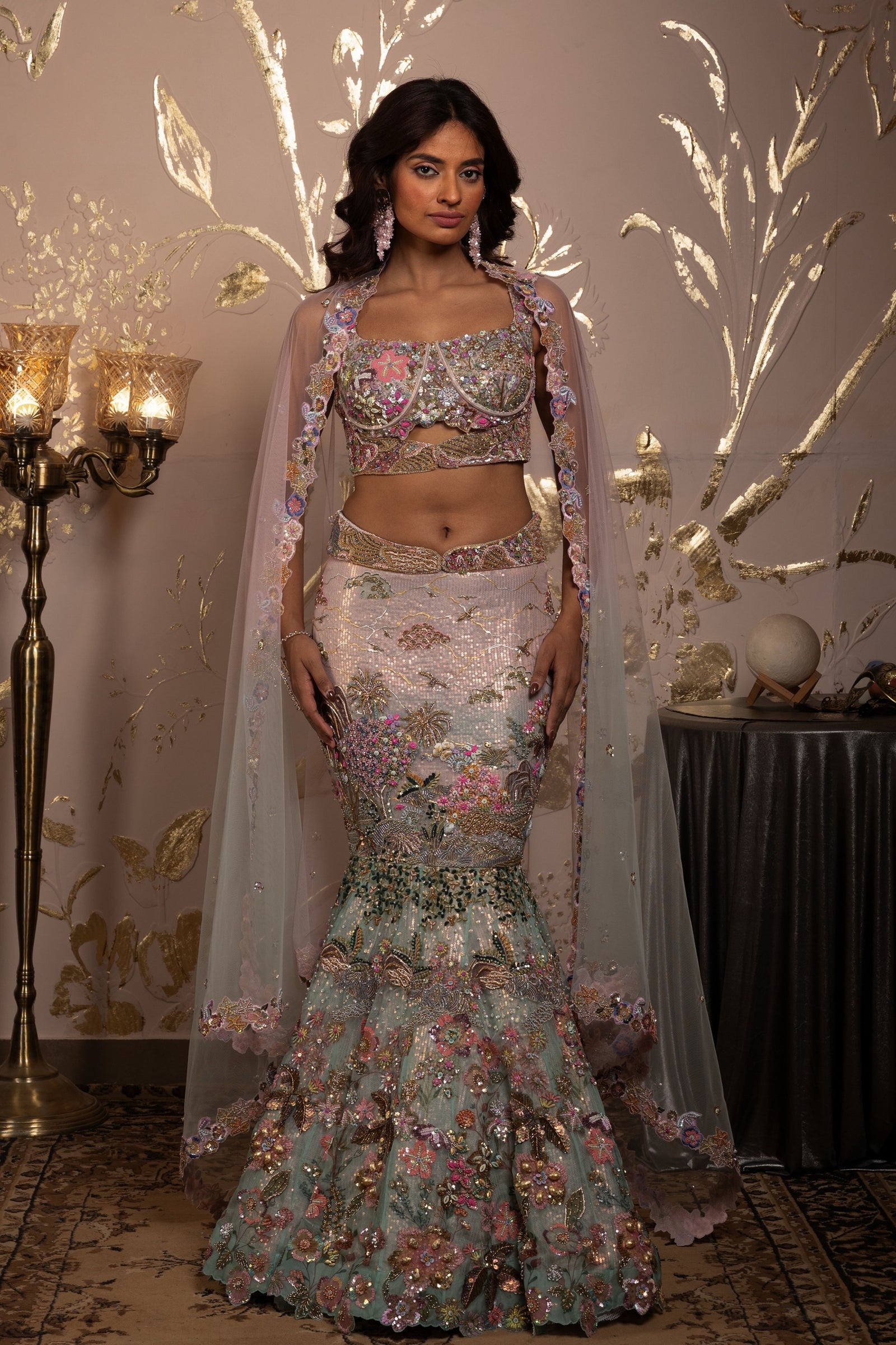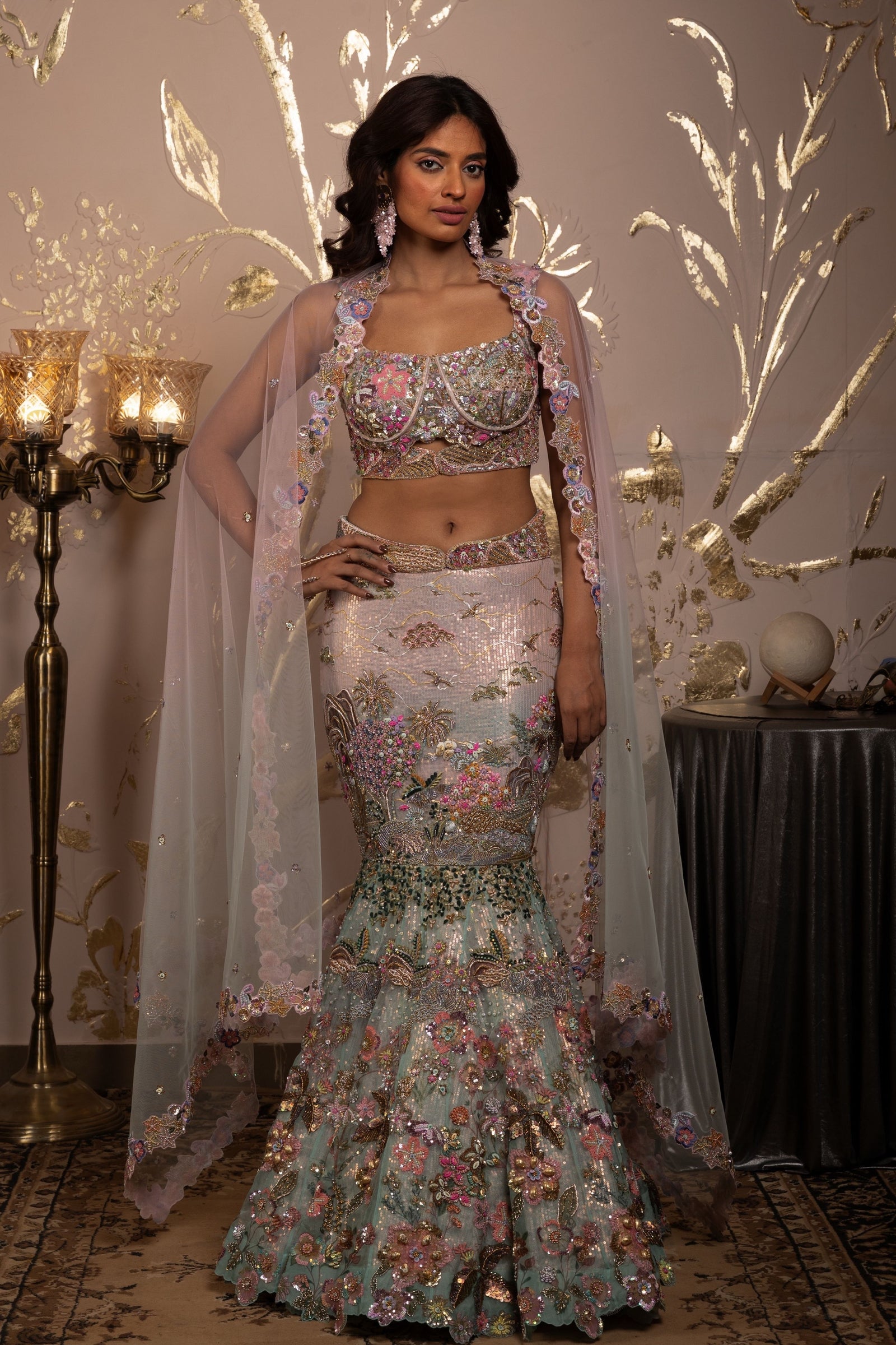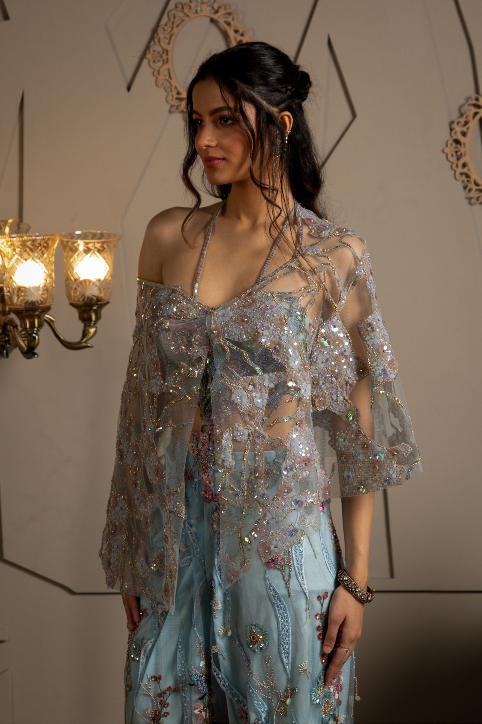 • Skye features dreamy signature butterfly-shaped blouse lehenga, designed to make every moment magical. The attached pallu, finished with delicate danglers at the edge, completes this captivating ensemble, blending celestial wonder with timeless elegance. Zip on the back centre side of the lehenga skirt. Flowy translucent butterfly net dupatta with scattered soft silver sequins. Floral strap blouse adorned with floral motifs with back knot closure.