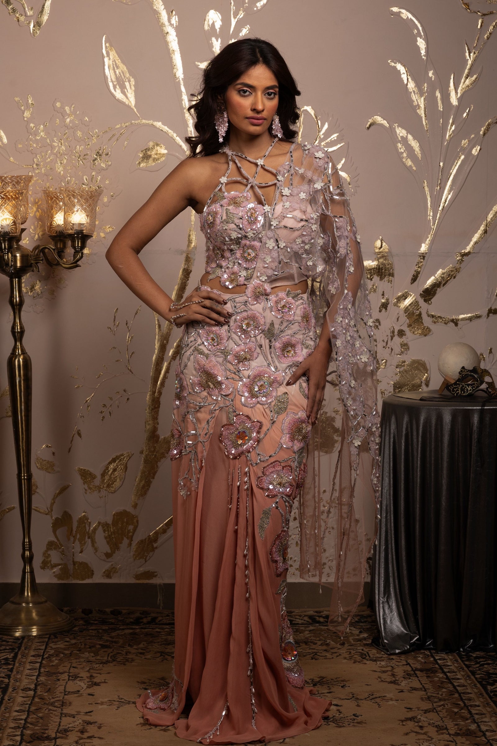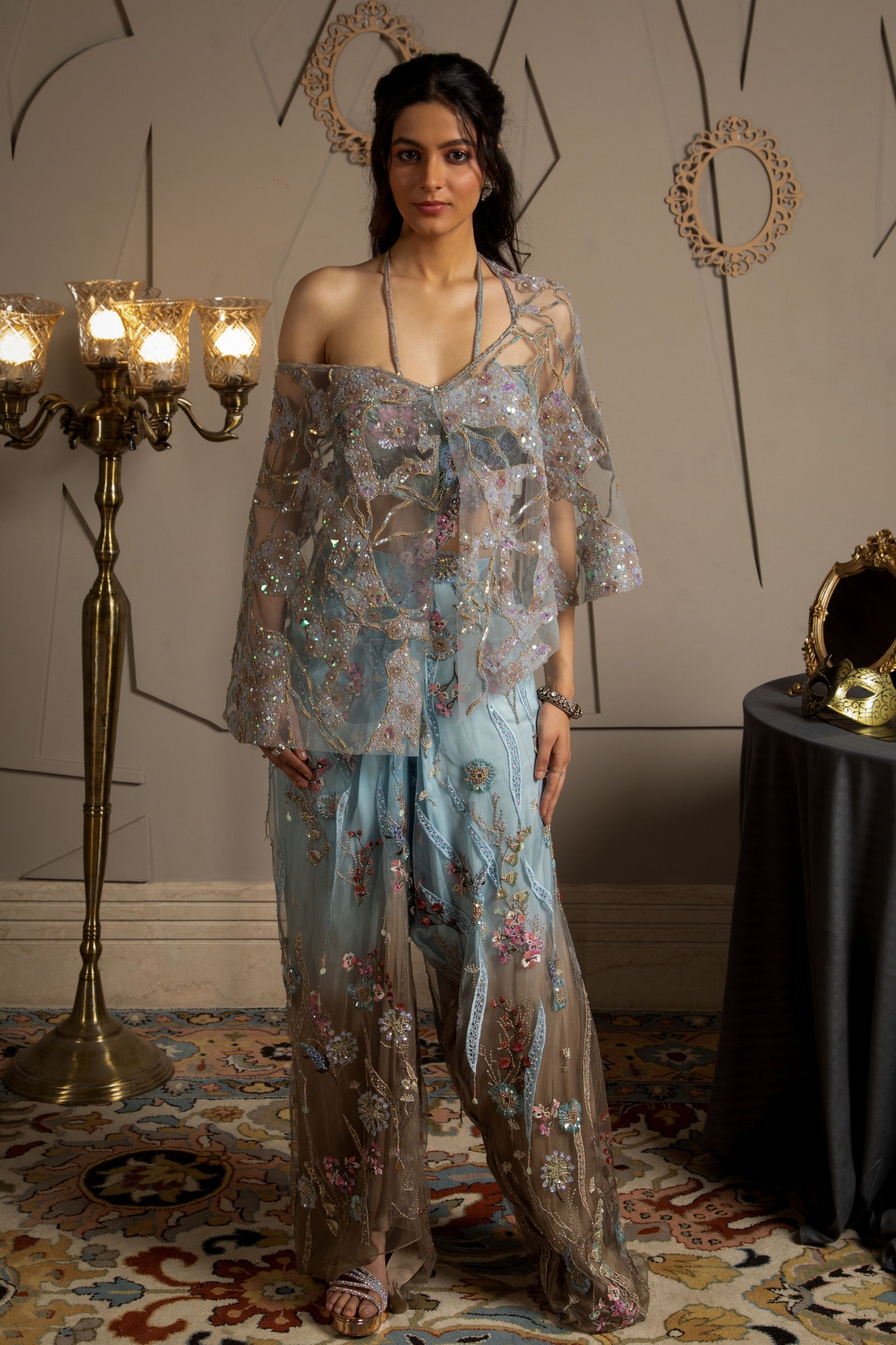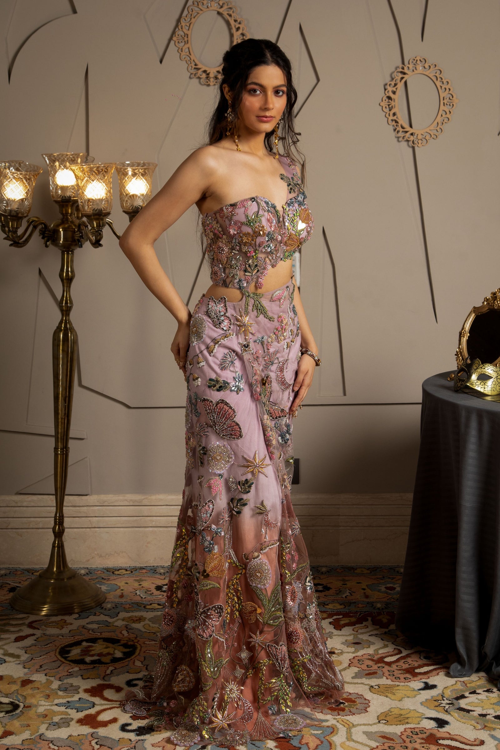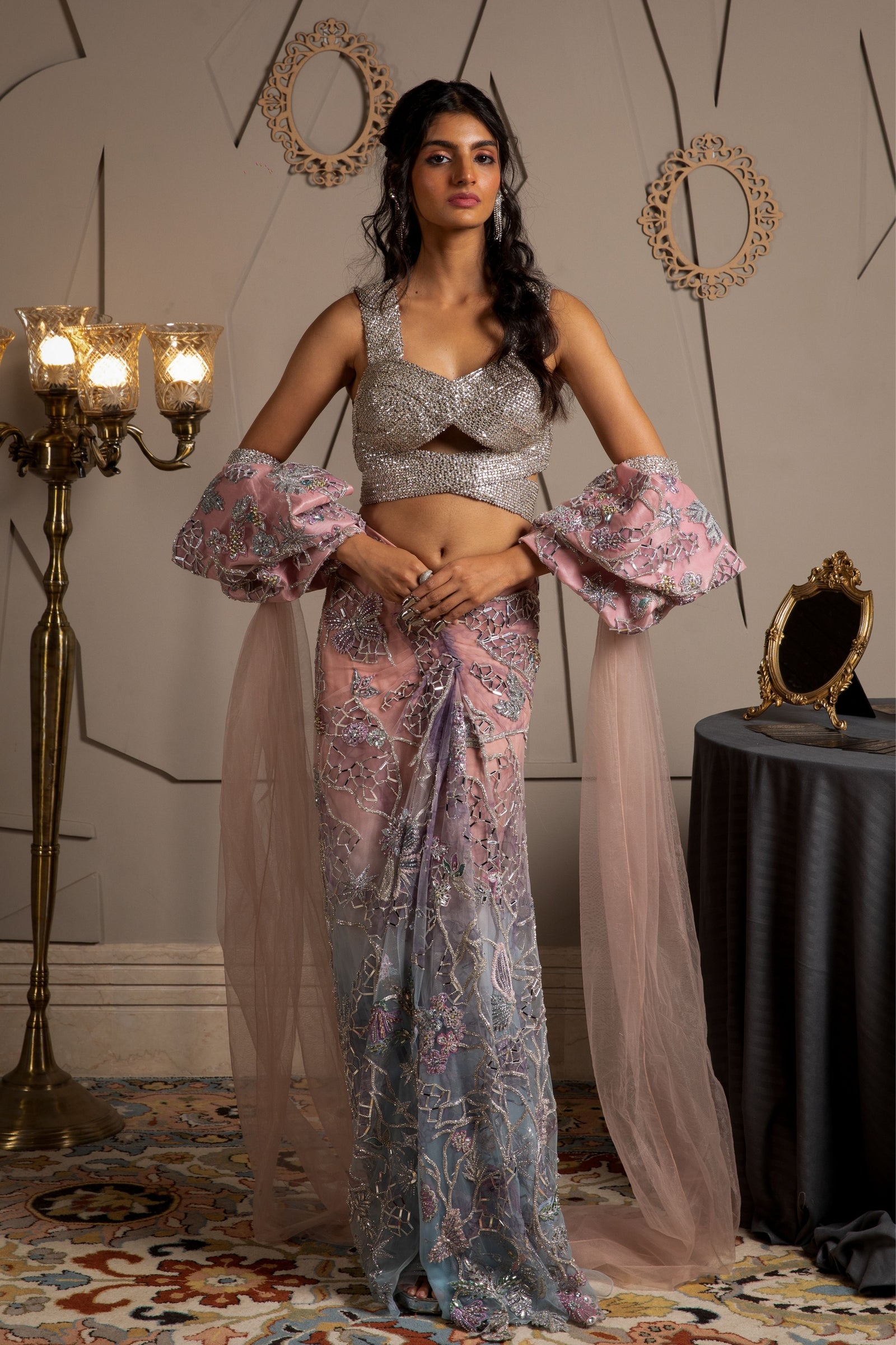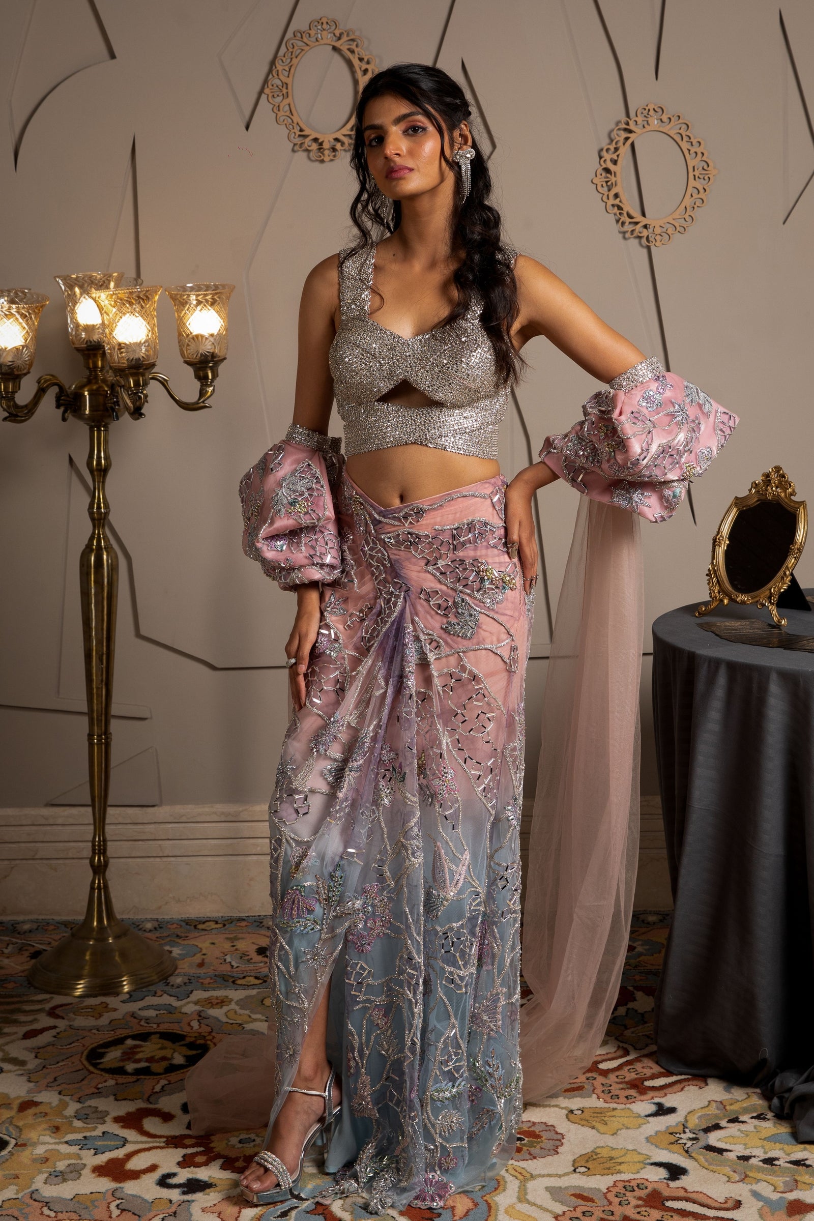• Skye features dreamy signature butterfly-shaped blouse lehenga, designed to make every moment magical. The attached pallu, finished with delicate danglers at the edge, completes this captivating ensemble, blending celestial wonder with timeless elegance. Zip on the back centre side of the lehenga skirt. Flowy translucent butterfly net dupatta with scattered soft silver sequins. Floral strap blouse adorned with floral motifs with back knot closure.