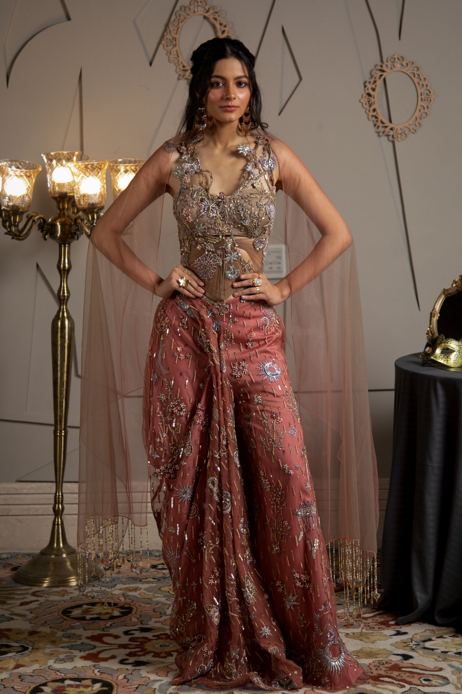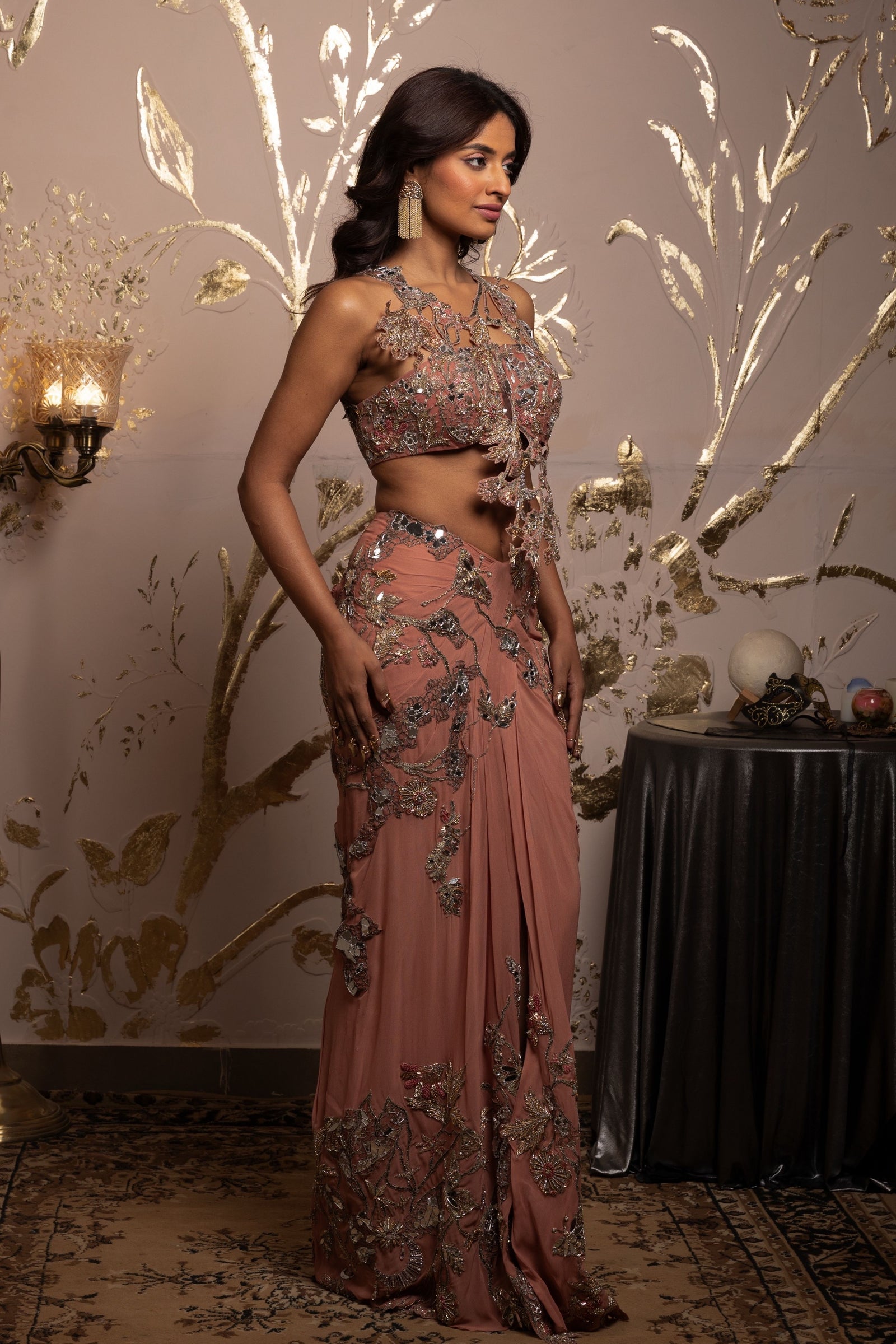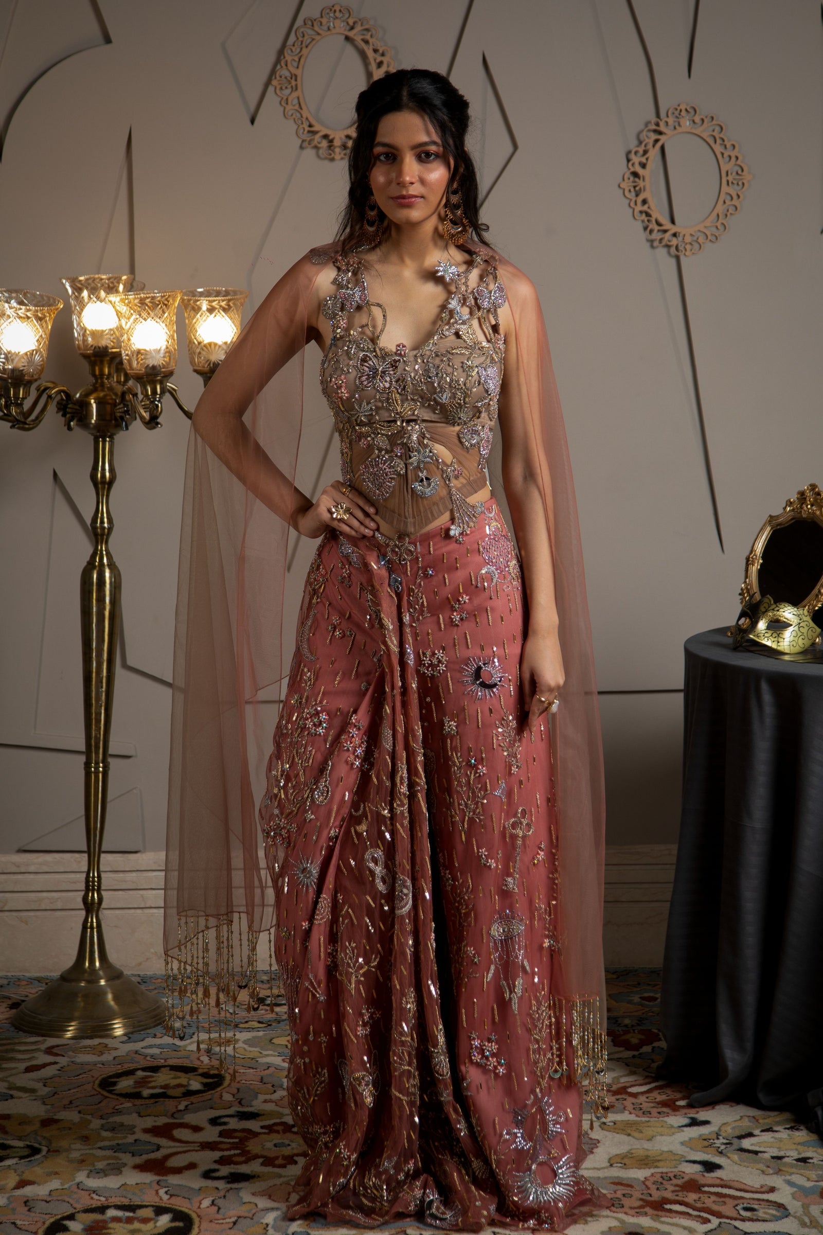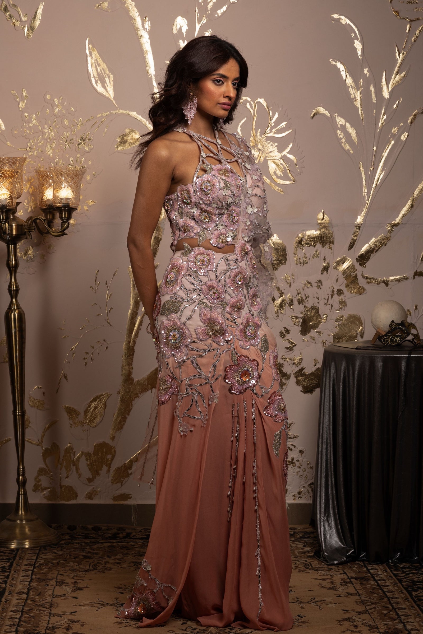 • Skye features dreamy signature butterfly-shaped blouse lehenga, designed to make every moment magical. The attached pallu, finished with delicate danglers at the edge, completes this captivating ensemble, blending celestial wonder with timeless elegance. Zip on the back centre side of the lehenga skirt. Flowy translucent butterfly net dupatta with scattered soft silver sequins. Floral strap blouse adorned with floral motifs with back knot closure.