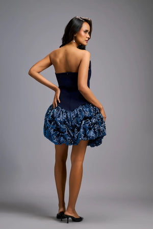 • A strapless navy blue knee length dress with a structured bodice and voluminous ruched shimmer embroidered bottom