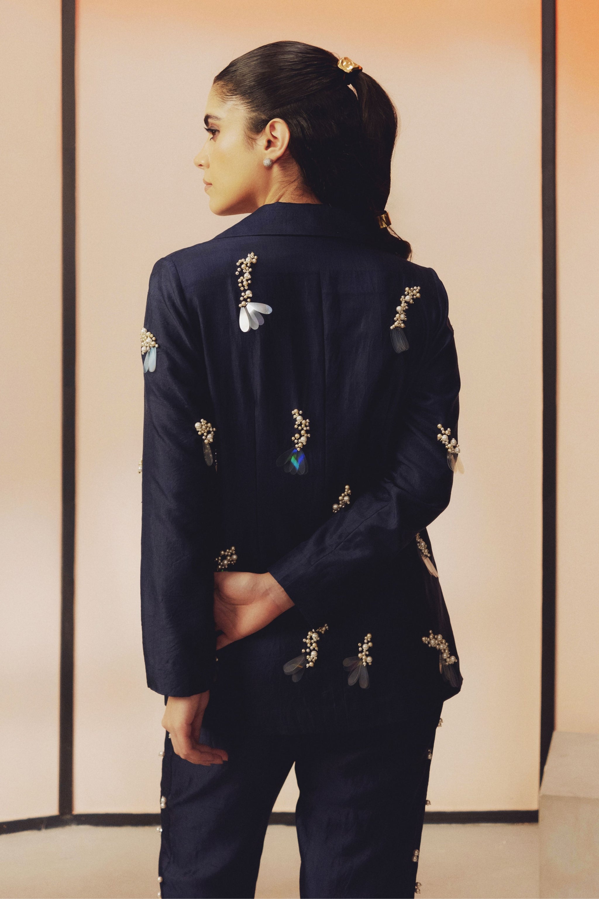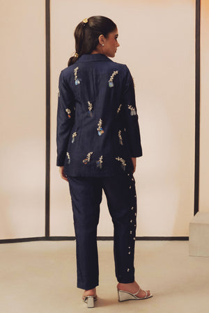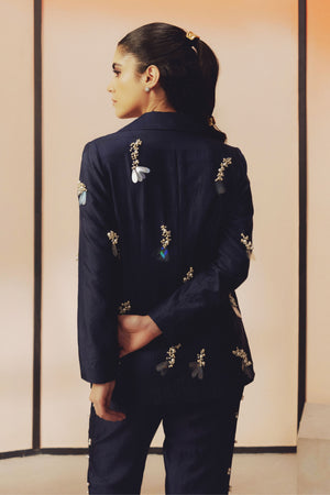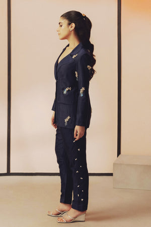 • This handwoven mulberry silk blazer set features hand embroidered pearl and sequin work. Designed in a classic easy fit silhouette, the blazer is paired with narrow, ankle length pants featuring pockets on both the sides.