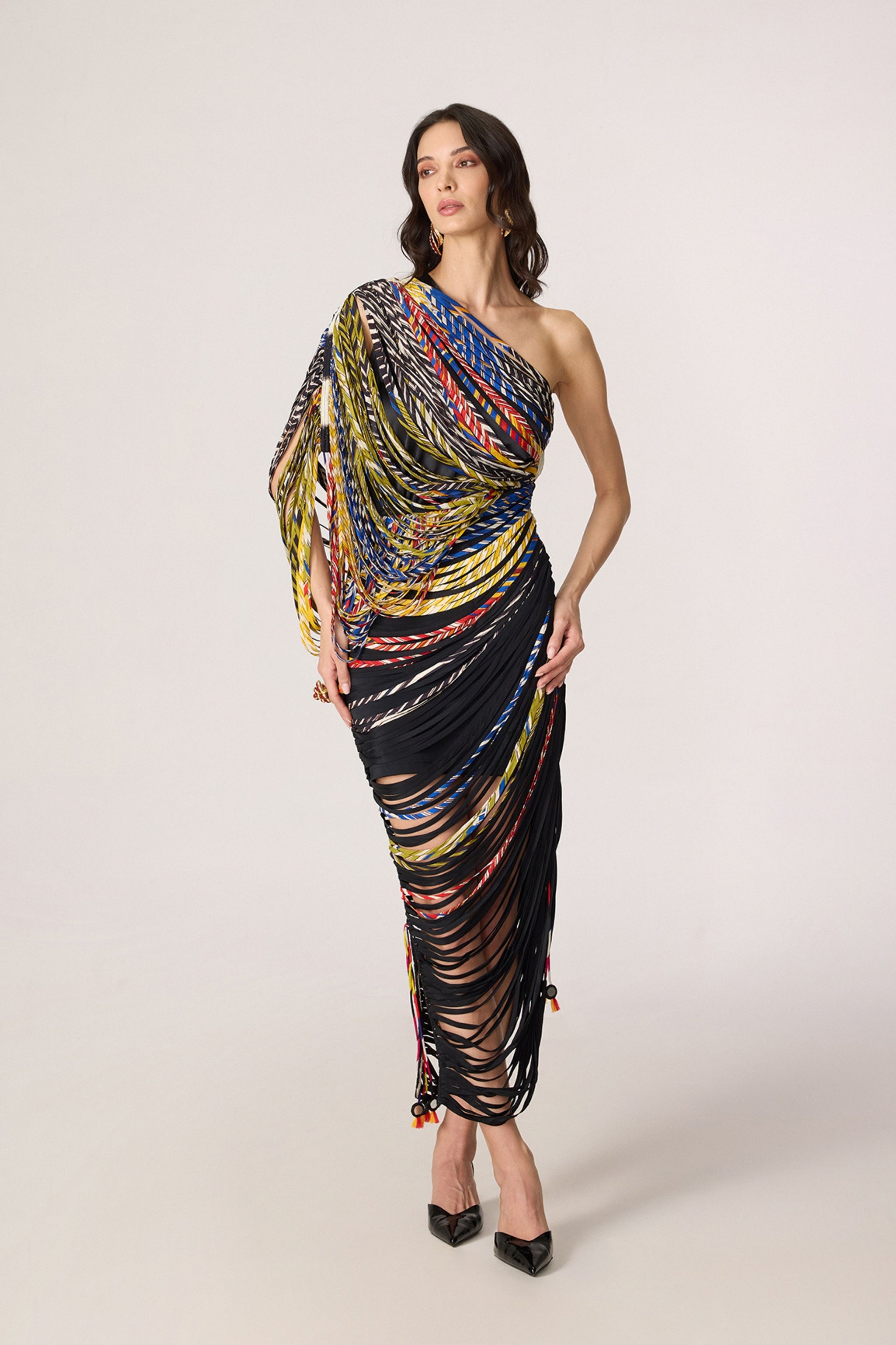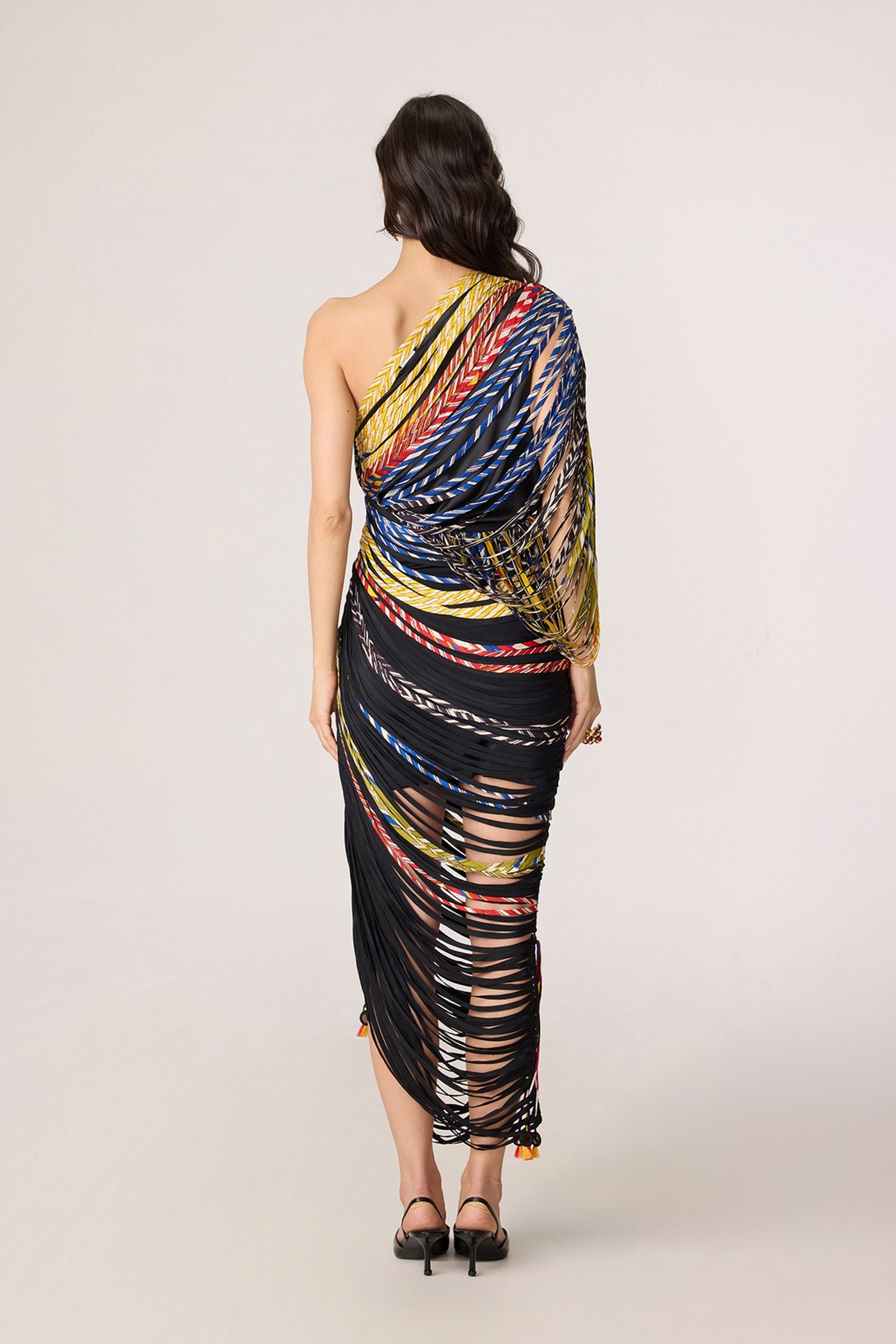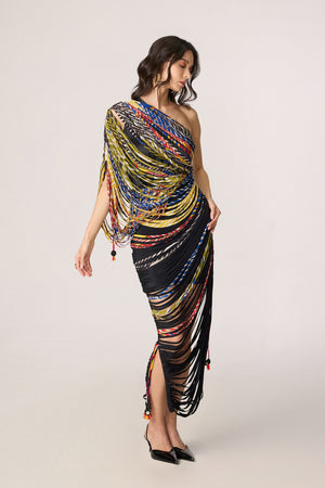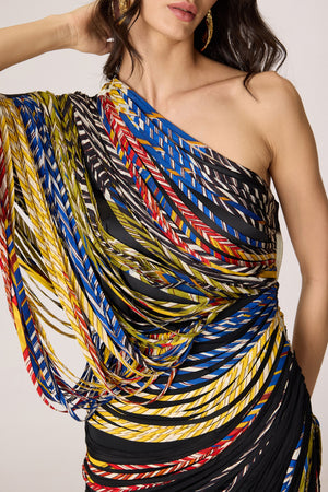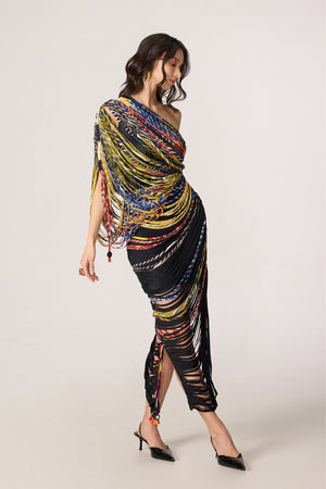 • Multi stripe print fabric tassel one shoulder sari inspired dress with adjustable hand embroidered mirror and tassel drawstring sleeve and length