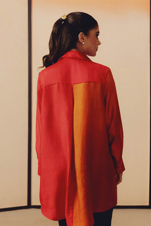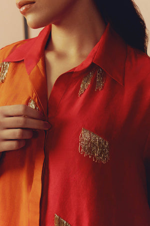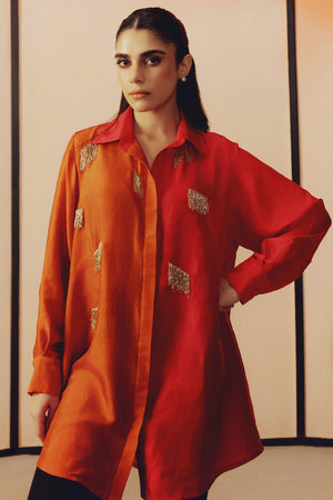 • Crafted in handwoven mulberry silk, this dual tone shirt features contrasting hues of rust and cherry red. Adorned with glass beadwork and is designed in classic batwing fit silhouette.