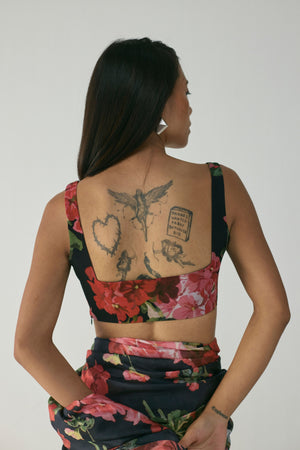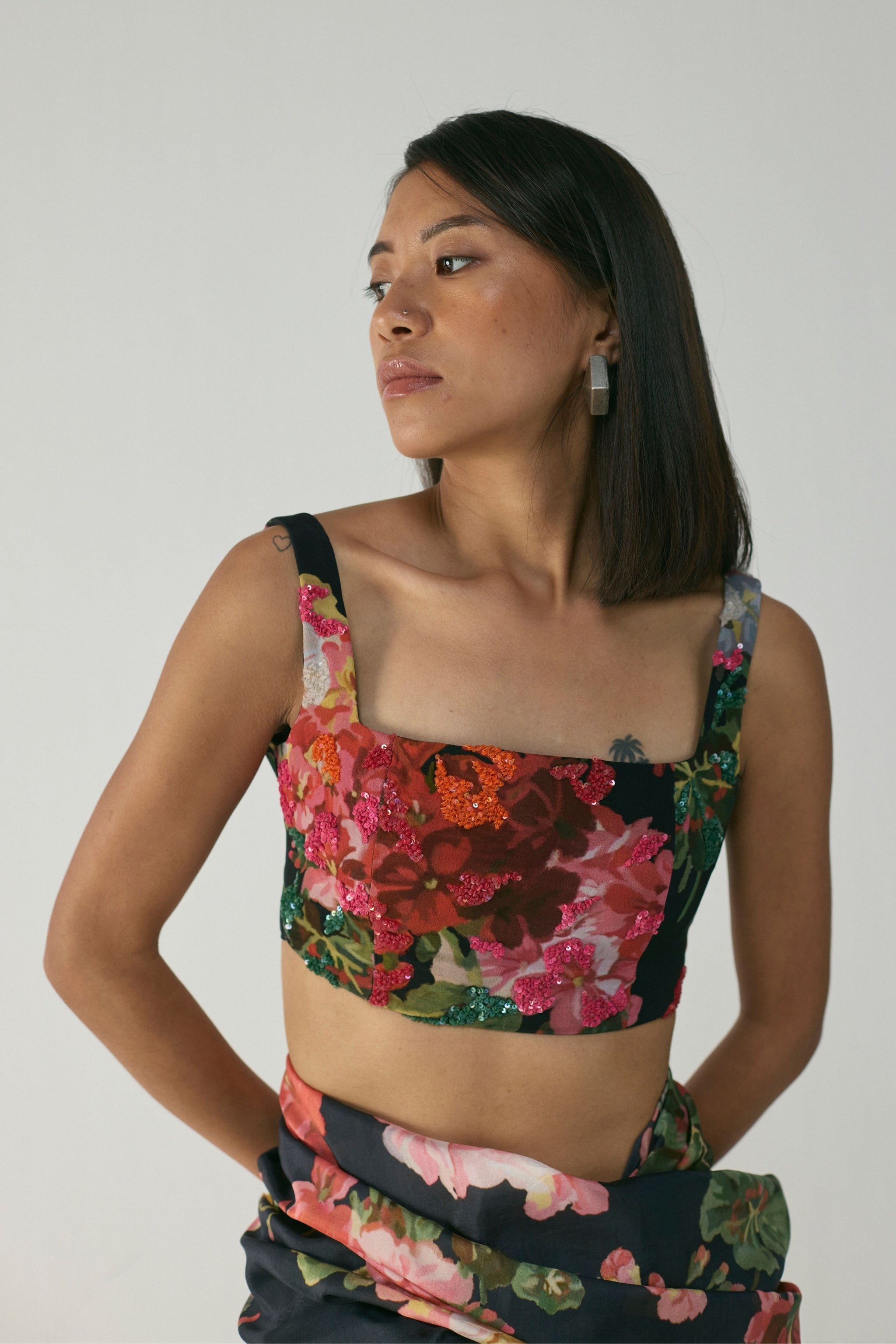 • A striking cropped blouse featuring a bold multicolor floral print with intricate sequin embroidery. The design showcases a structured square neckline and wide shoulder straps for a balanced, modern silhouette. The surface is richly detailed with hand-embellished sequins in shades of pink, red, green, and orange, adding depth and luxe texture to the floral pattern. At the back, the blouse continues the square-neck frame, offering a clean, open look that highlights the back while maintaining structure. The blouse appears to close with a concealed side or back fastening for a seamless finish.
