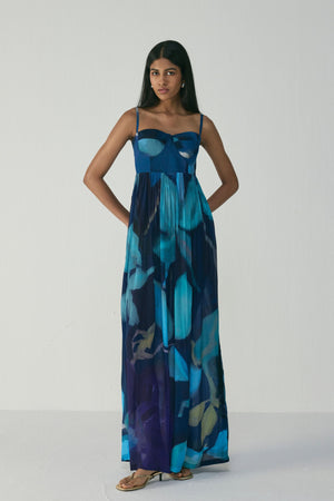 • The dress is a perfect harmony of structure and fluidity, designed for the modern muse who embraces effortless elegance. Crafted in a soft, airy crepe, this dress showcases a mesmerizing hand-painted-inspired digital print in oceanic tones of cobalt, azure, and deep navy with hints of violet. The fitted bustier bodice, featuring delicate spaghetti straps and defined cups, offers a flattering, sculpted silhouette that transitions seamlessly into a flowy, pleated skirt. A subtle side slit adds ease and sensuality, making it ideal for movement and grace.