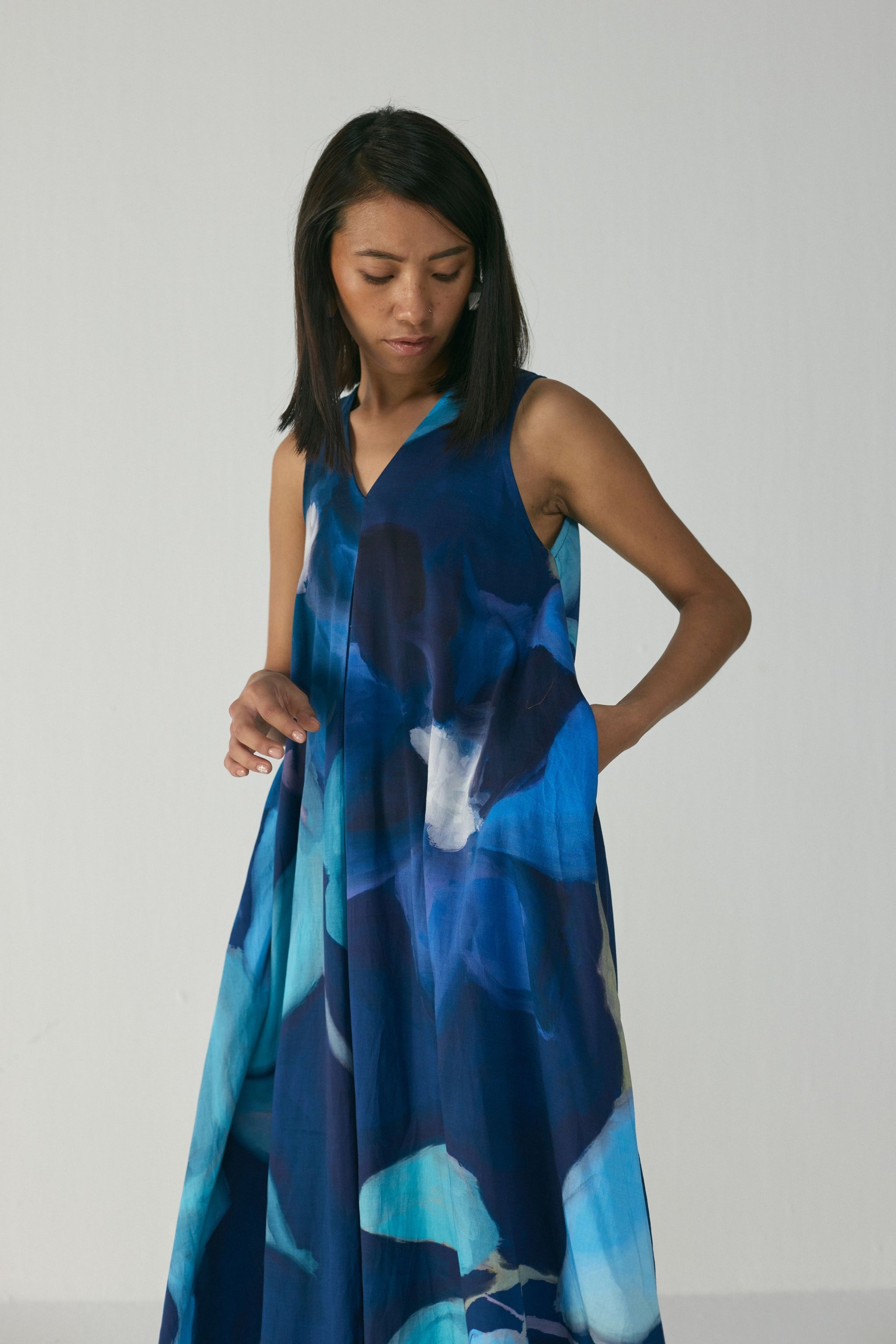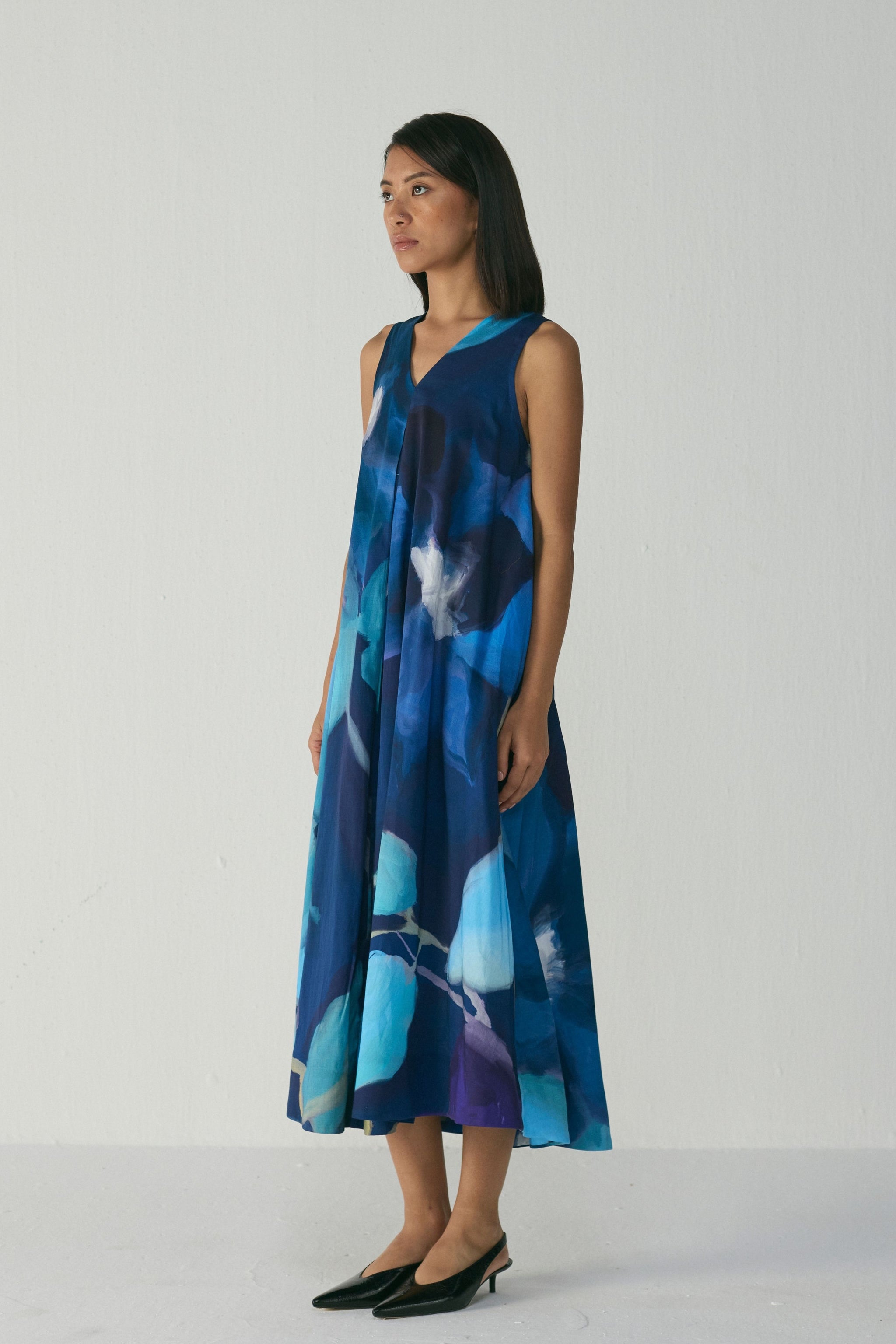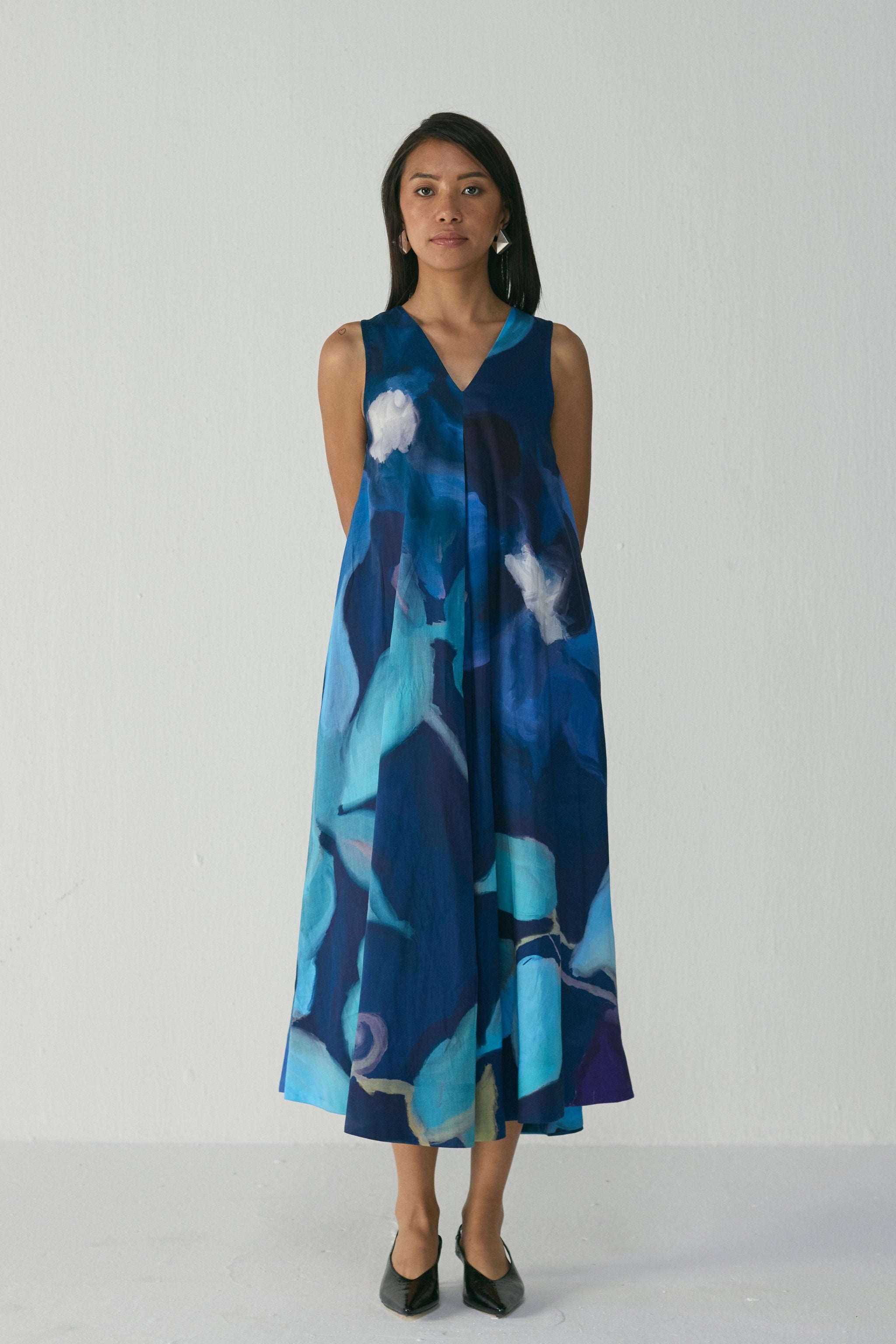 • The v neck sleeveless dress embodies understated elegance and artistic charm through its fluid silhouette and hand-painted-inspired print. Crafted in a lightweight, breathable fabric, the dress features a relaxed a-line form that falls gracefully to a mid-calf length, offering effortless movement and comfort. Designed with a flattering v-neckline and soft pleat detailing at the front, it combines modern simplicity with artistic sophistication, ideal for both casual daytime wear and elegant evening outings.