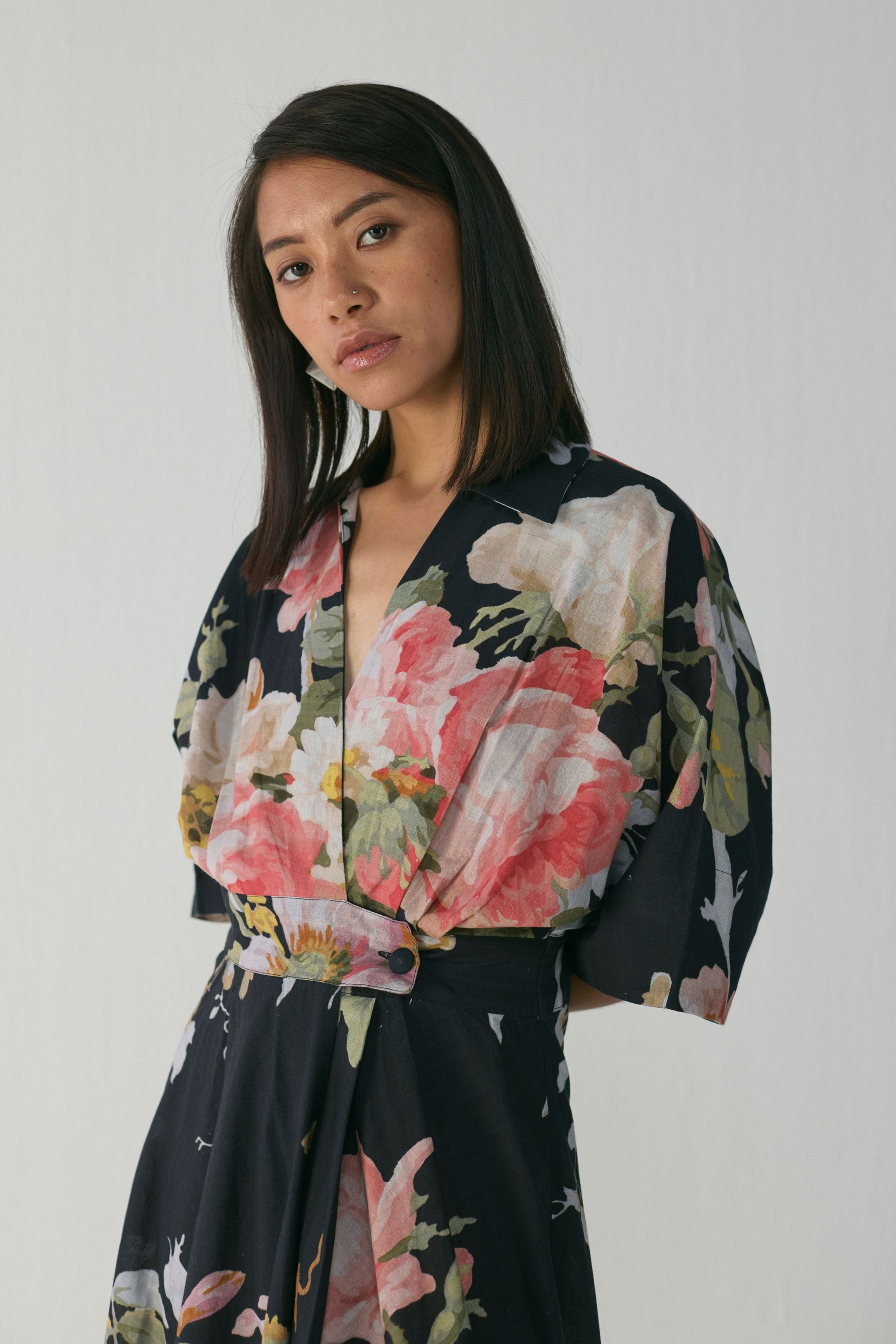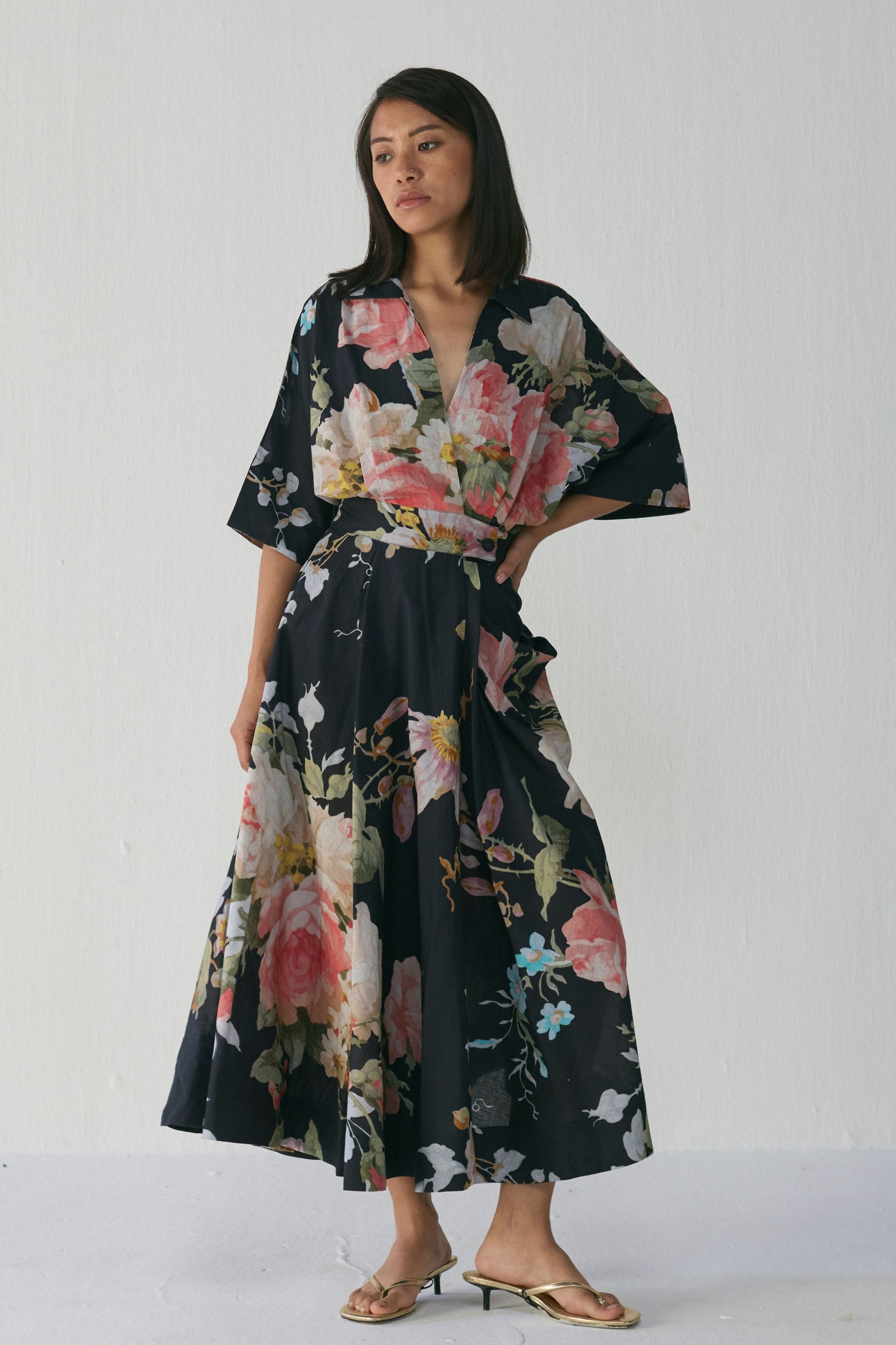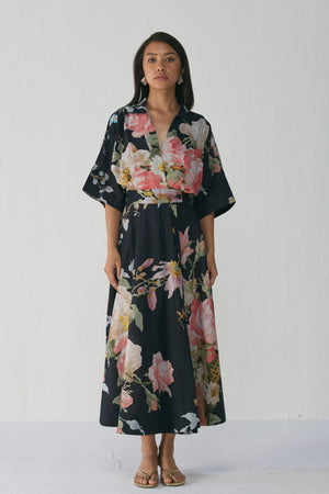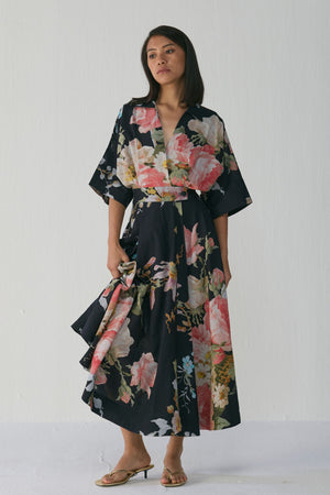 • The dress features a striking large-scale painterly floral print set against a deep black base. Blooming roses and delicate foliage in shades of blush pink, ivory, sage green, and powder blue create a bold yet romantic visual impact. The print has a hand-painted, watercolour-like aesthetic, adding artistic depth and a premium finish to the overall look.Step into effortless elegance with this flowy floral dress, crafted to bring together comfort, sophistication, and timeless charm. Dress length - 50" neck depth - 8''