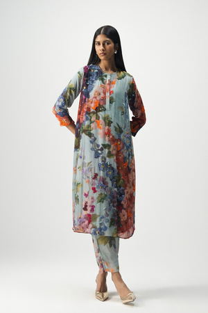 • The kurta set captures the essence of effortless elegance with its painterly floral design and fluid silhouette. Crafted from the lightweight crepe, fabric this set features a knee-length kurta adorned with vibrant, hand-painted-inspired florals in shades of coral, lilac, sapphire, and green — evoking the serenity of a blooming meadow. The kurta is paired with coordinated straight-cut pants, mirroring the delicate print for a cohesive and contemporary look. The relaxed yet refined silhouette ensures both comfort and sophistication, making it perfect for daytime celebrations or festive gatherings.