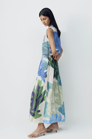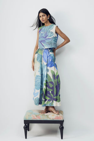 • The outfit showcases a vibrant botanical print in soothing shades of blue, green, lilac, and teal. Oversized painterly leaves and abstract floral forms create a hand-illustrated effect, giving the print an organic, airy character. Its watercolor-like blend of tones adds depth and dimension, making the piece visually striking yet harmonious. Elevate your warm-weather wardrobe with this beautifully crafted sleeveless dress featuring an artistic, nature-inspired print. Designed with a relaxed yet refined silhouette, the dress flows gracefully with every step, offering an effortless blend of comfort and sophistication. Perfect for daytime outings, vacation wear, or relaxed evening gatherings, this piece brings a fresh and serene aesthetic to your style. "Top length -17'' skirt length - 37''"