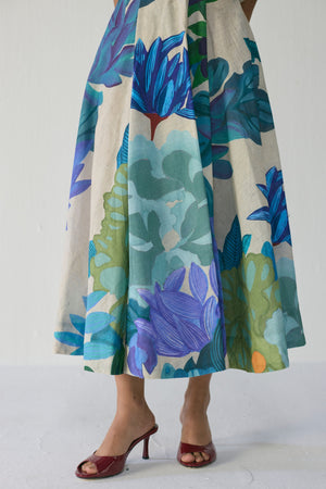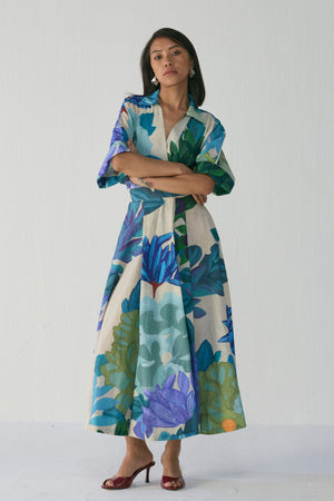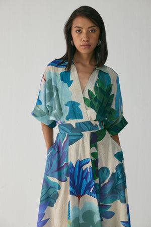• This statement dress features an artistic botanical print inspired by lush tropical foliage in striking shades of teal, cobalt, emerald, and violet. Set against a soft natural beige base, the oversized leaf motifs create a painterly, hand-brushed effect that feels both modern and organic. The fluid print placement highlights movement through the garment, offering a beautifully immersive, nature-driven aesthetic. Crafted in a breathable, textured fabric, the dress is designed with a relaxed yet refined silhouette. The v-neckline, structured collar, and wide kimono-style sleeves bring an effortless elegance, while the cinched waist with a matching belt adds definition. The flared midi skirt enhances flow and ease, making it ideal for day events, vacations, brunches, and elevated casual outings. "Dress length - 50"" neck depth - 8''"