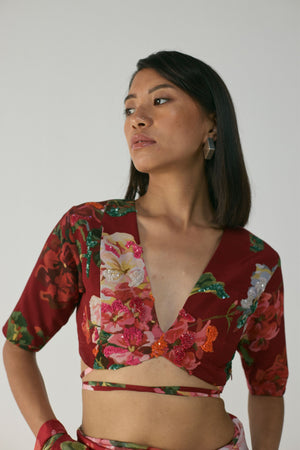 • This stunning blouse features a rich, deep red base adorned with an artistic floral print inspired by lush garden blooms. The print brings together layered petals, soft gradients, and painterly strokes in shades of pink, green, white, and coral—creating a romantic yet contemporary visual appeal. The blouse showcases a bold plunging neckline highlighted with intricate hand-embroidered sequins that add dimension and a subtle sparkle. Delicate wrap-around tie details at the waist add a touch of modern sensuality, and giving a refined, statement-making look. "Neck depth - 11"" sleeve length - 11"" blouse length - 13.5"