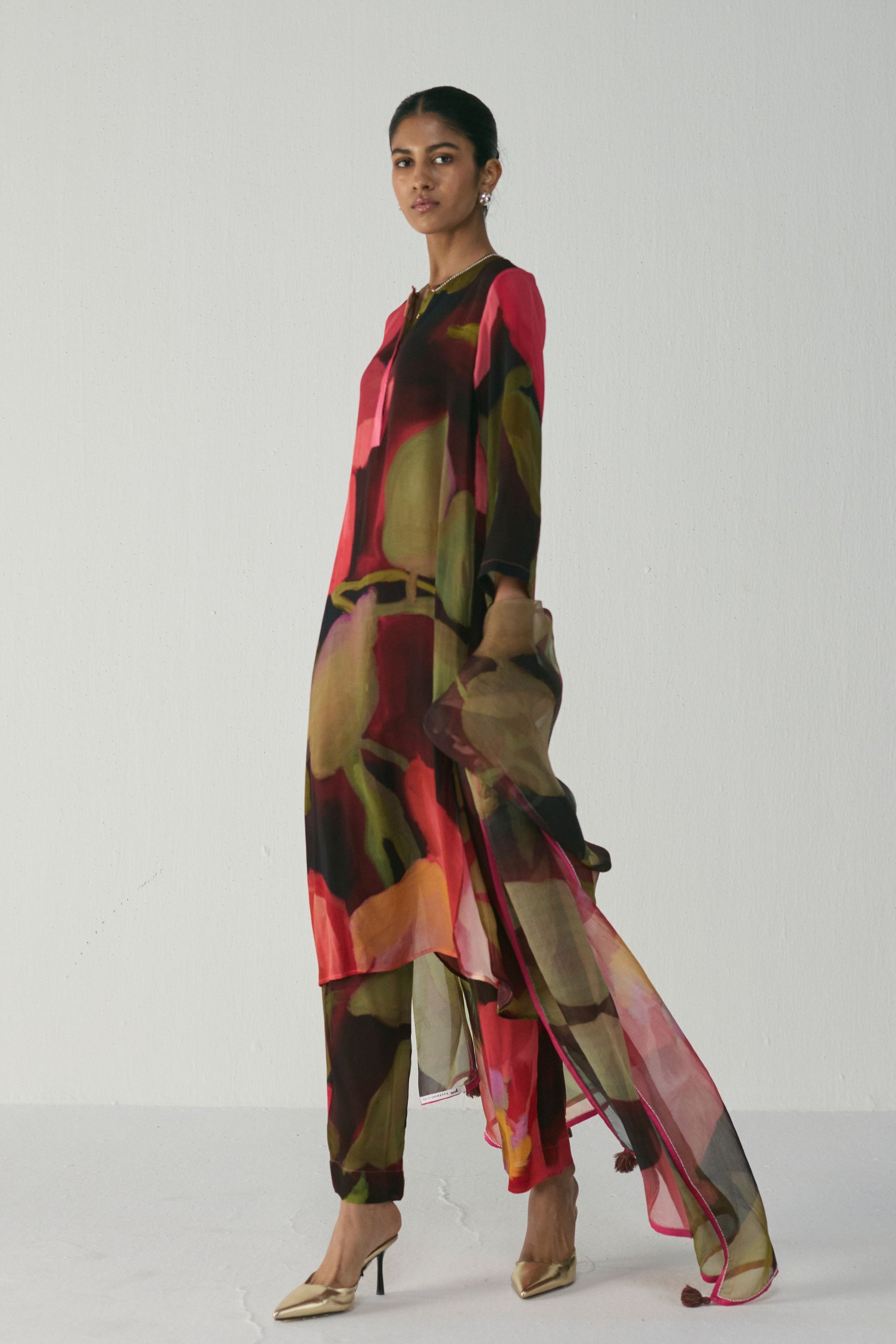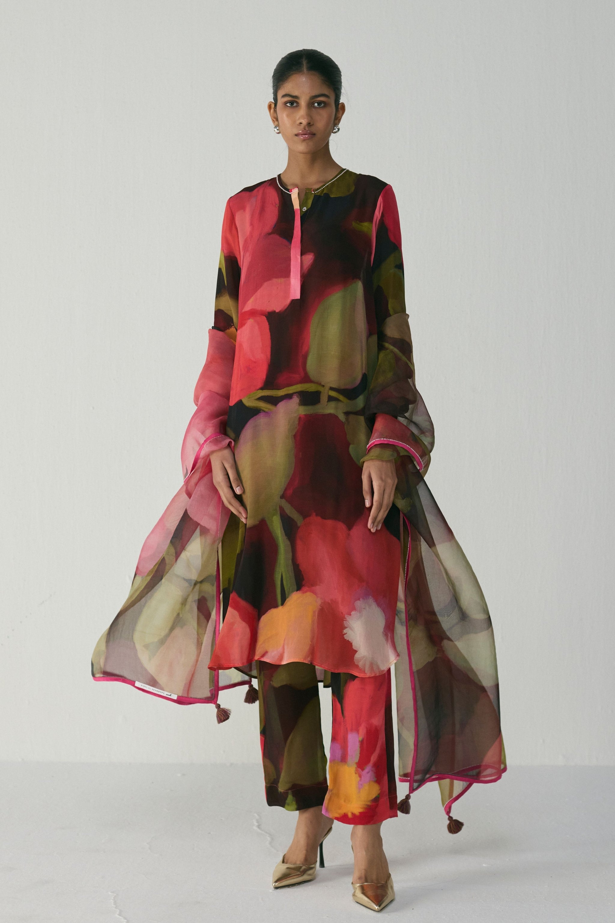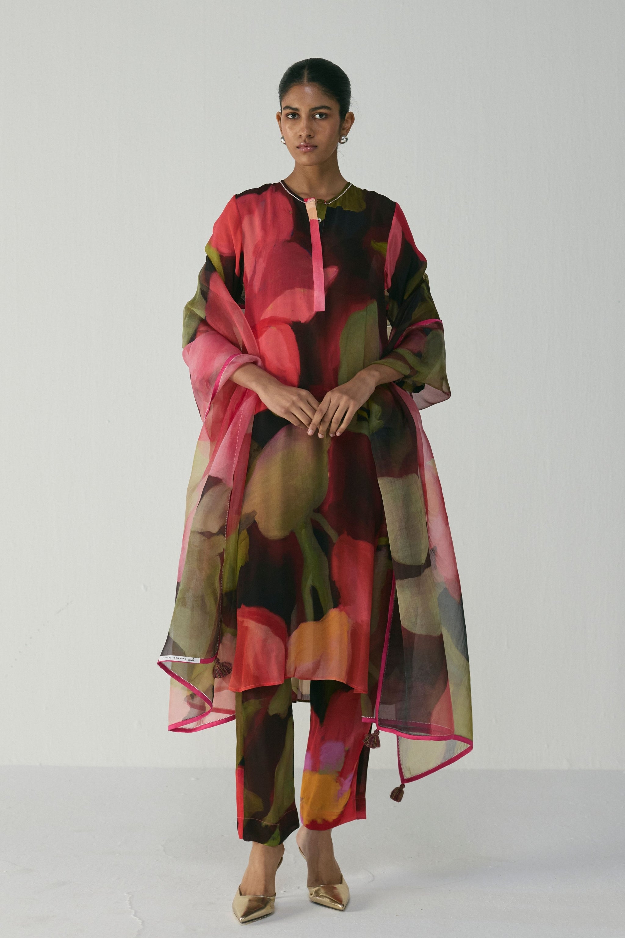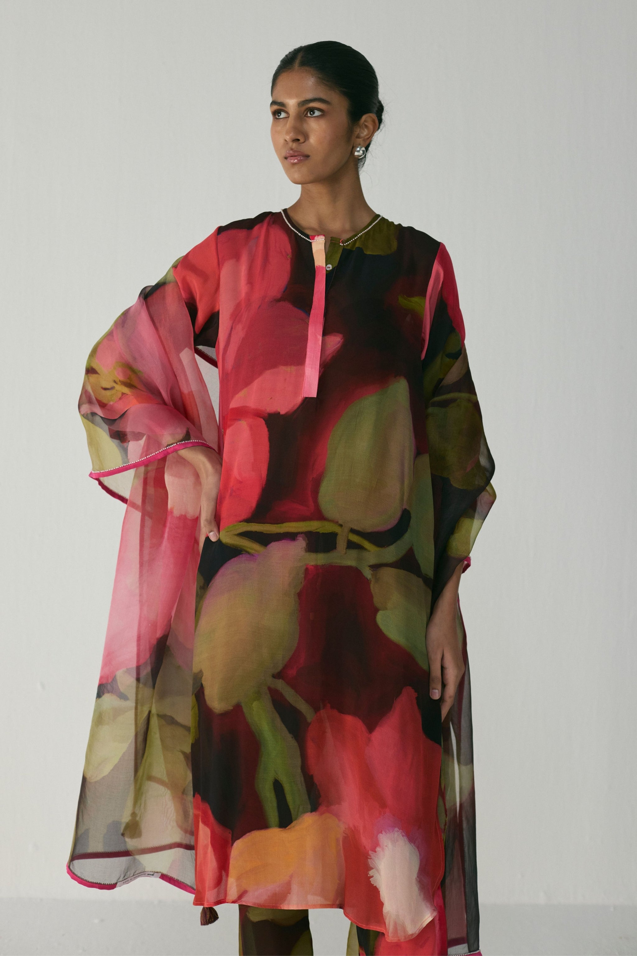 • A vibrant, painterly print blending deep reds, fuchsias, lush greens, and soft purples. The pattern resembles abstract floral strokes, creating a dynamic, artistic effect with depth and movement. The colors transition beautifully, giving the pleated fabric dimension and a fluid, almost watercolor-like feel. Bold yet elegant, the print evokes the richness of a blooming garden at sunset. Crafted from lightweight, sheer organza, the dupatta drapes gracefully, adding an ethereal touch to your look. Its fluid texture and subtle sheen create a luxurious appeal, perfect for both daytime elegance and evening sophistication.Dupatta - 2.5 Mtr