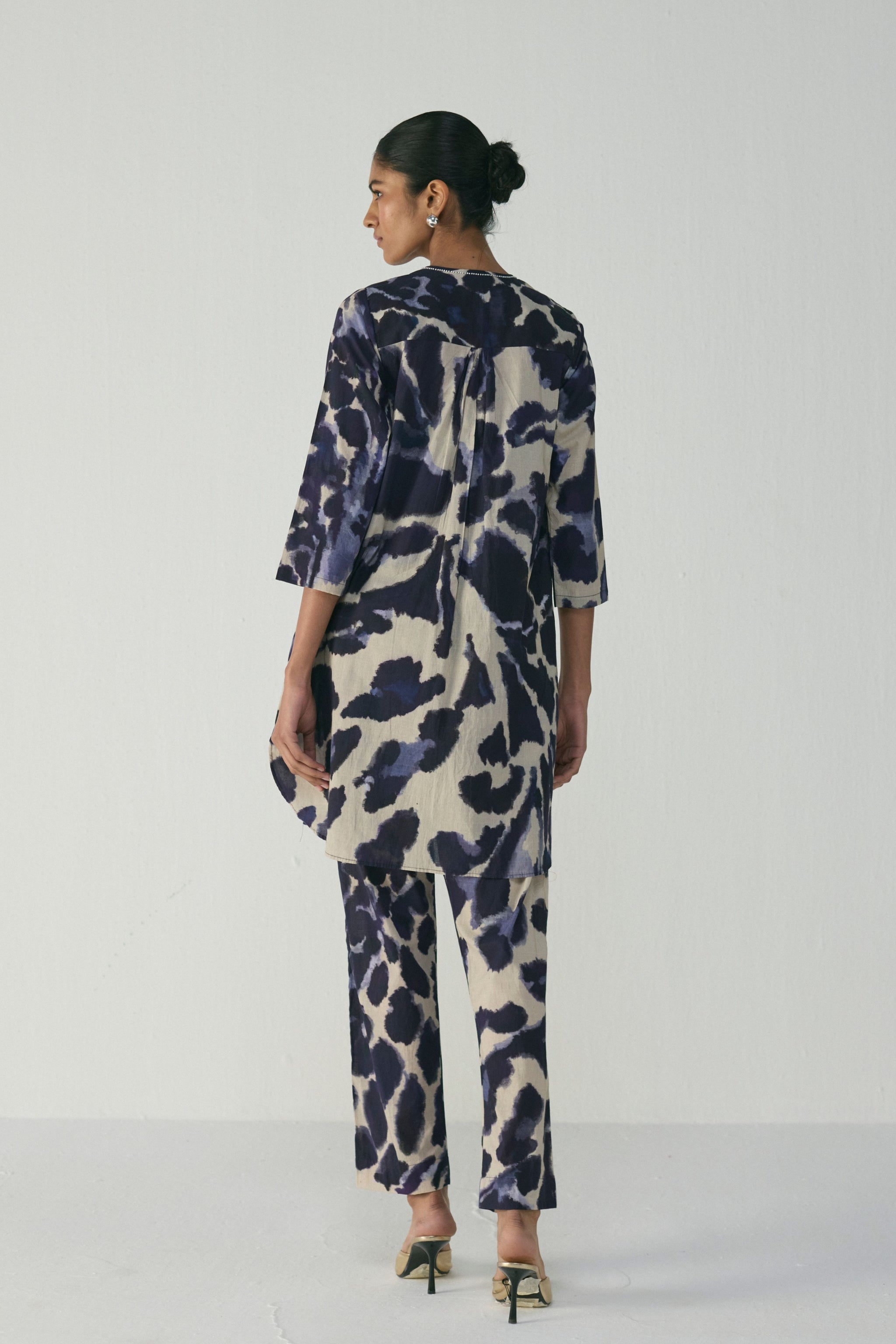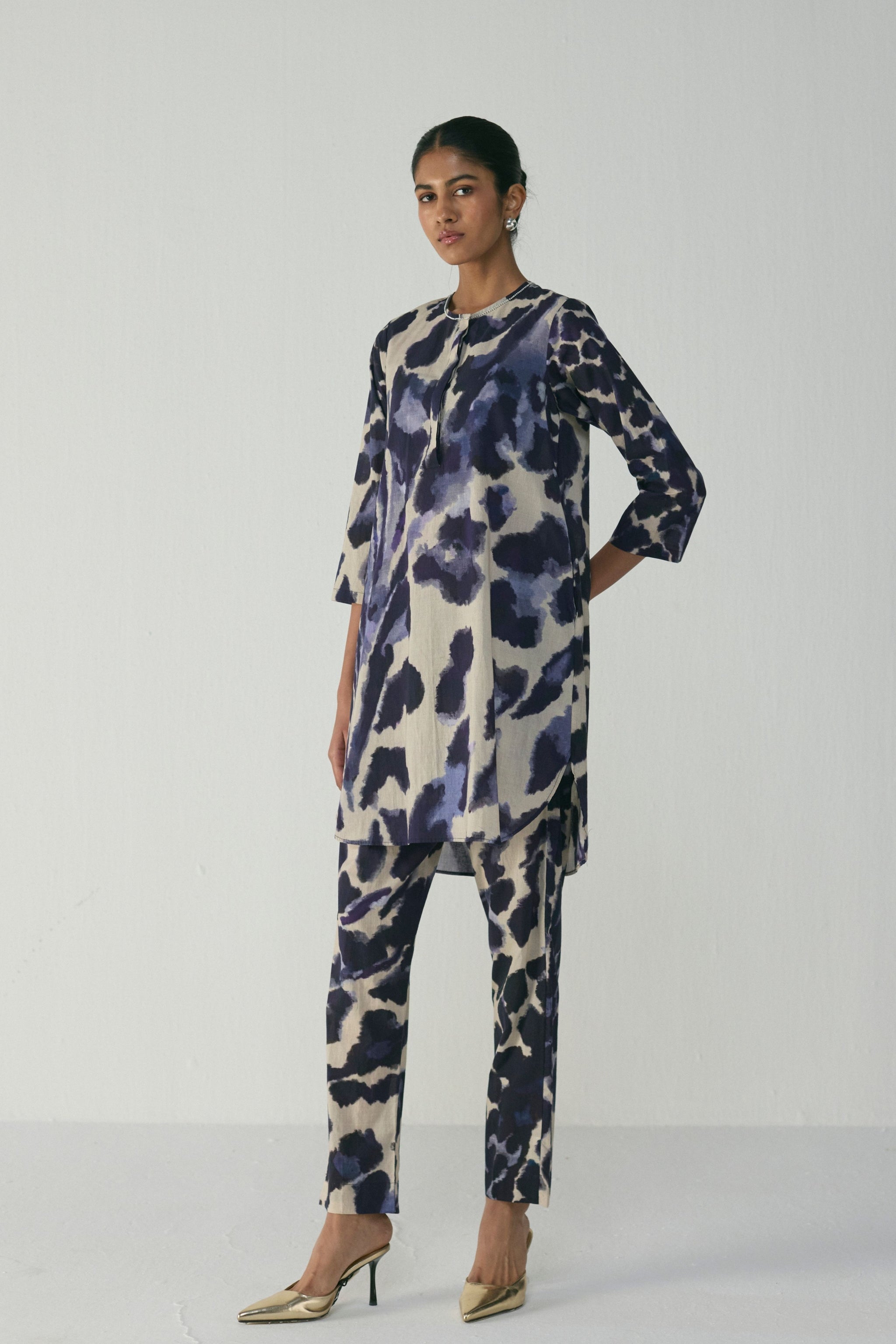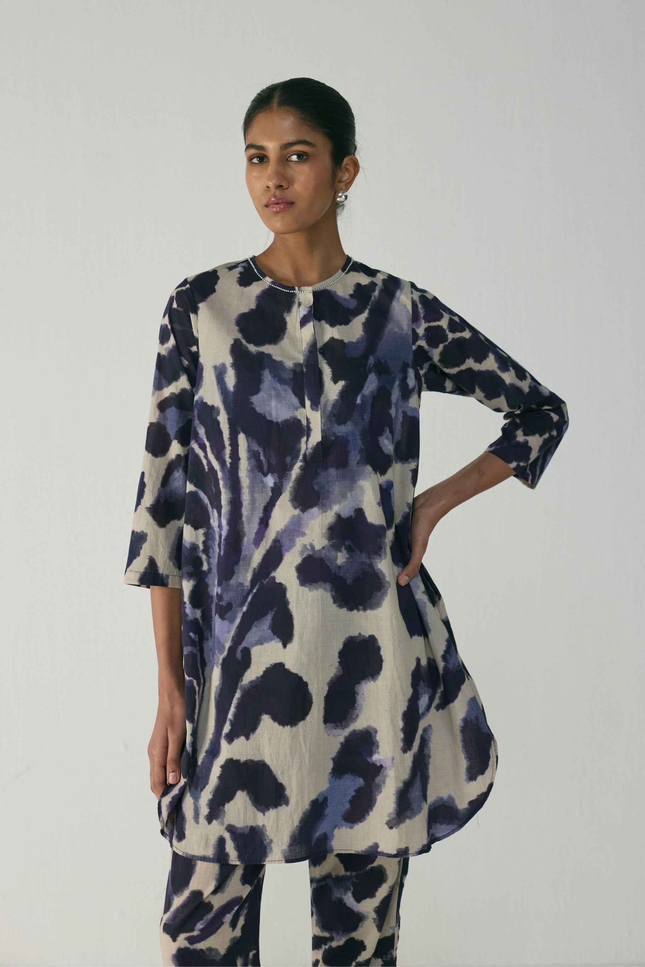 • This indigo abstract cotton kurta set is designed for comfort and versatility. Crafted in soft, breathable cotton, the set features a relaxed straight-cut kurta paired with matching trousers — both adorned with a painterly abstract print in deep indigo and ivory tones. The kurta is designed with a clean round neckline, three-quarter sleeves, and discreet side pockets for functional ease. Coordinating straight pants, also with pockets, complete the look with a tailored yet relaxed fit — making it a perfect ensemble for day-to-evening dressing.