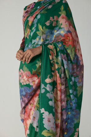 • This exquisite saree is crafted in luxurious silk, featuring a lush painterly floral print in vibrant hues of green, pink, lilac, and amber. The print evokes a sense of romantic nostalgia, seamlessly blending nature-inspired artistry with contemporary elegance. The saree is finished with sleek satin piping along the edges, lending it a refined, polished look that enhances its drape and flow. Lightweight yet rich in texture, this saree is perfect for both festive occasions and elegant evening events.