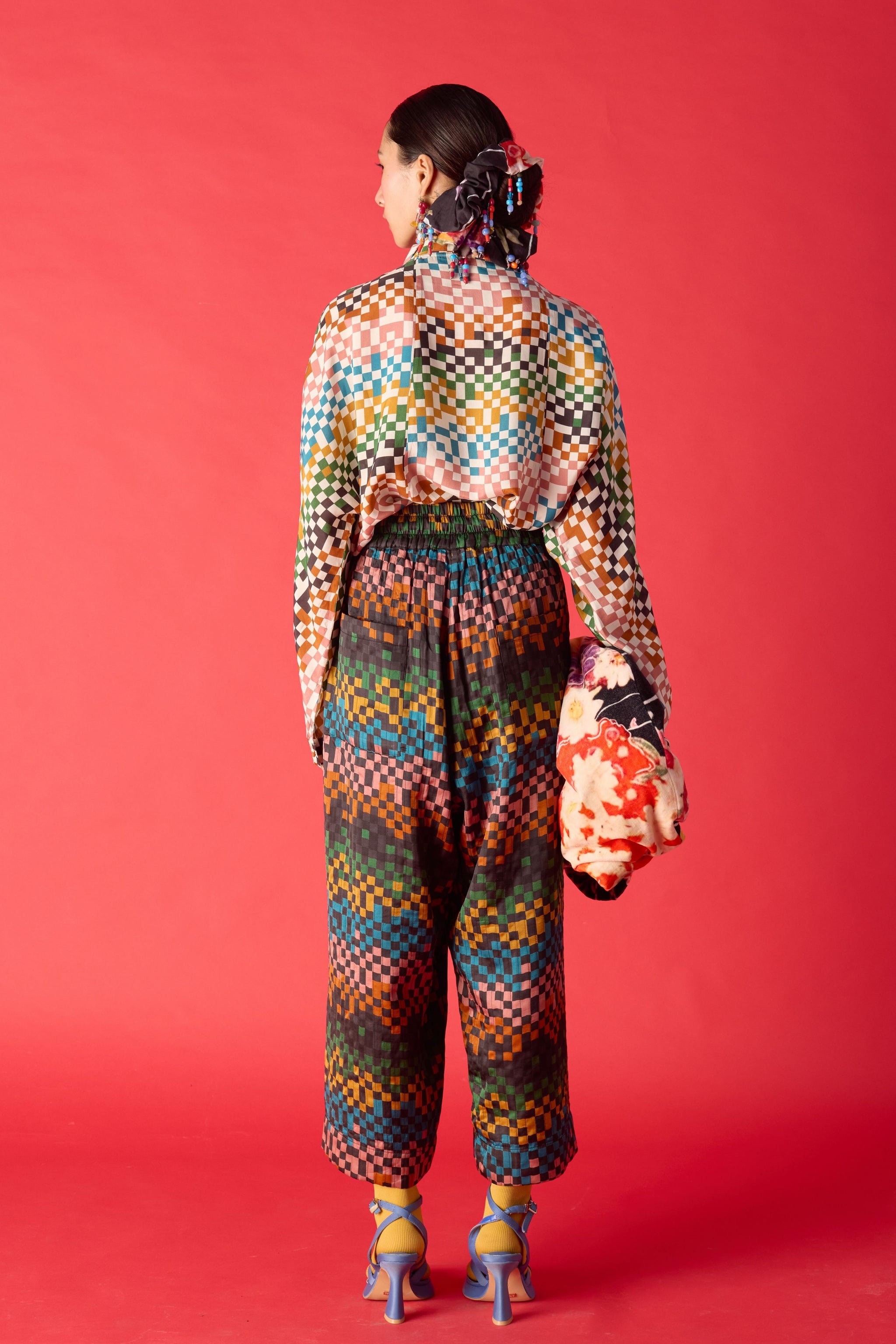 • Pixel story quilted pants with wide elaticated waist and side pockets in cupro. Please note:- each piece may have slight variation in print placement due to the nature of the fabric. The print placement will not be exactly the same as shown in the image.