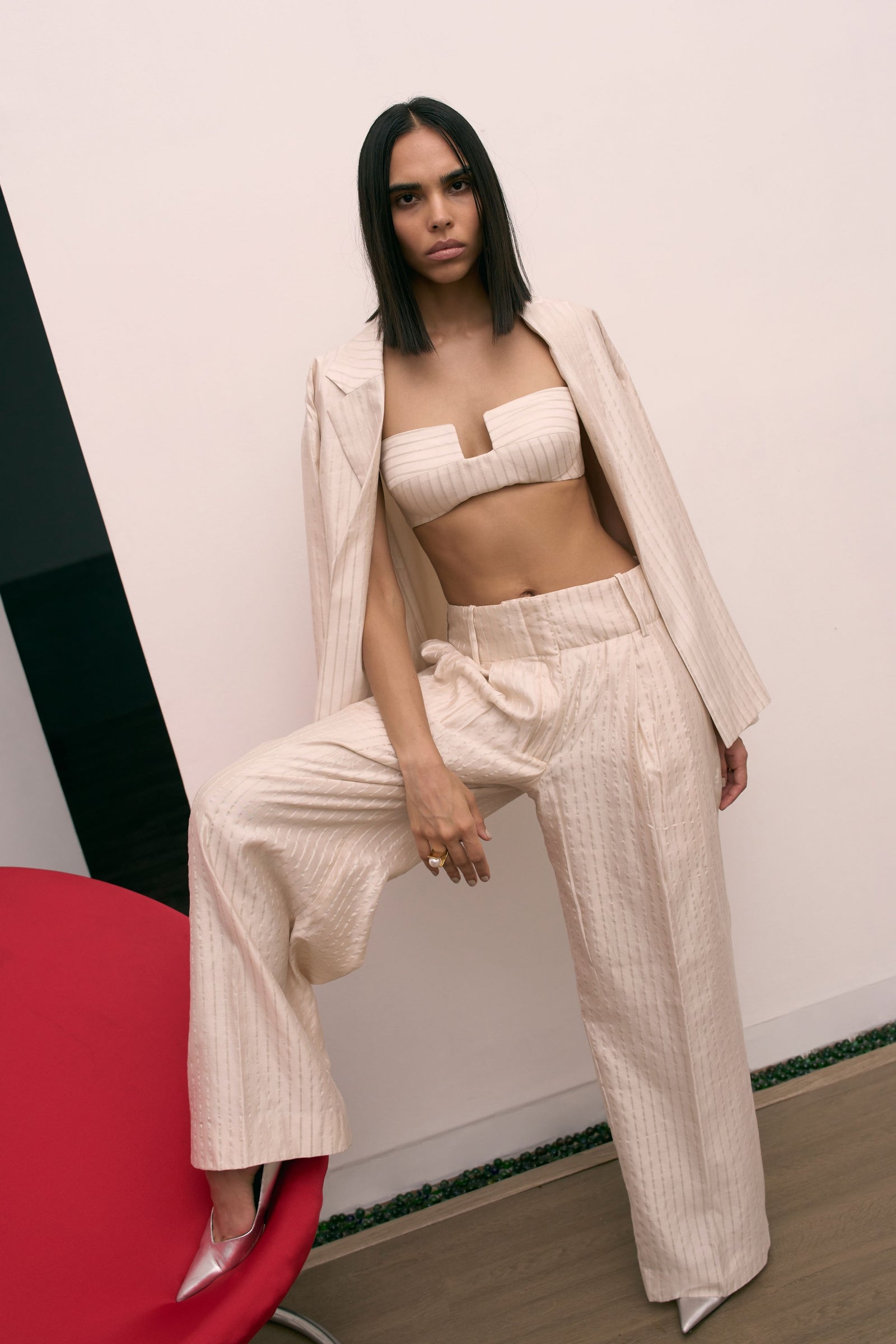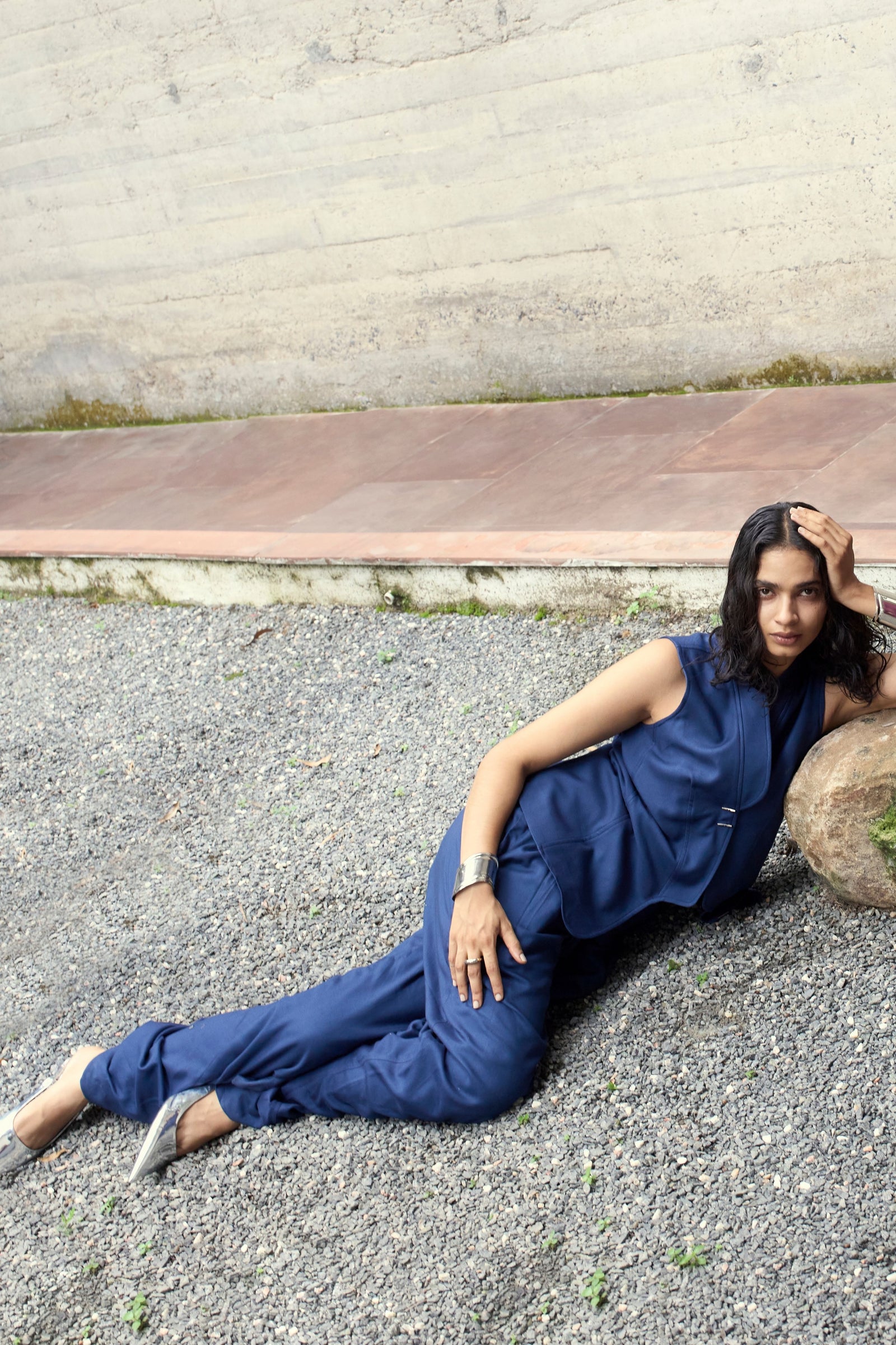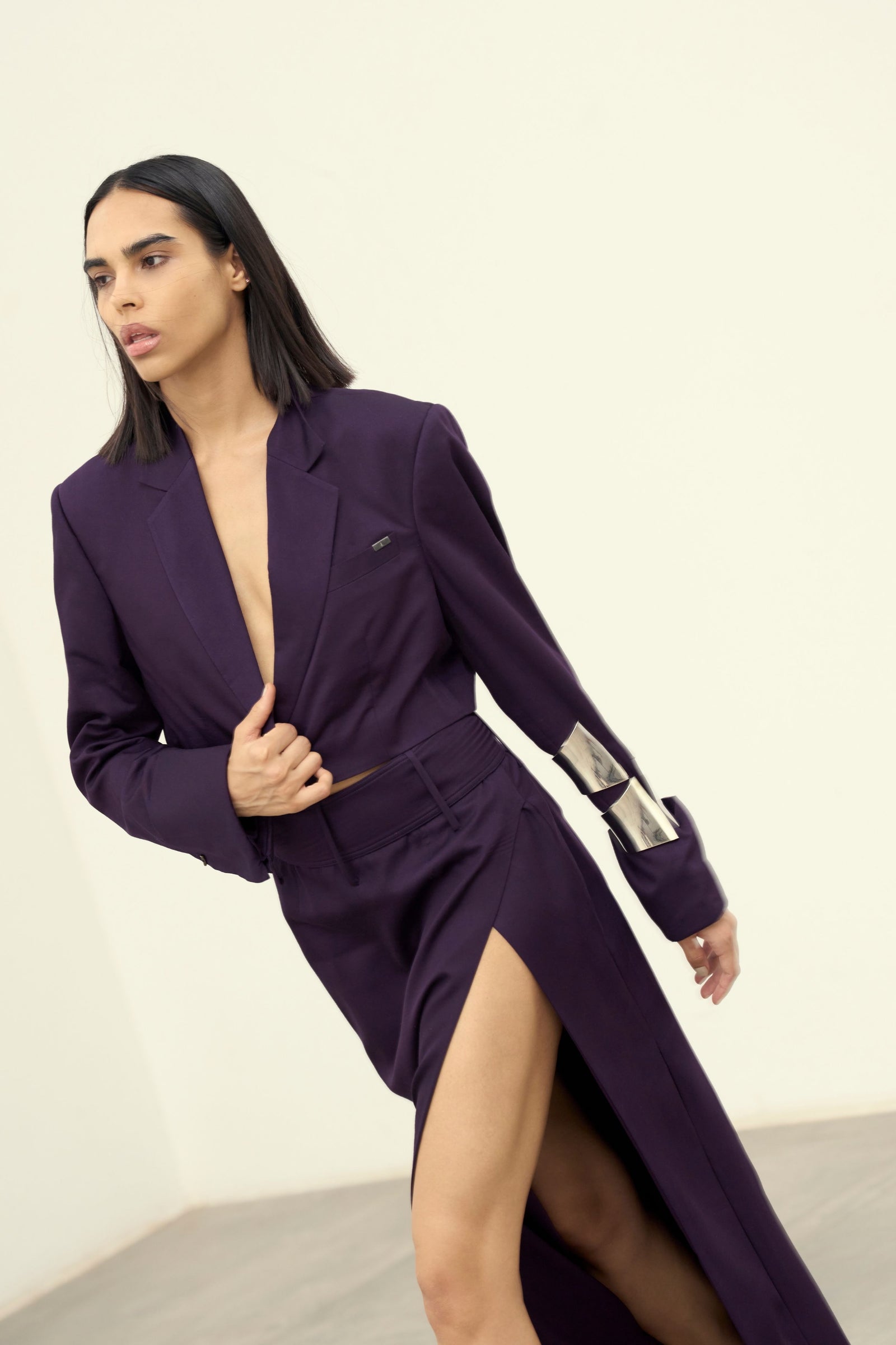 • She is not afraid to speak her mind or to take charge of a situation, she feels like a force to be reckoned with in this well-tailored powersuit. The jacket is cut in a sharp, angular style that emphasizes her shoulders, giving her a commanding presence while the cropped waistcoat keeps it sexy, exposing her well toned abs. Her suit sends a message of professionalism, competence & authority as she feels ready to take on the world.