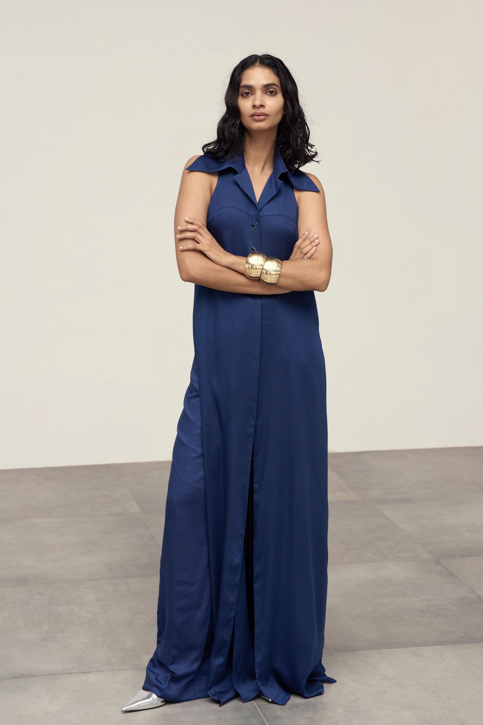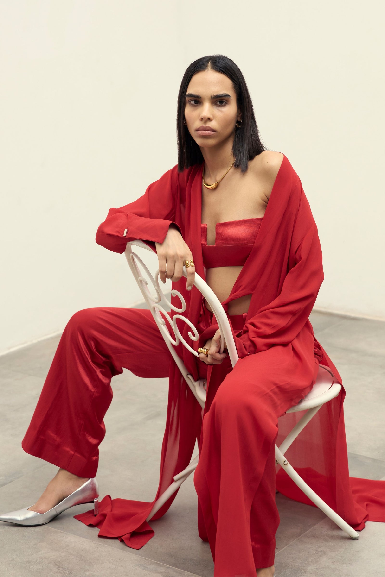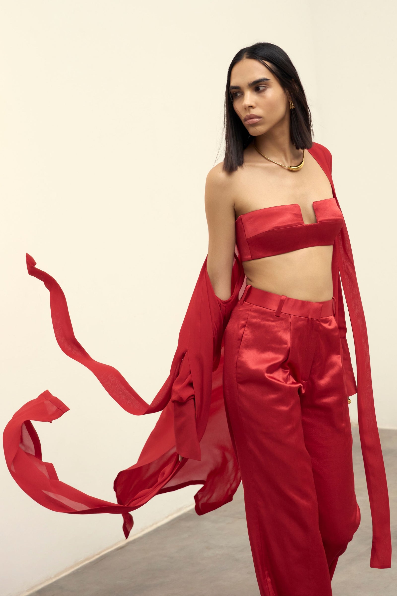 • She is not afraid to speak her mind or to take charge of a situation, she feels like a force to be reckoned with in this well-tailored powersuit. The jacket is cut in a sharp, angular style that emphasizes her shoulders, giving her a commanding presence while the cropped waistcoat keeps it sexy, exposing her well toned abs. Her suit sends a message of professionalism, competence & authority as she feels ready to take on the world.