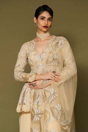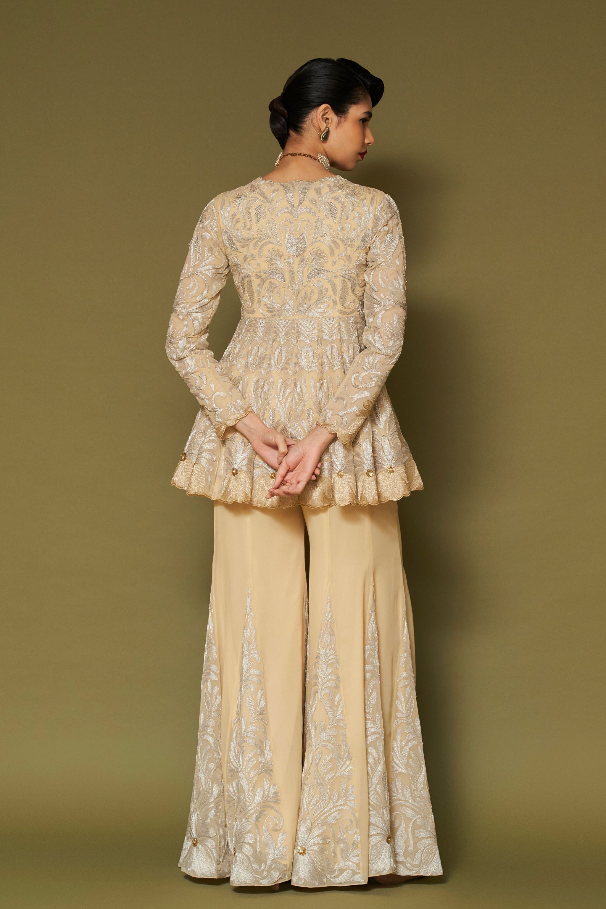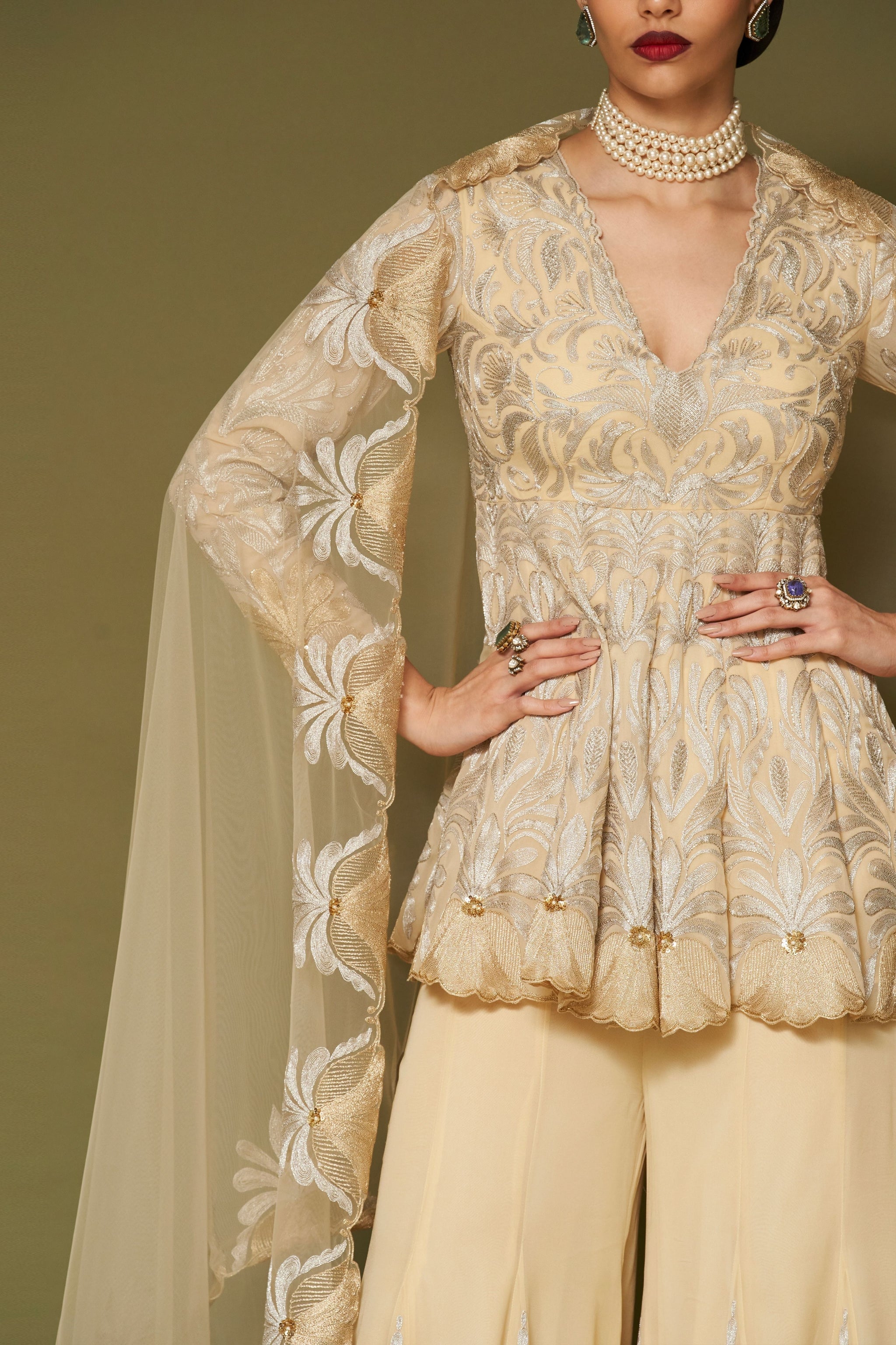 • Crafted in fluid georgette, this butter yellow sharara set features a richly embellished peplum short kurta paired with a flowy sharara. Accentuated with intricate zari work and delicate hand embroidery, the look is completed with a beautifully adorned net dupatta that adds a soft, elegant finish to the ensemble.