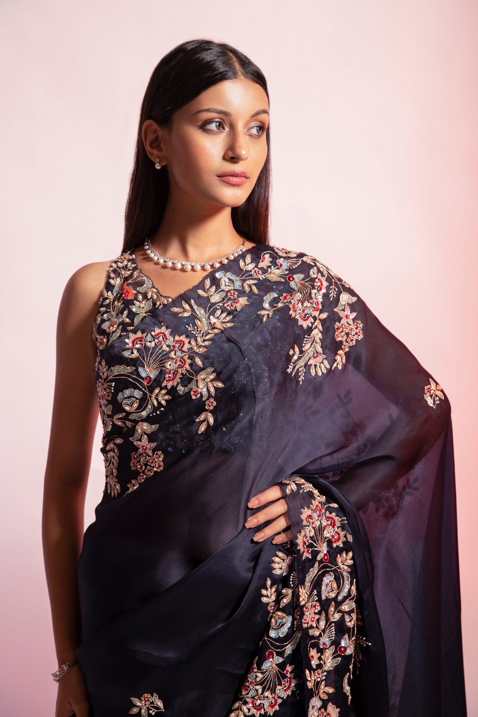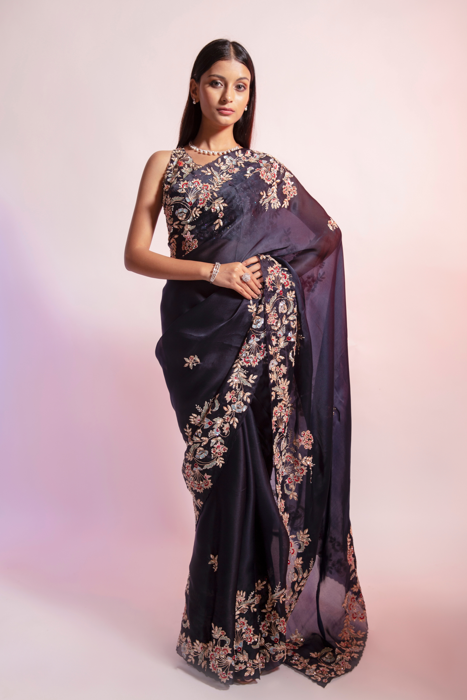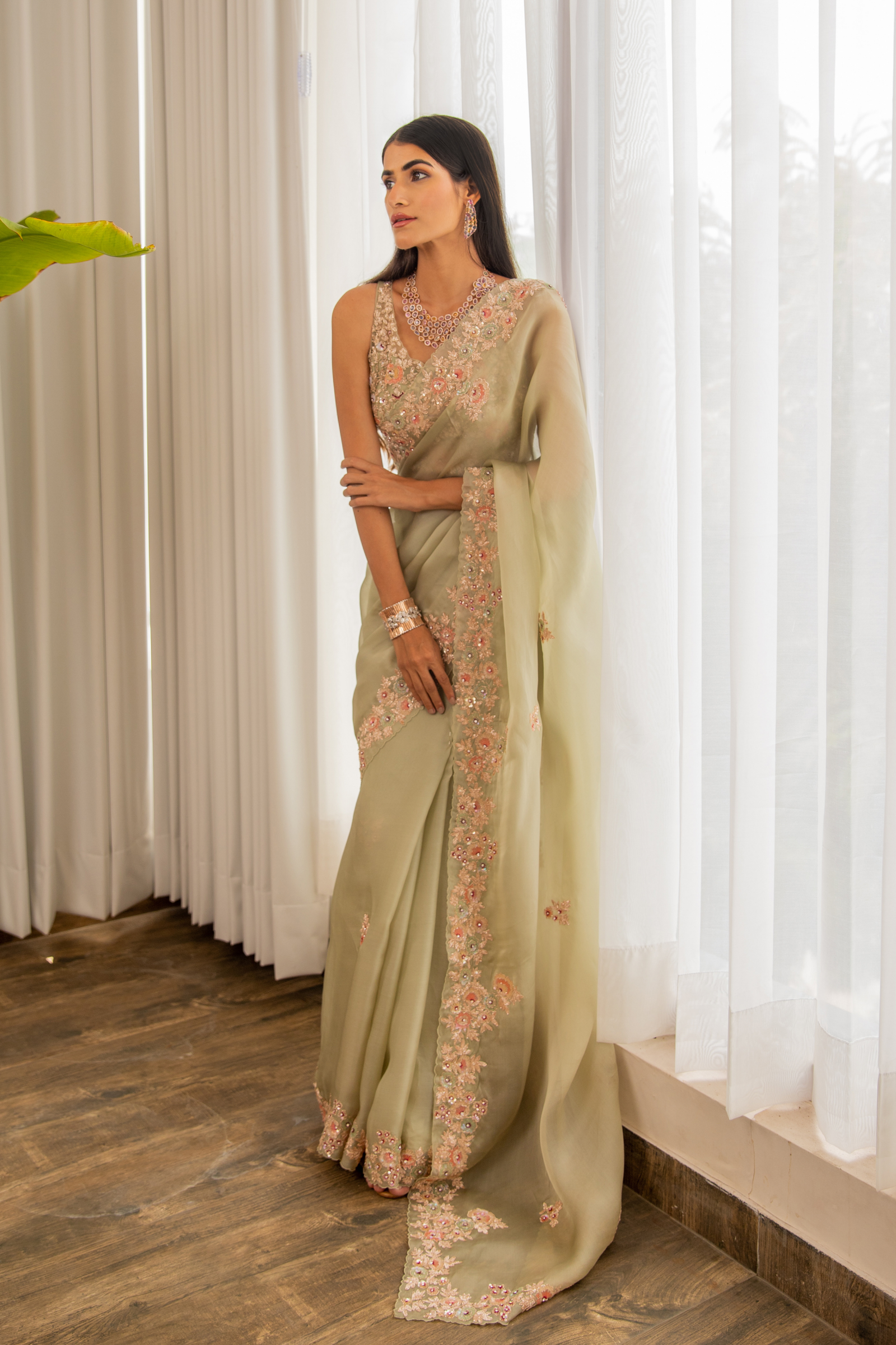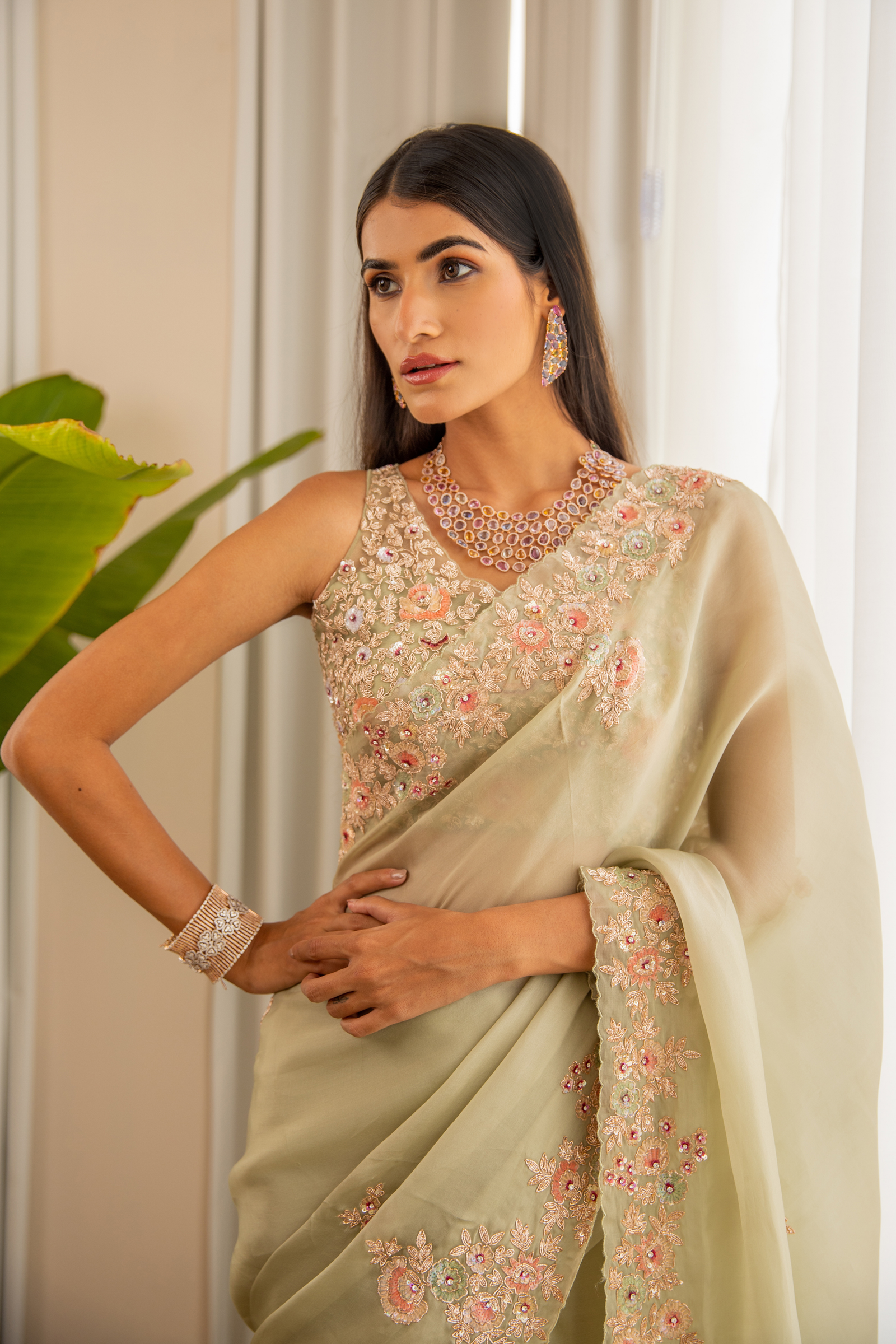 • Blossom yellow net buggle beads embellished blouse and hand crafted satin orgenza saree, along with satin petticoat