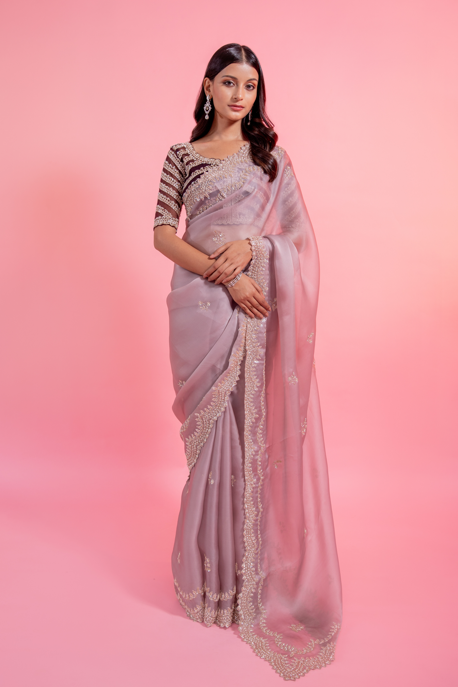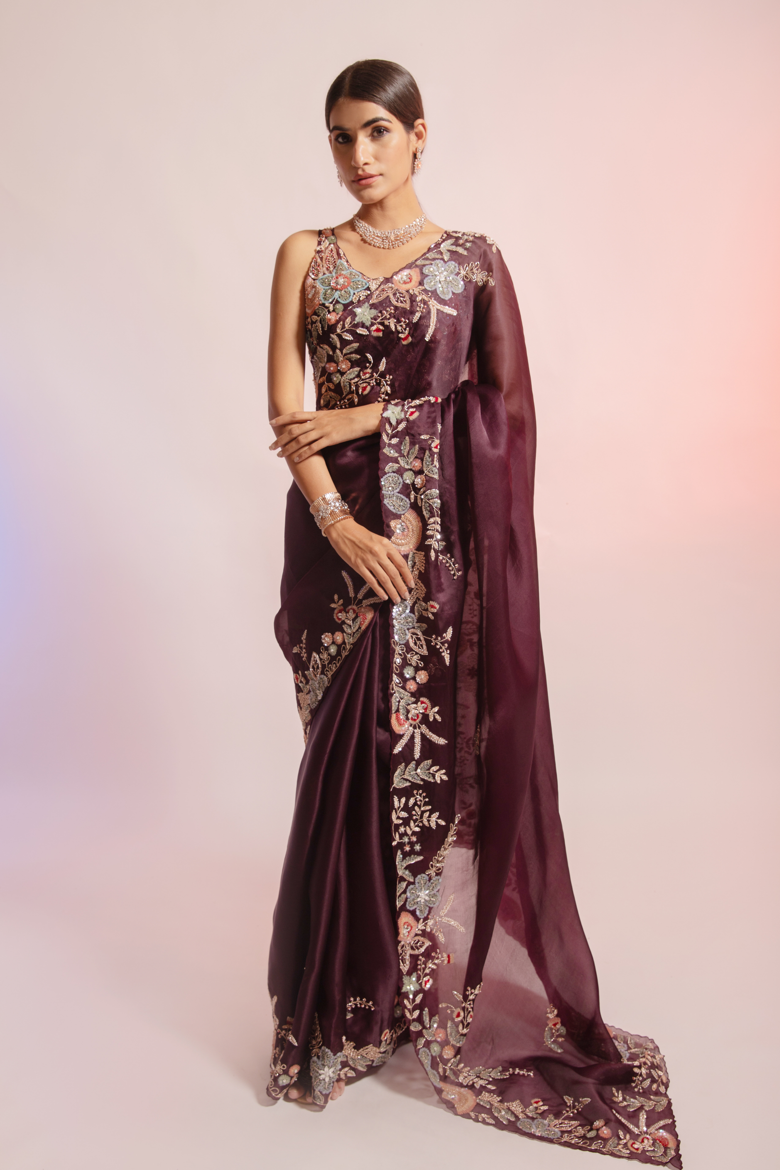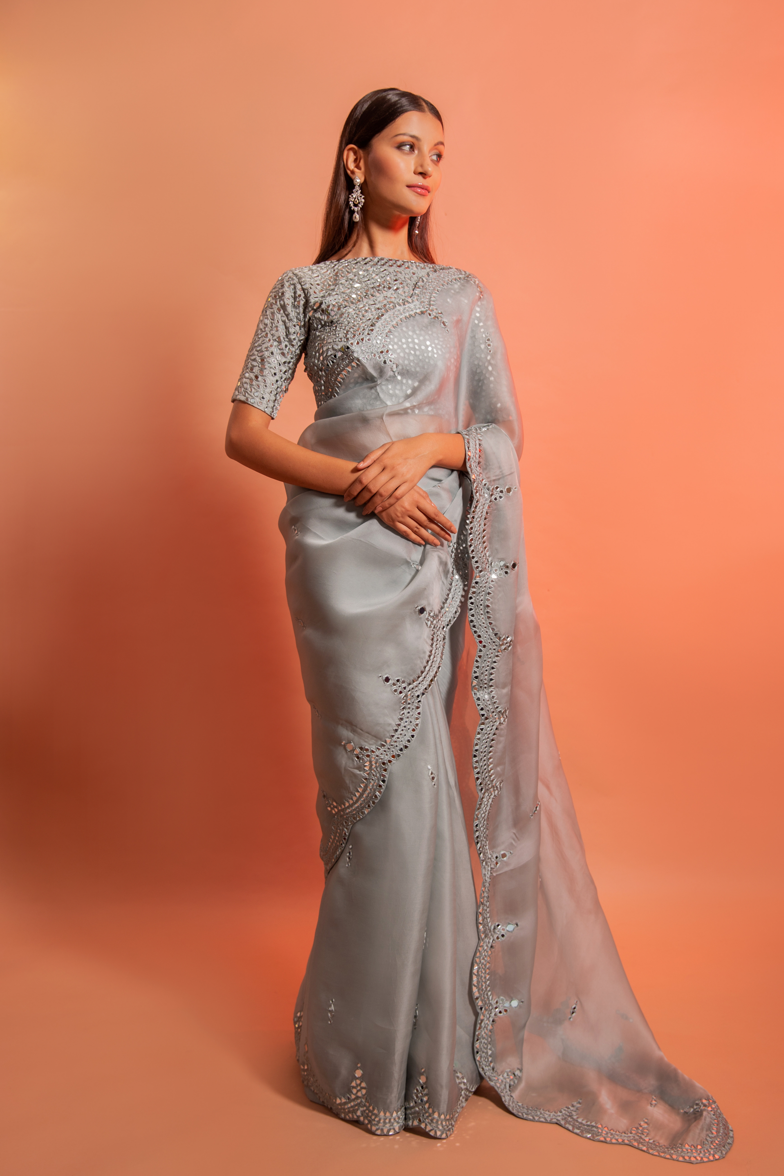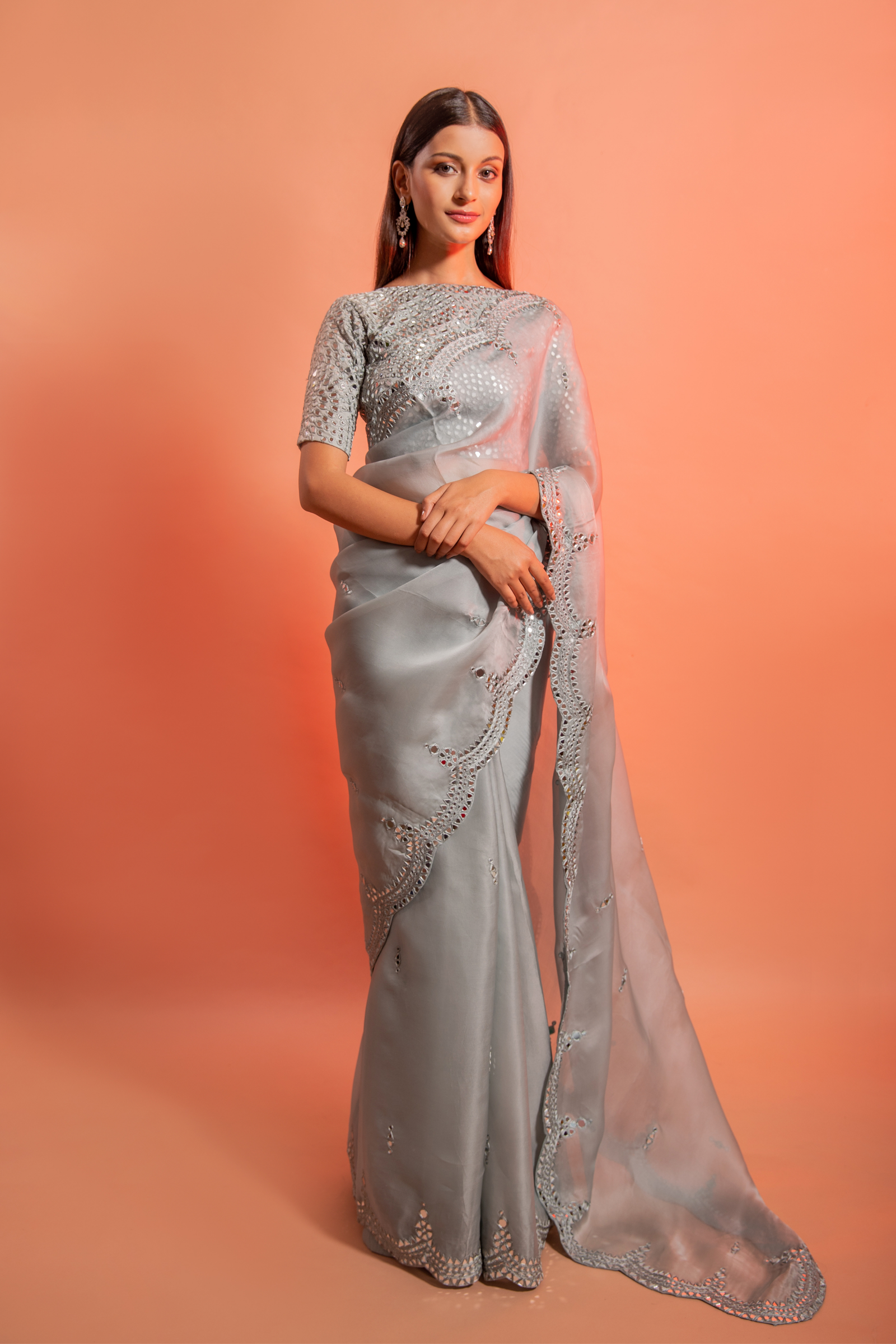 • Blossom yellow net buggle beads embellished blouse and hand crafted satin orgenza saree, along with satin petticoat
