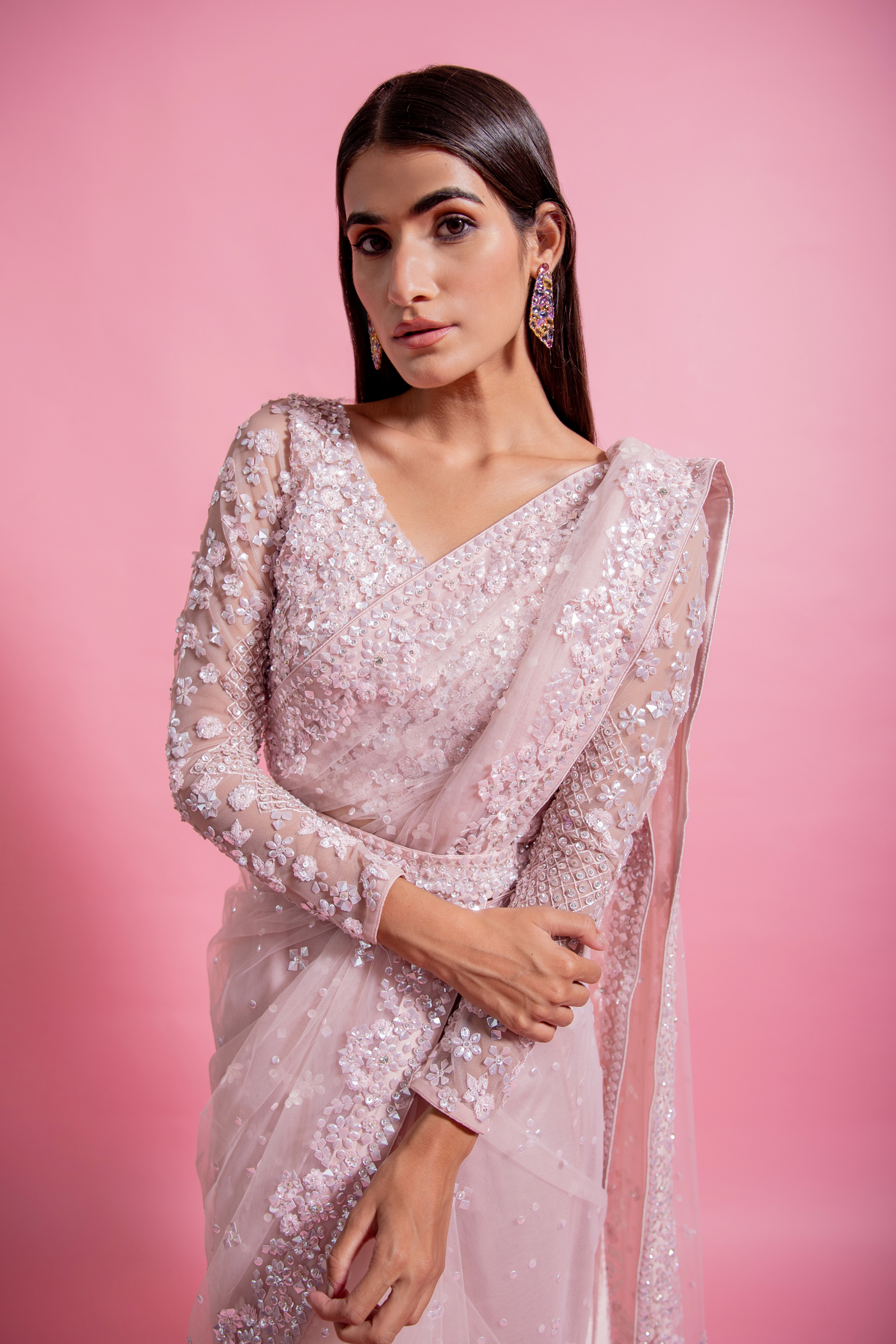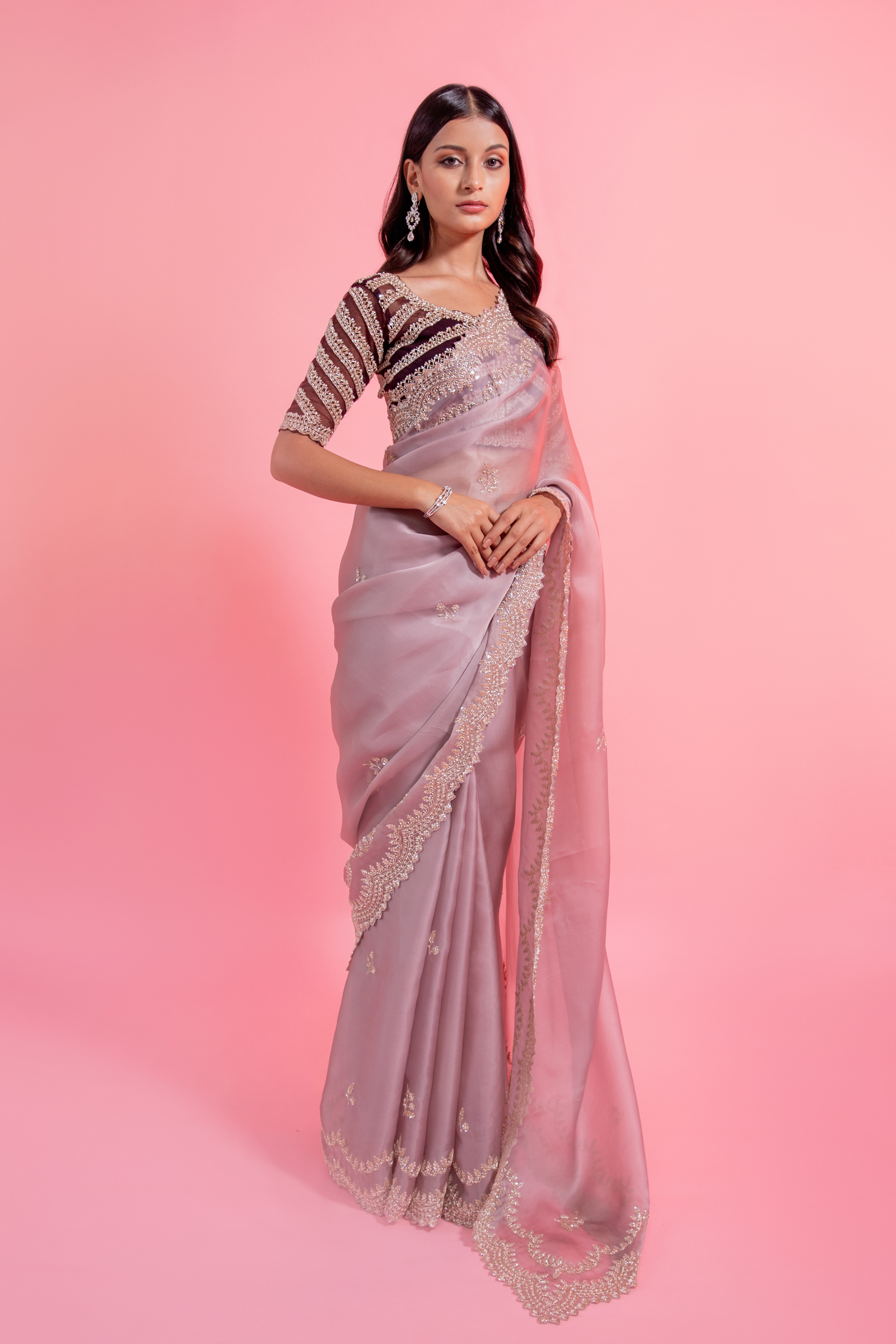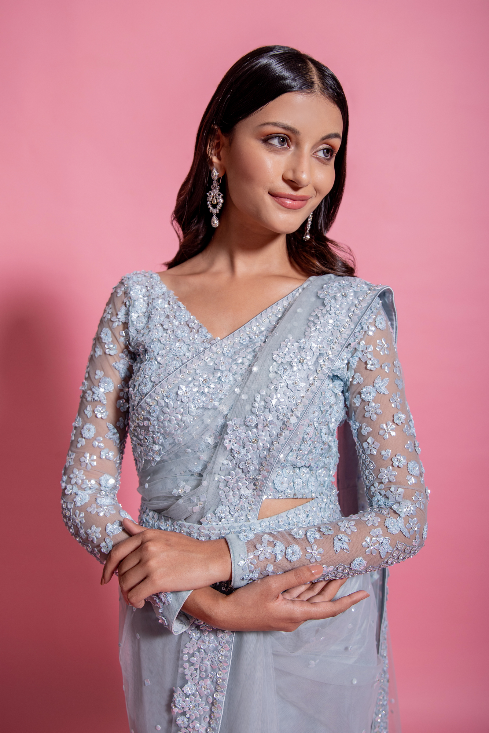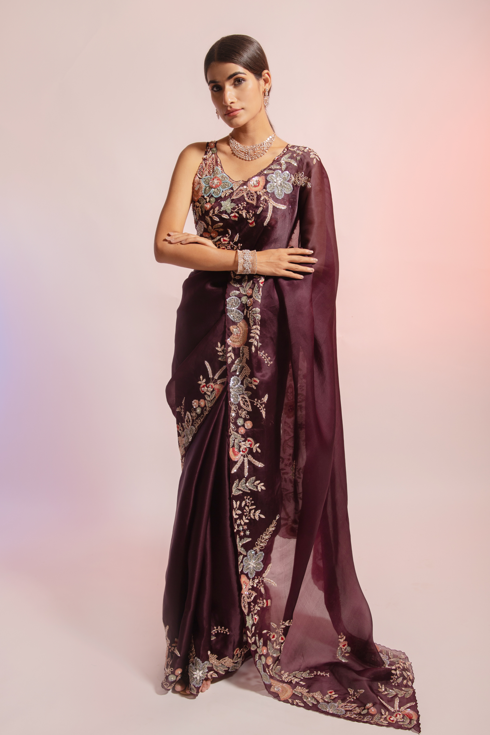 • Blossom yellow net buggle beads embellished blouse and hand crafted satin orgenza saree, along with satin petticoat