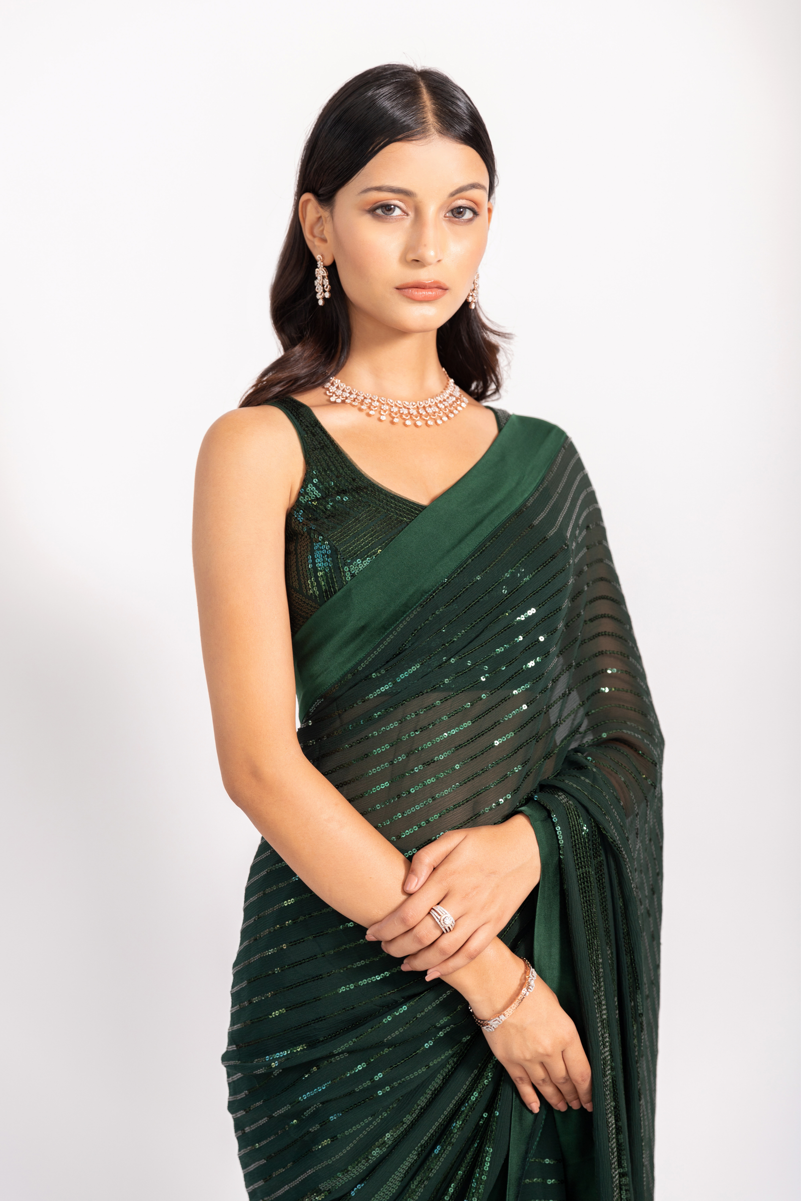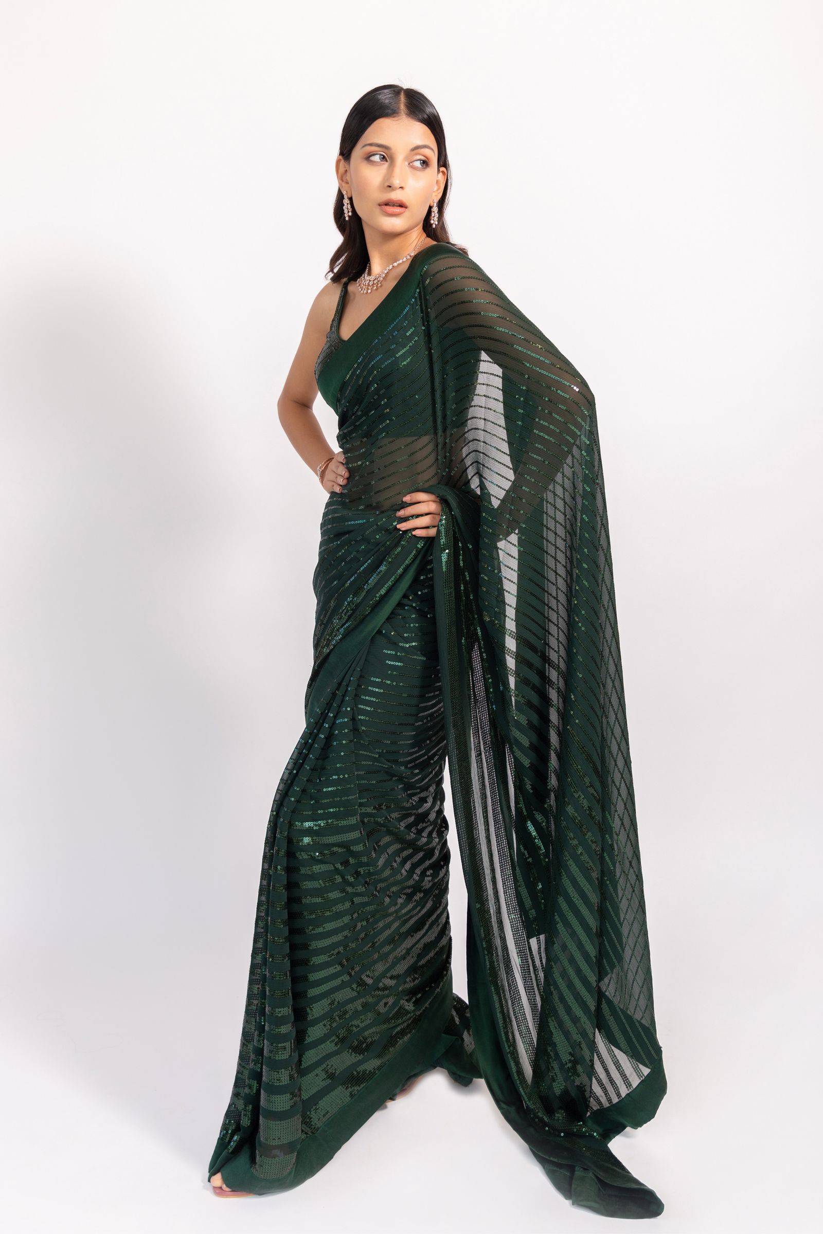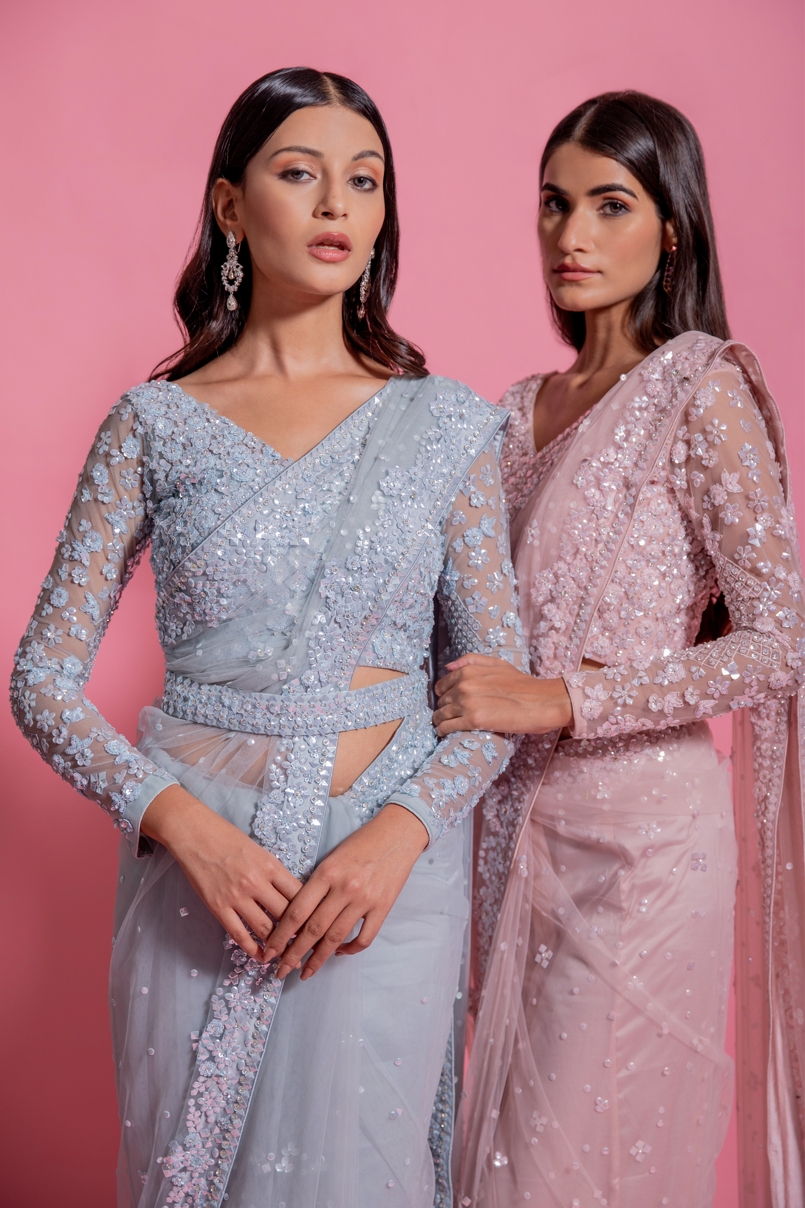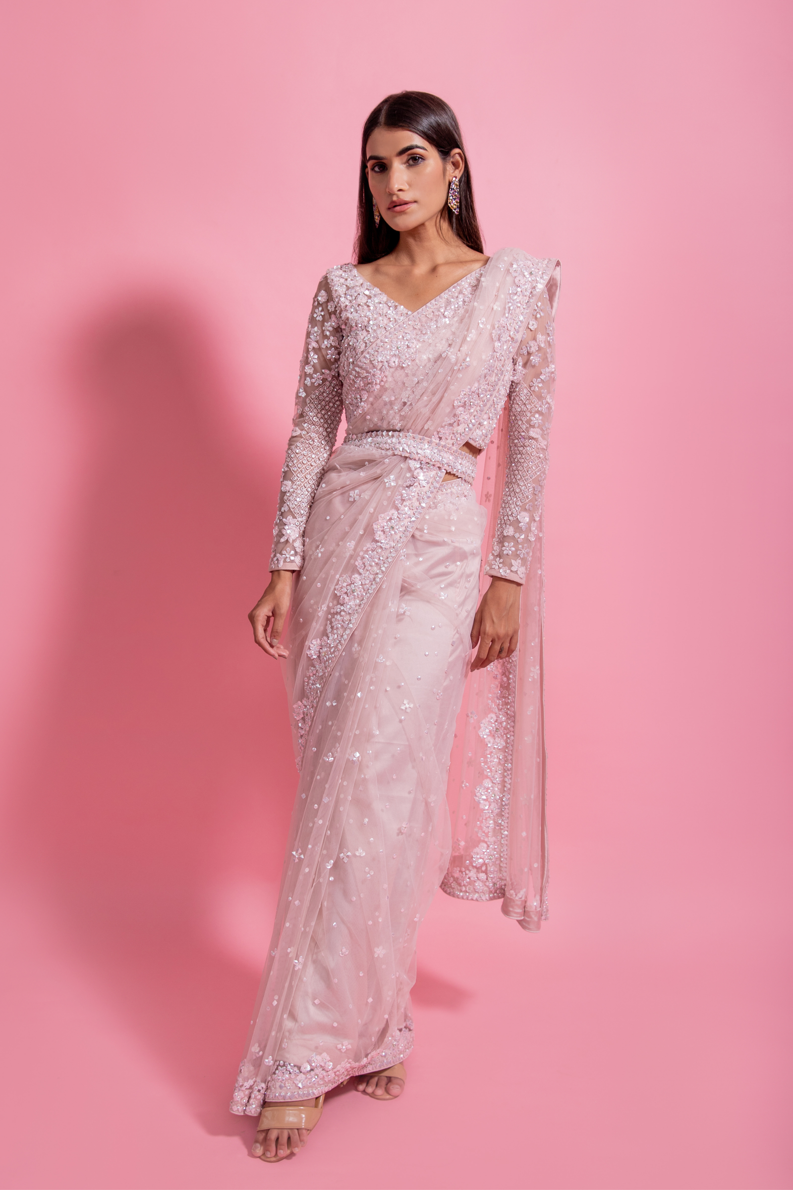 • Blossom yellow net buggle beads embellished blouse and hand crafted satin orgenza saree, along with satin petticoat
