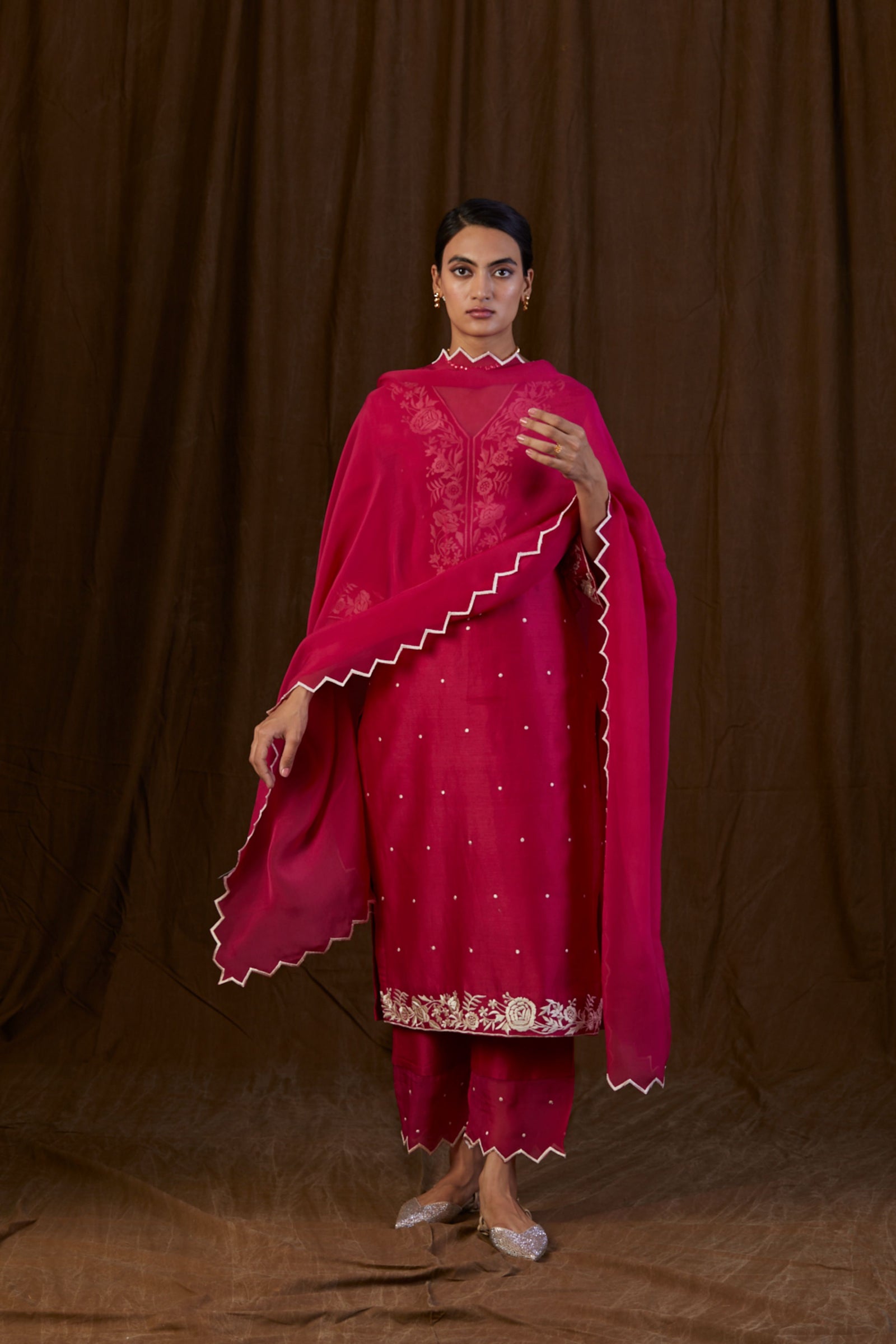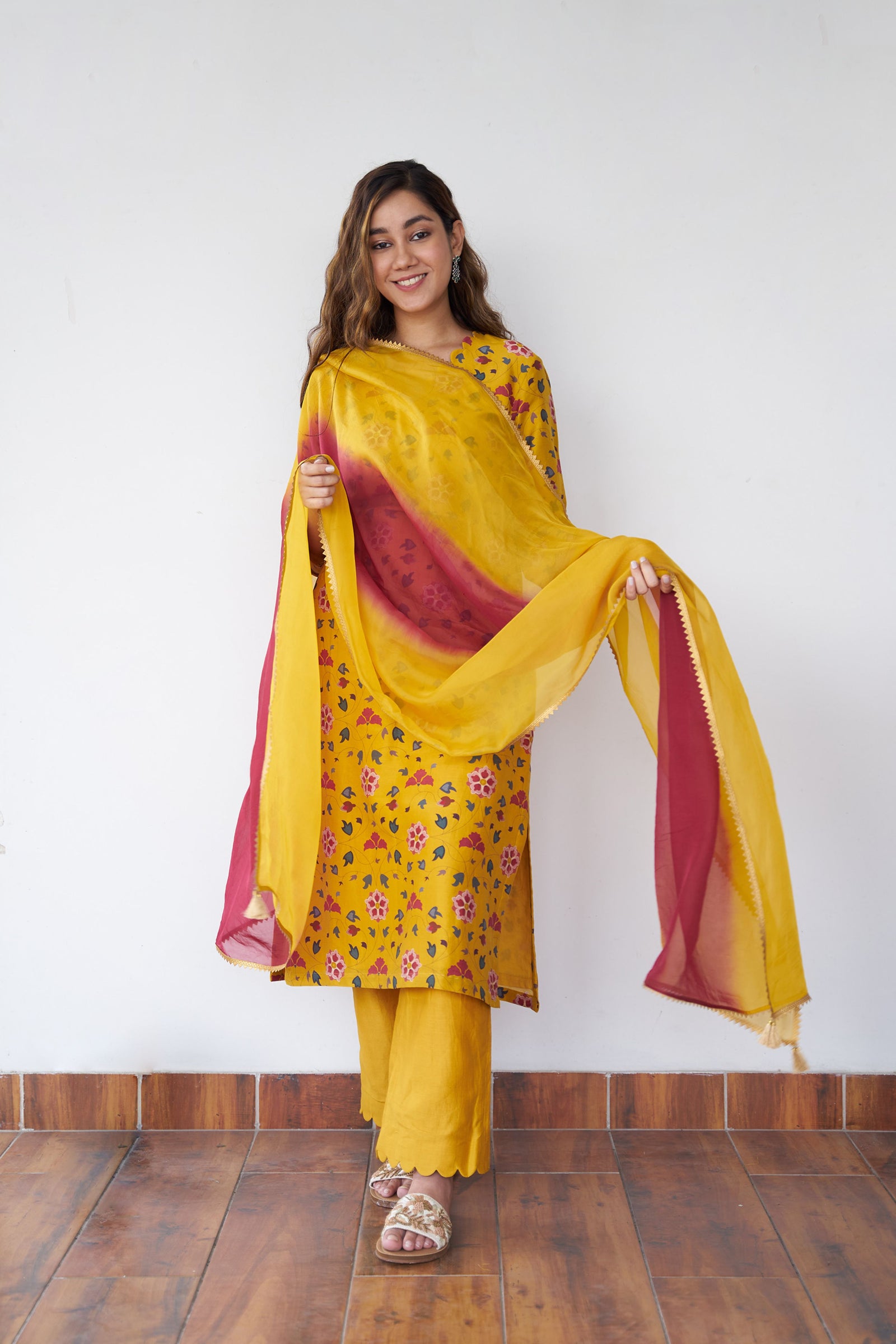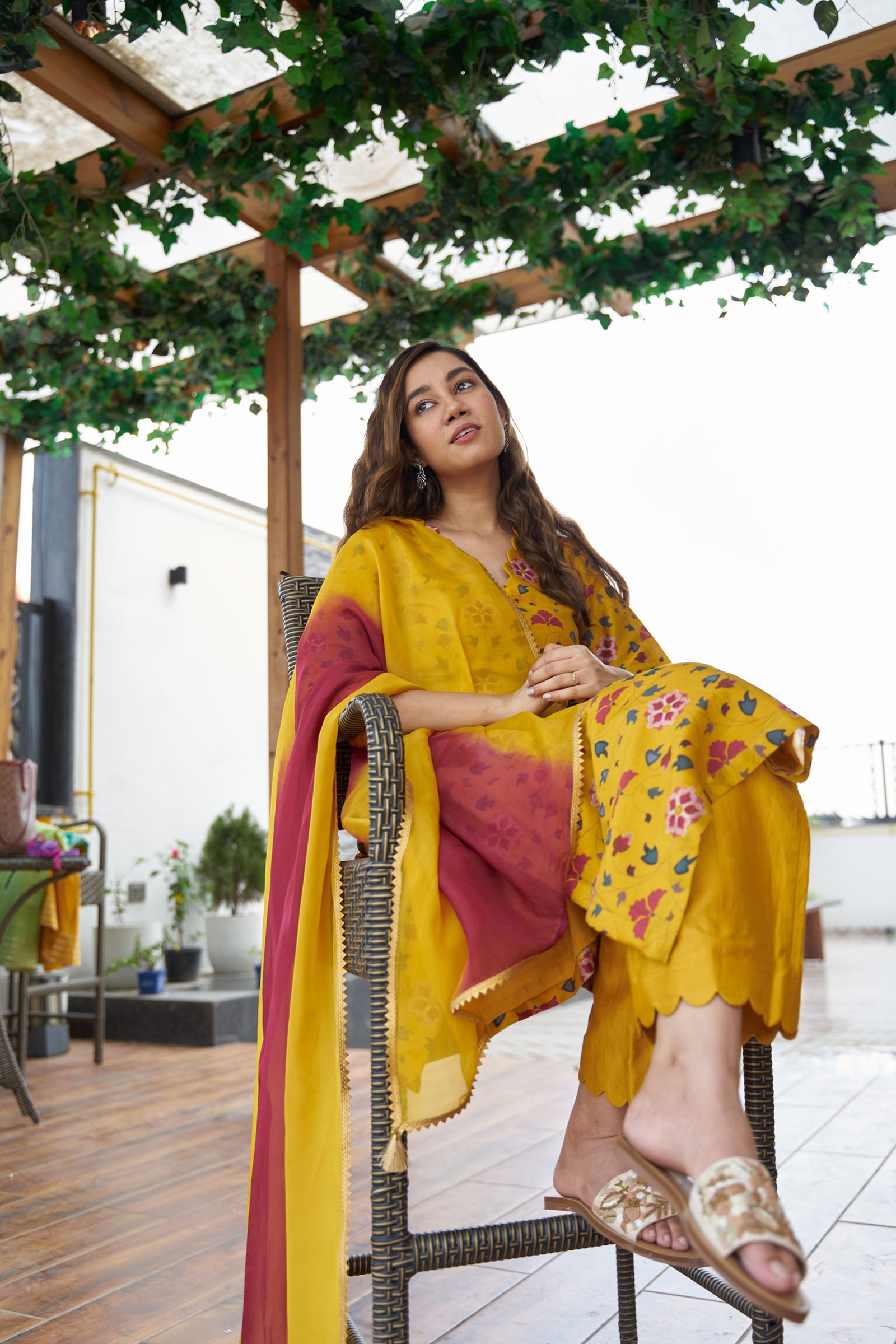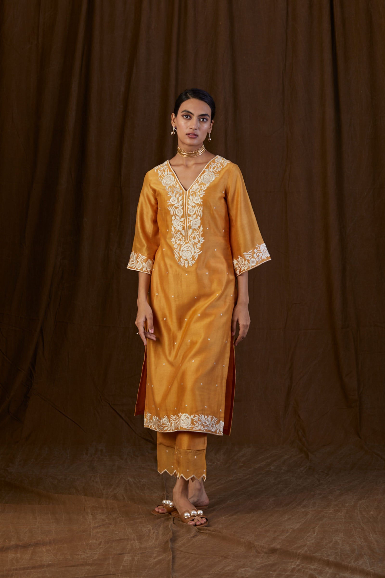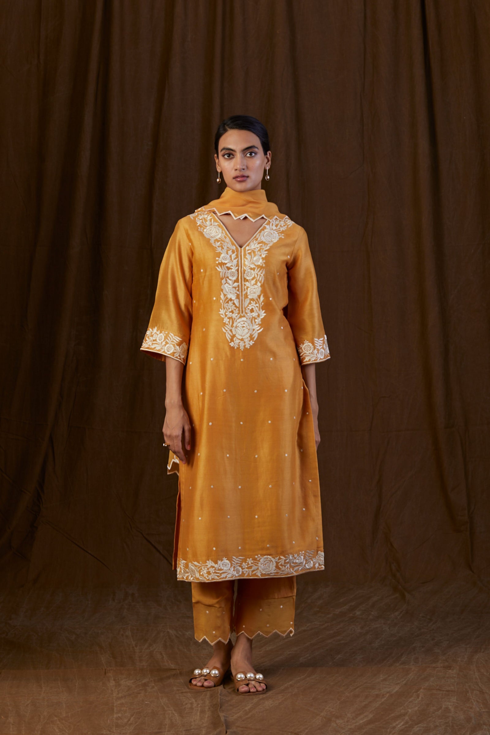 • The set features a mustard silk chanderi kurta set with thread work parsi gara embroidery at the neckline, sleeves and hem of the kurta, pants that is detailed with embroidery and organza panel. The set is paired with silk organza dupatta detailed with triangular thread work embroidery at the edges.