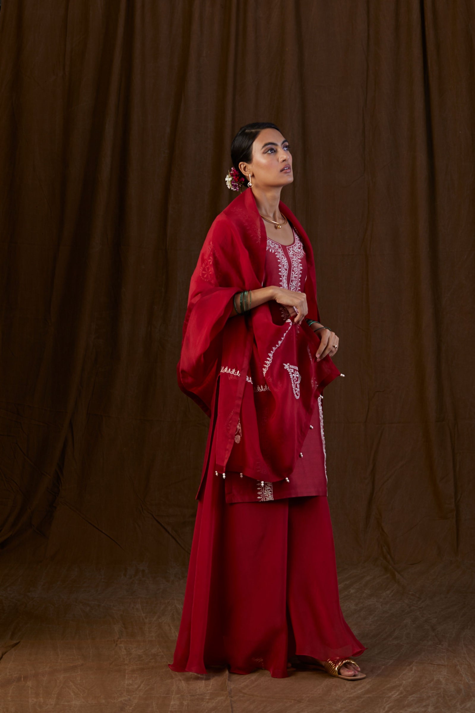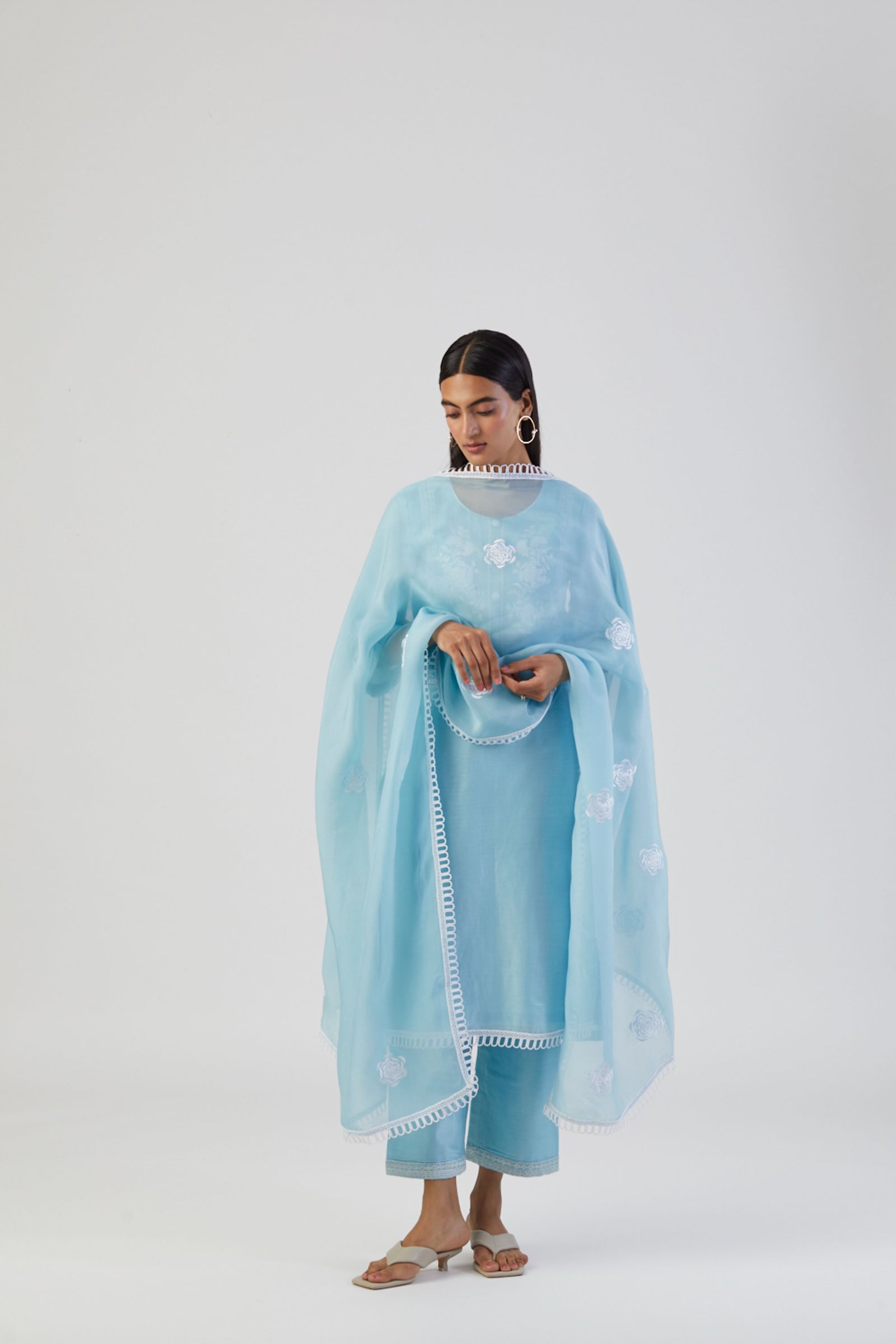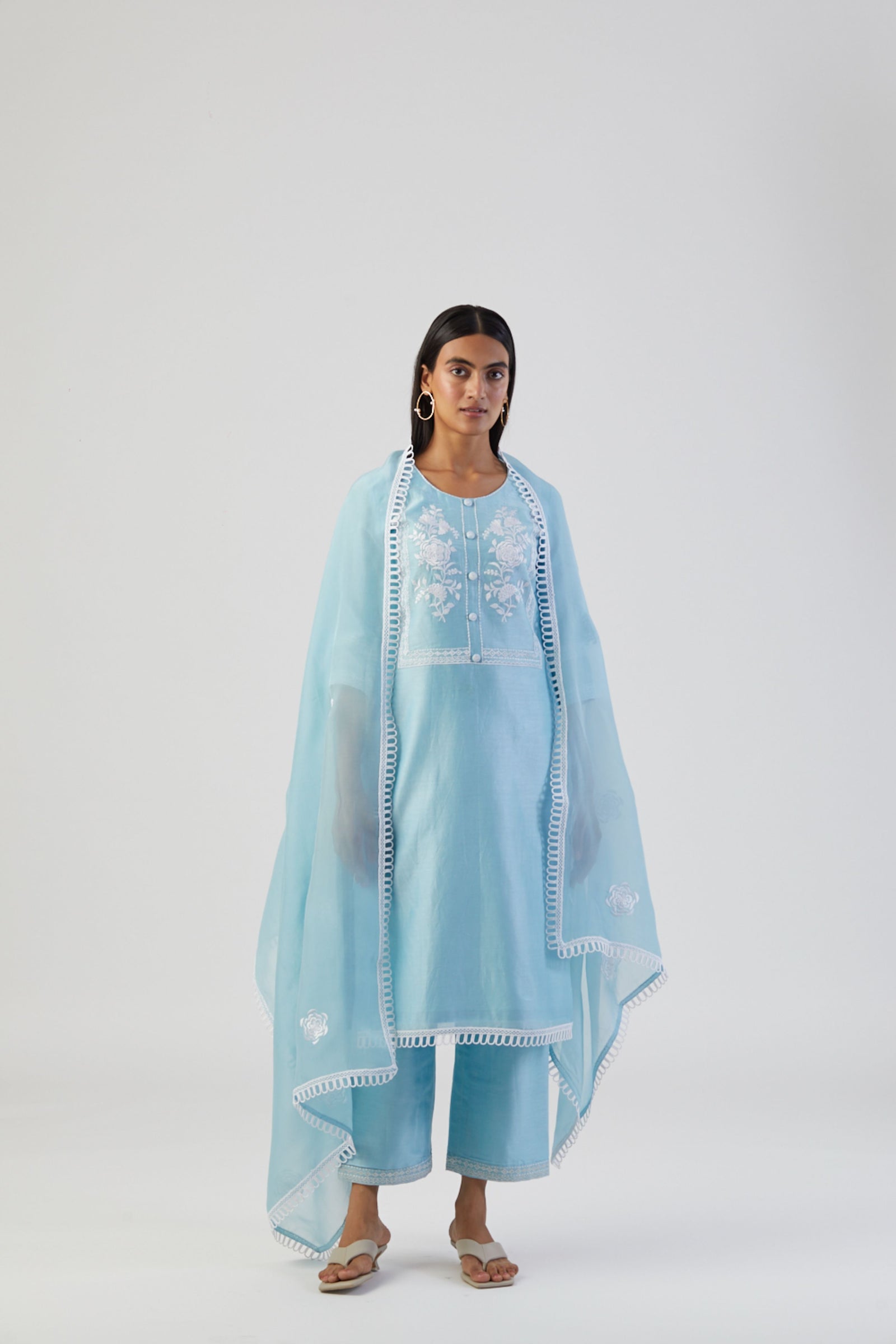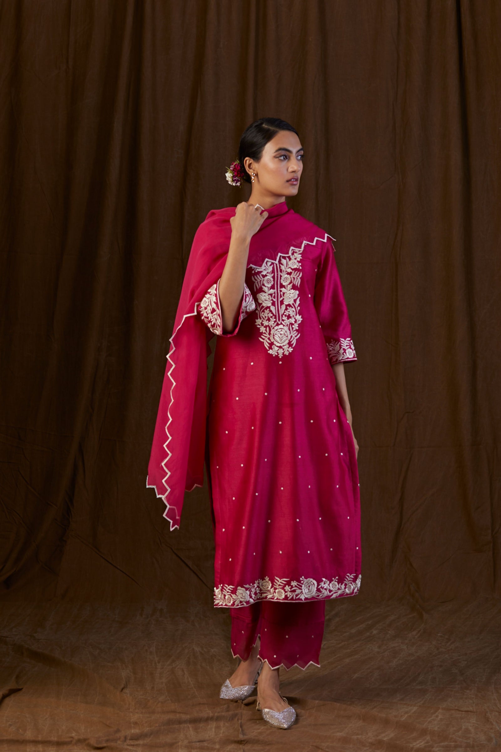 • The set features a mustard silk chanderi kurta set with thread work parsi gara embroidery at the neckline, sleeves and hem of the kurta, pants that is detailed with embroidery and organza panel. The set is paired with silk organza dupatta detailed with triangular thread work embroidery at the edges.