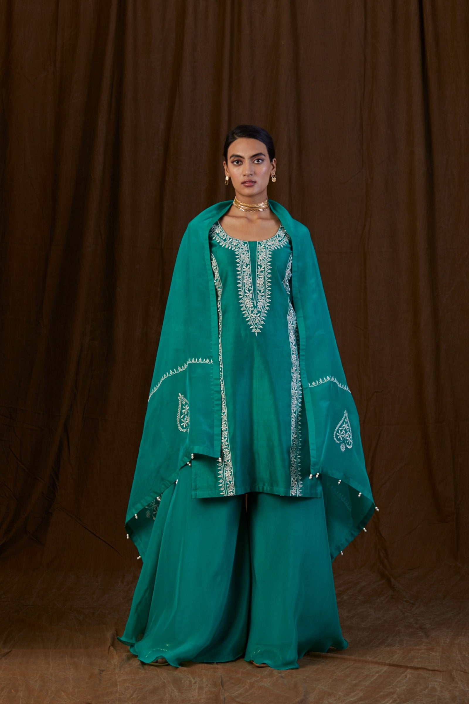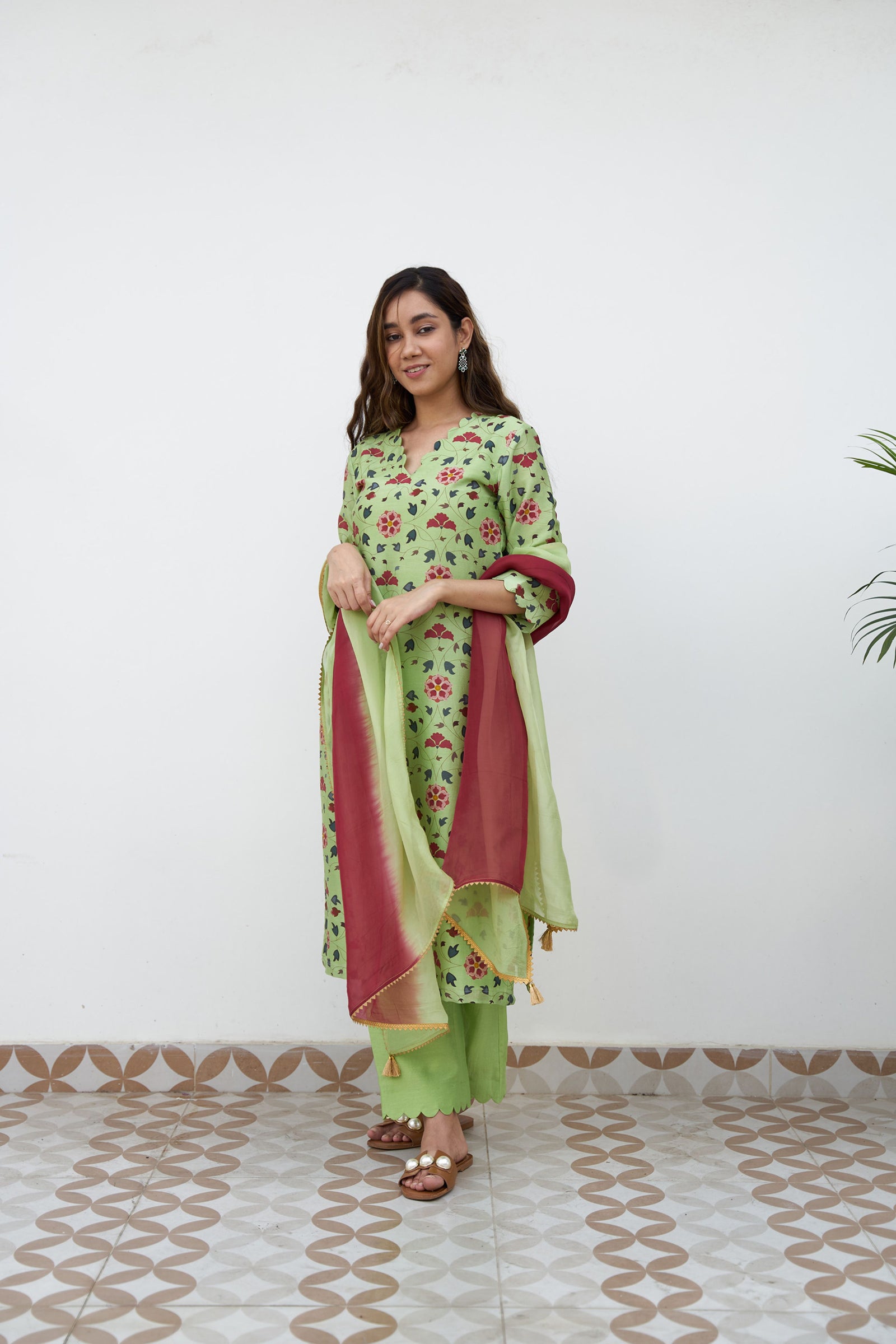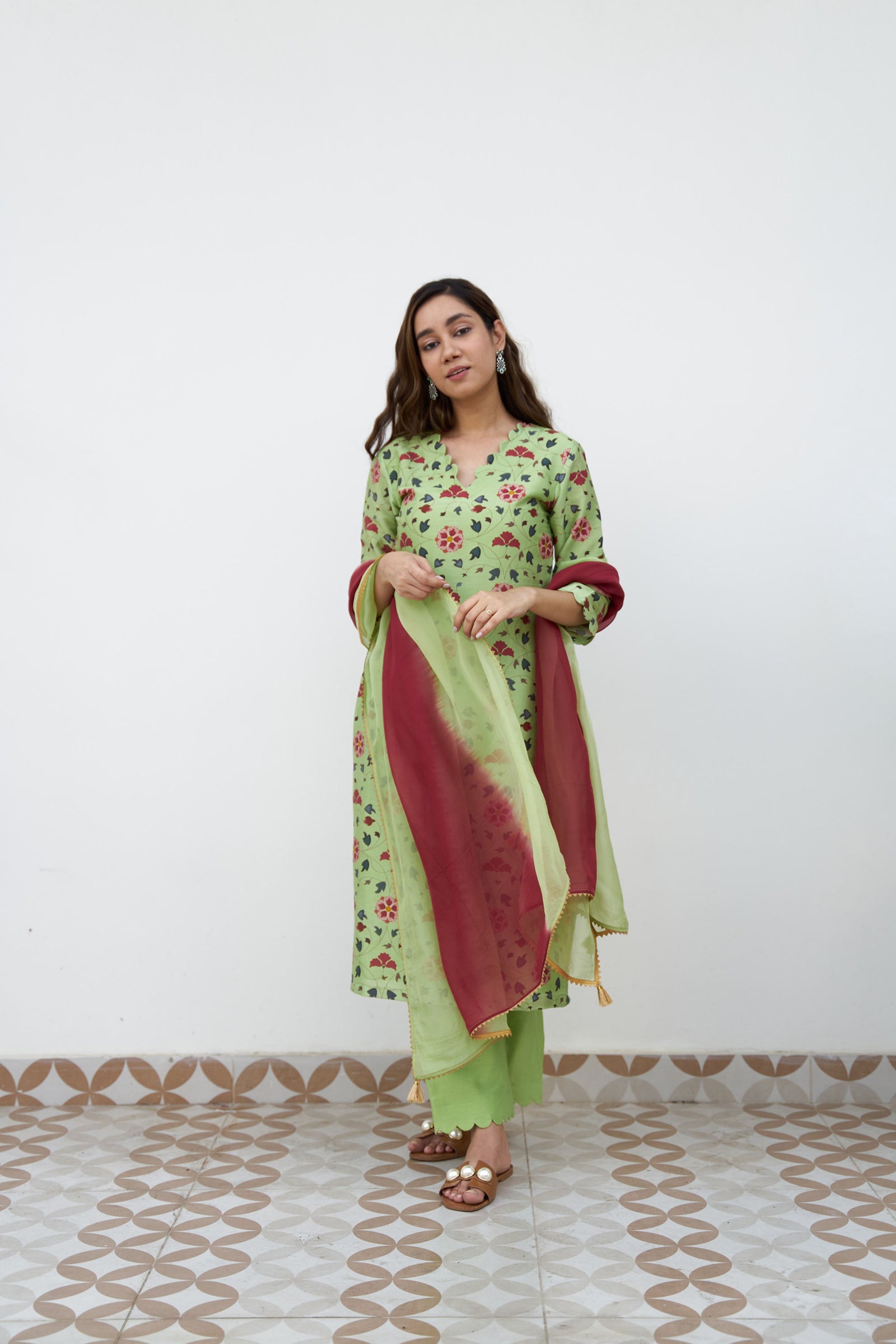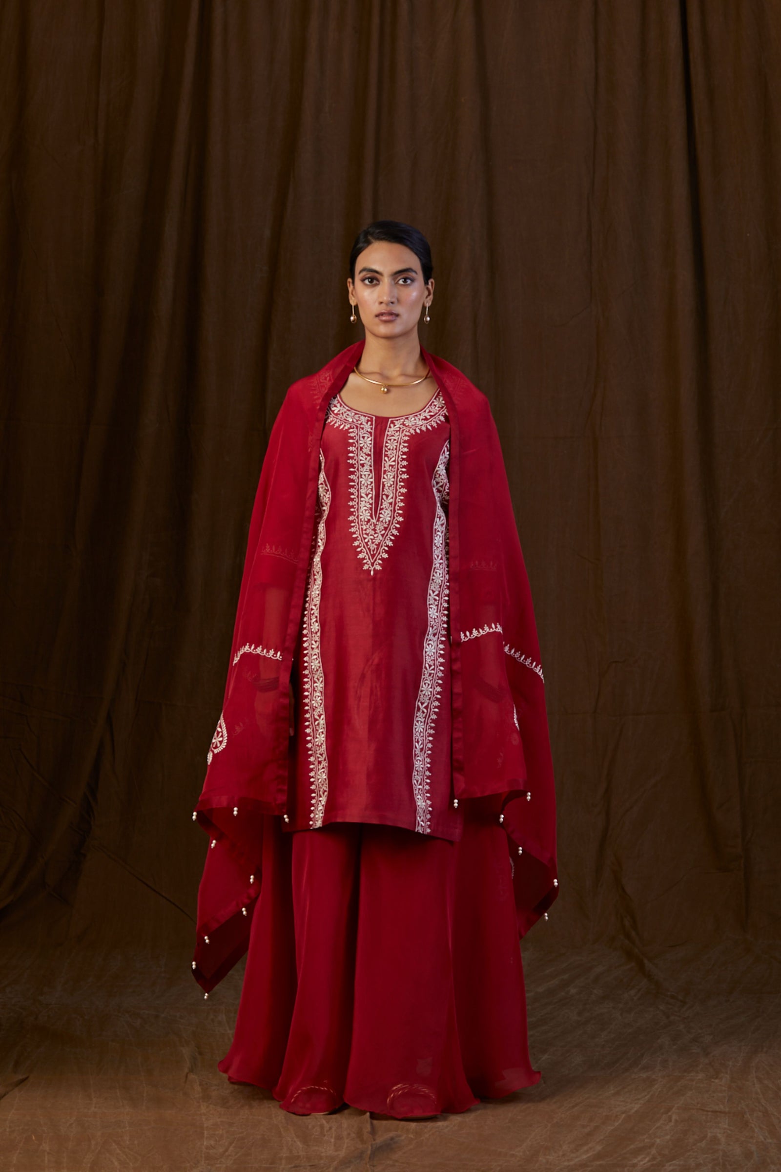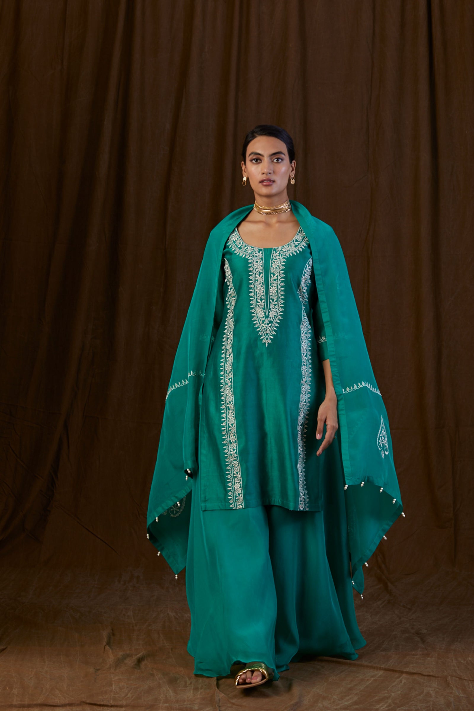 • The set features a mustard silk chanderi kurta set with thread work parsi gara embroidery at the neckline, sleeves and hem of the kurta, pants that is detailed with embroidery and organza panel. The set is paired with silk organza dupatta detailed with triangular thread work embroidery at the edges.