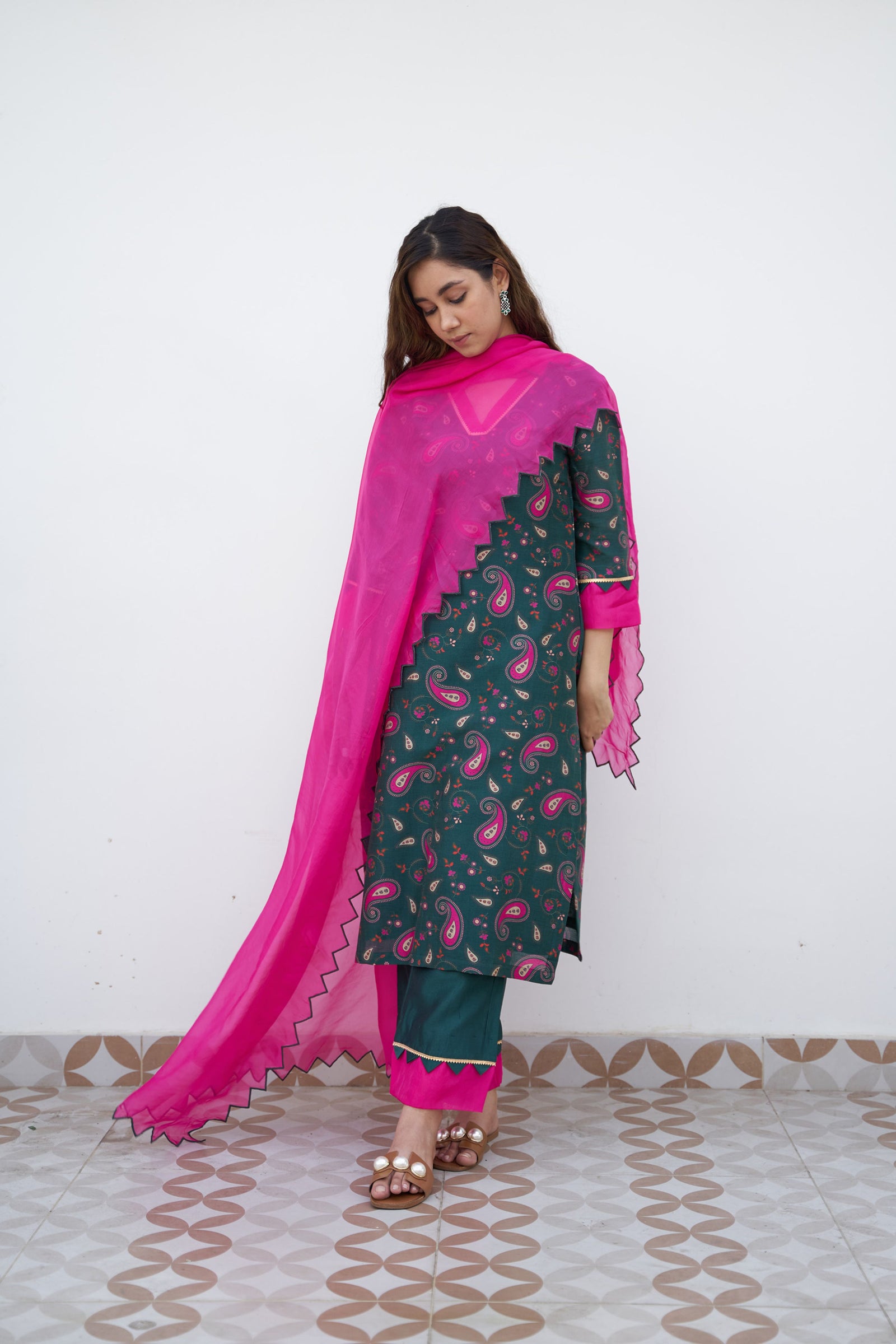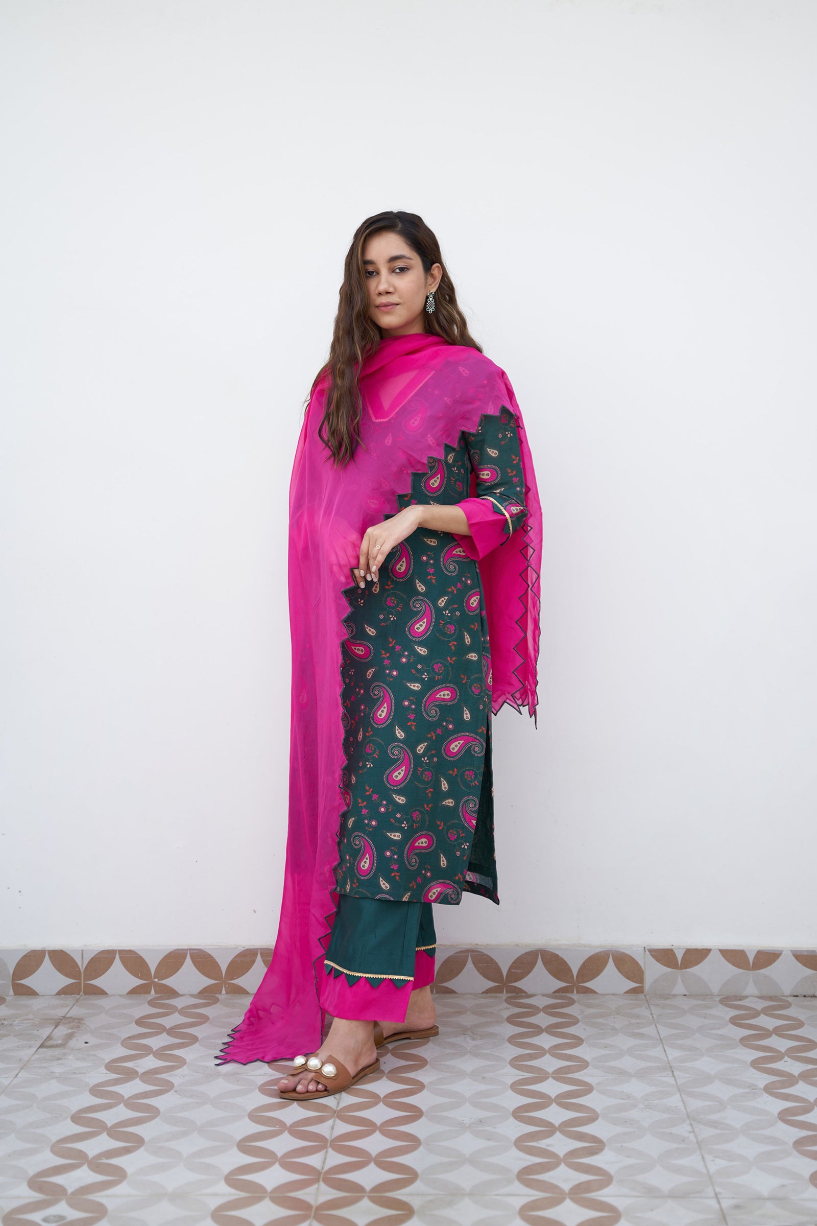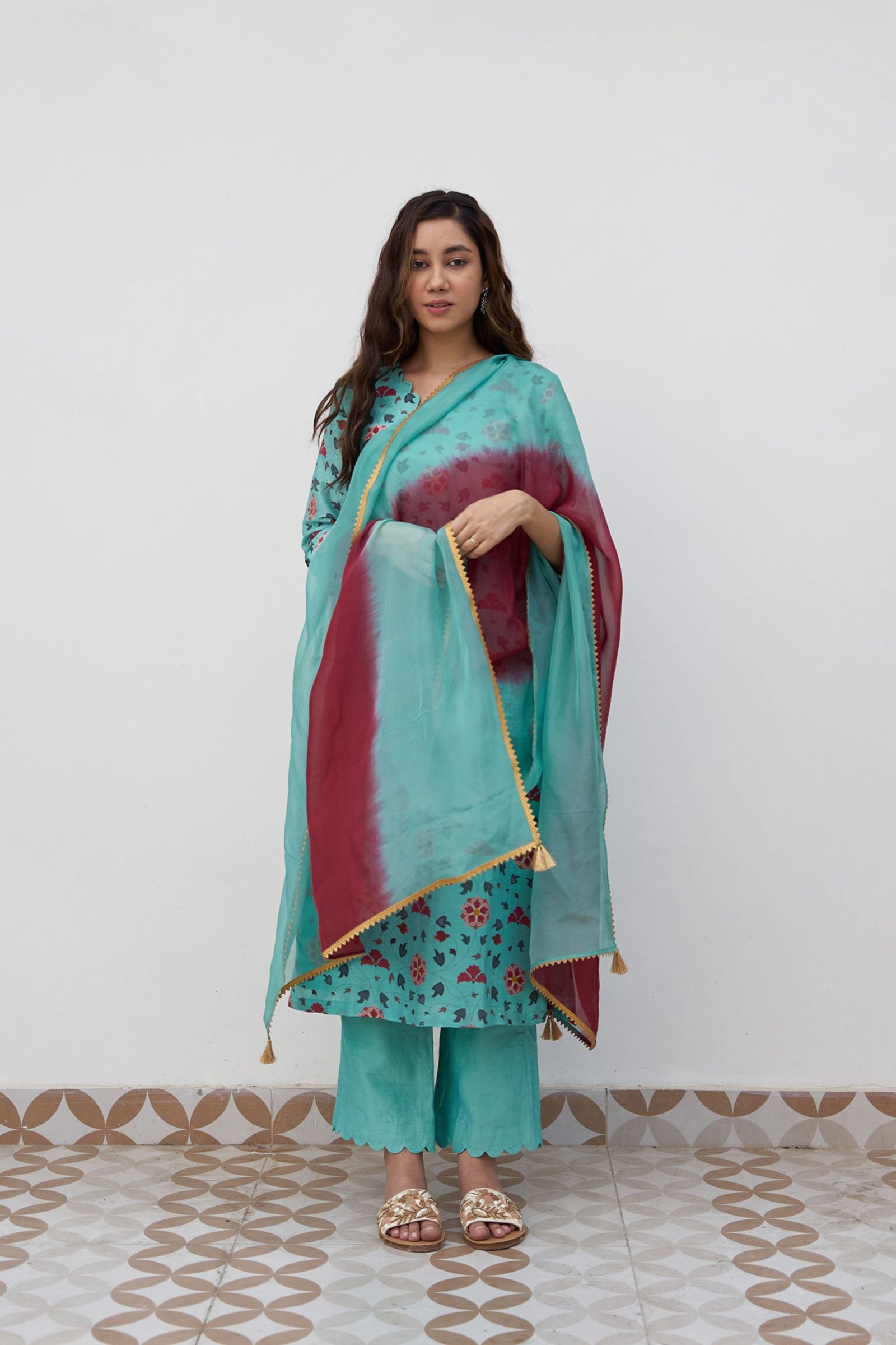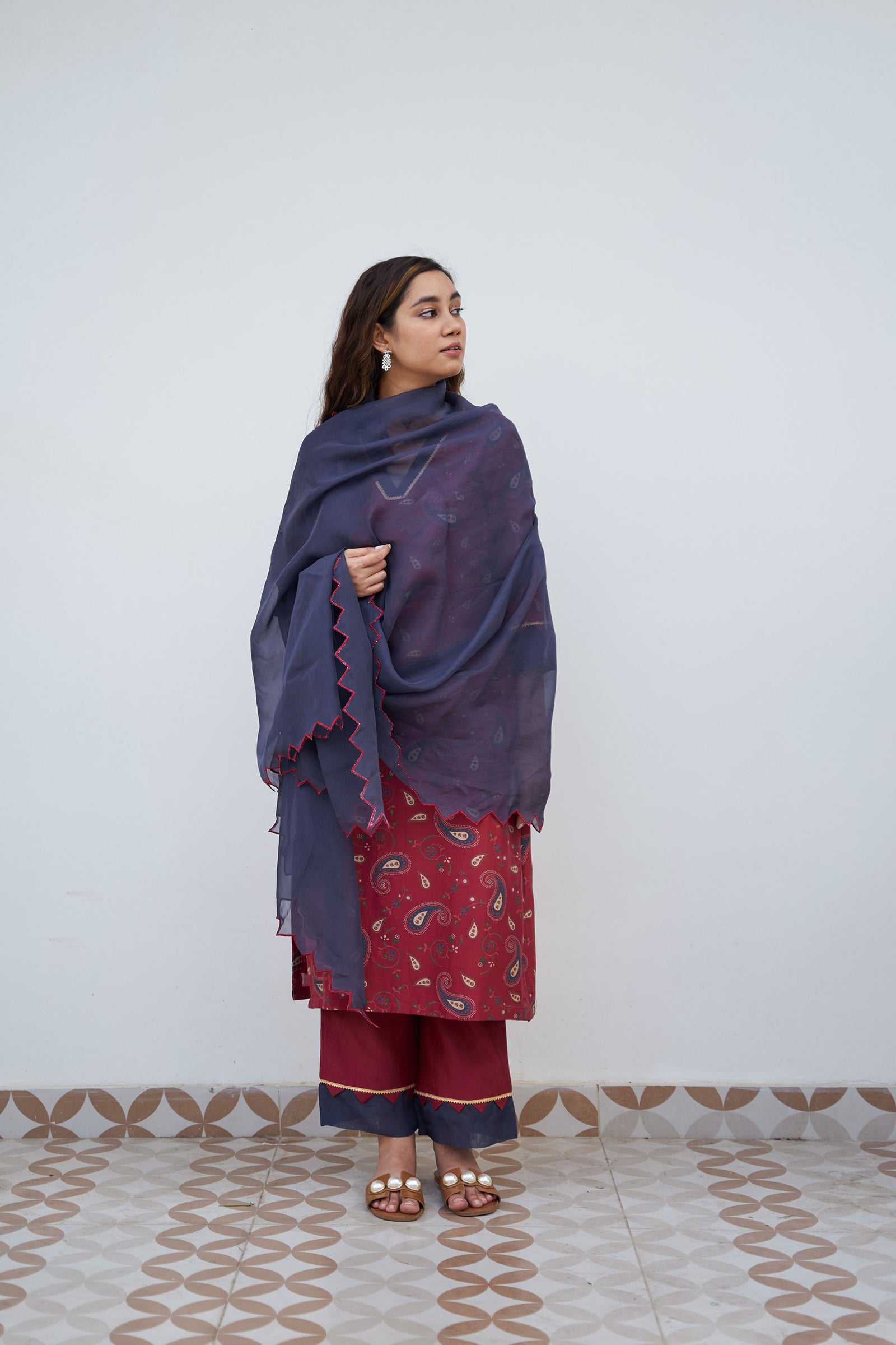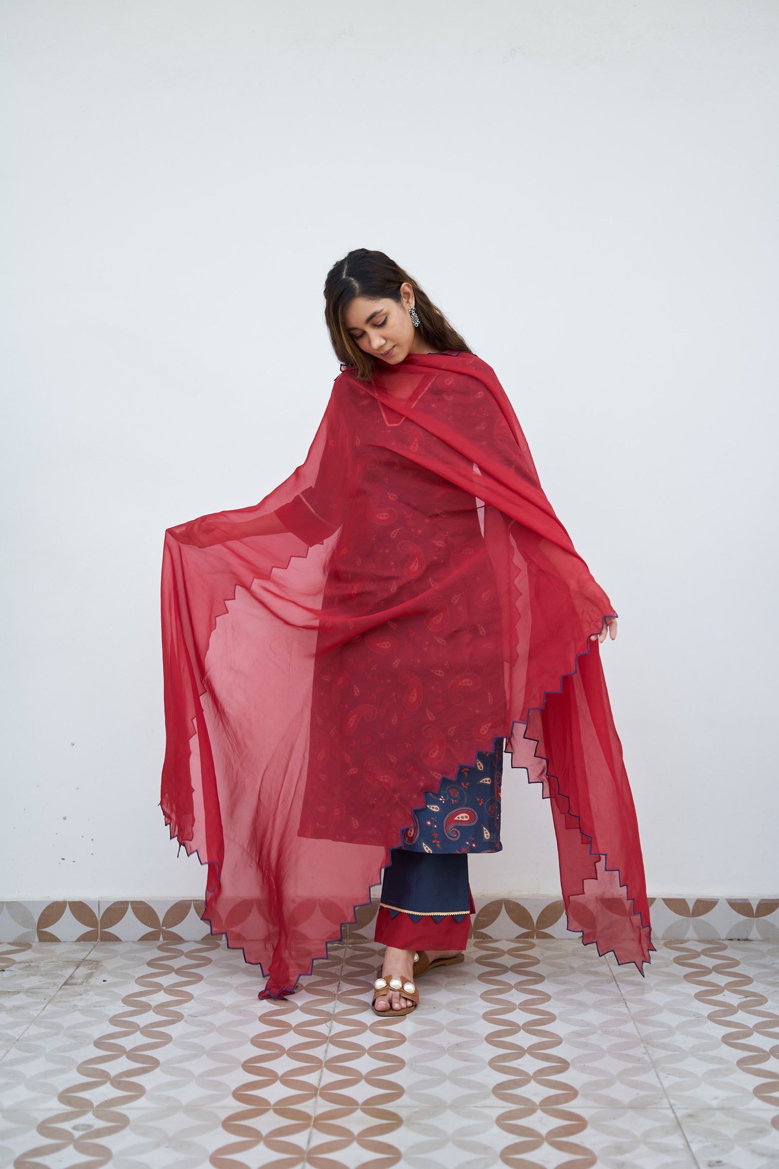 • The set features a mustard silk chanderi kurta set with thread work parsi gara embroidery at the neckline, sleeves and hem of the kurta, pants that is detailed with embroidery and organza panel. The set is paired with silk organza dupatta detailed with triangular thread work embroidery at the edges.