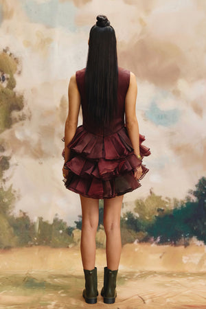 • This striking, sleeveless mini-dress is crafted entirely from deep burgundy organza. It features a smooth, fitted bodice that flows seamlessly into a dramatic skirt composed of voluminous, cascading tiered ruffles, creating a single, bold, and structured silhouette.