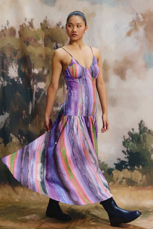 • Crafted from a lightweight fabric, the midi-length dress with thin straps features a flowy silhouette with a multicolored striped pattern in shades of purple, pink, green, and black. The vibrant hues add a playful charm, perfect for festive occasions or stylish evenings.