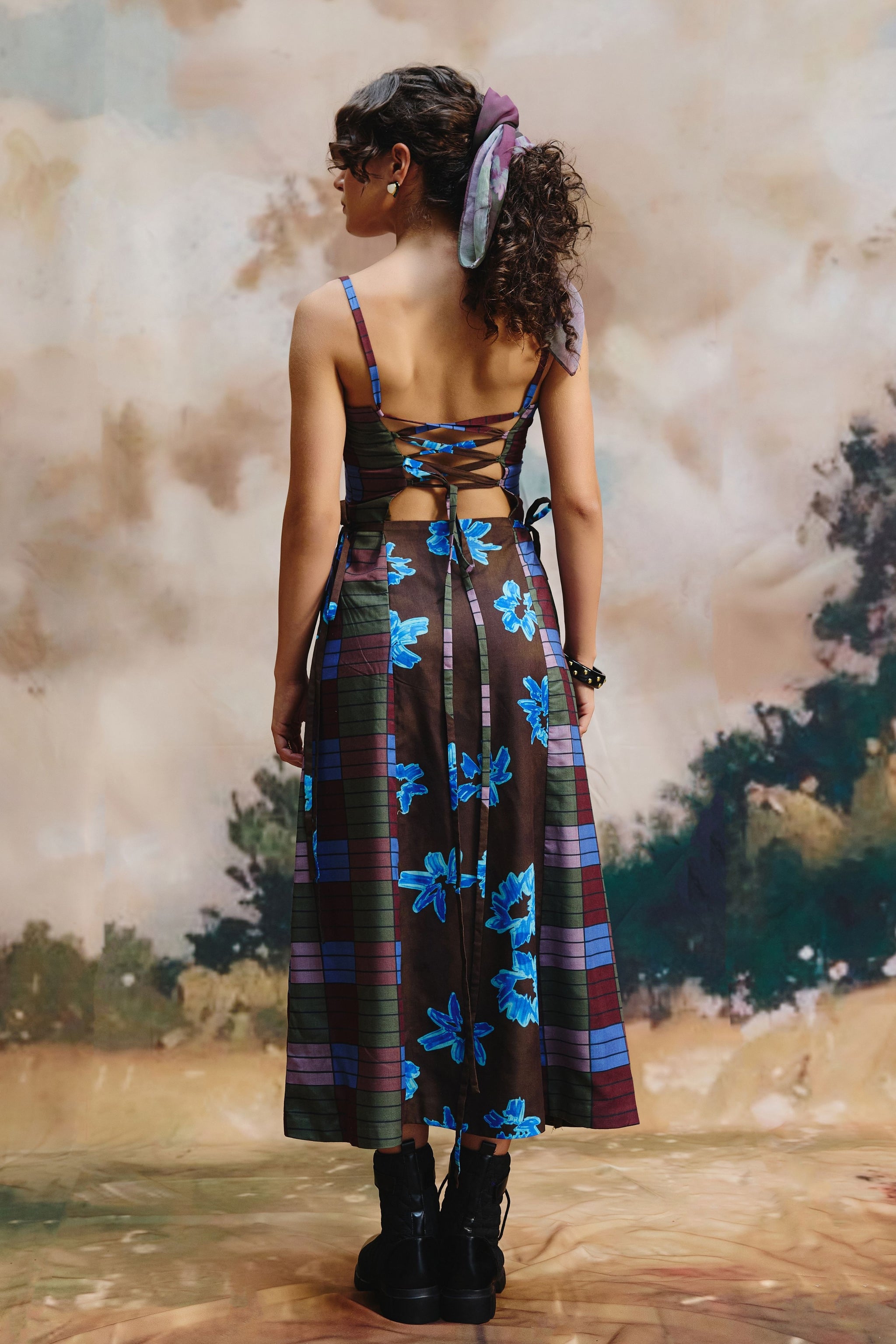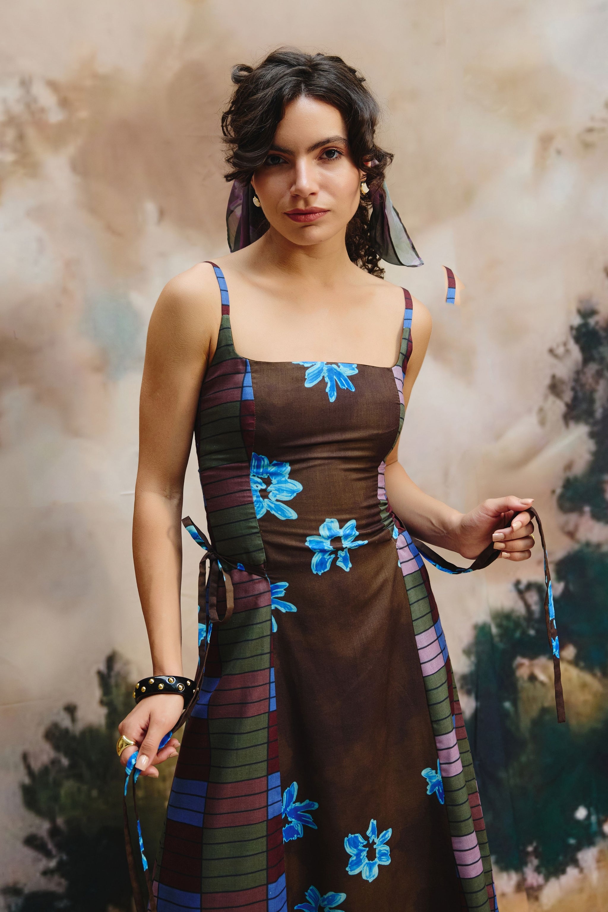 • Crafted from a linen fabric, this sleeveless midi dress features thin straps and a flared skirt. The brown base with blue floral accents and plaid details on the sides adds a unique charm, perfect for casual outings or stylish gatherings.