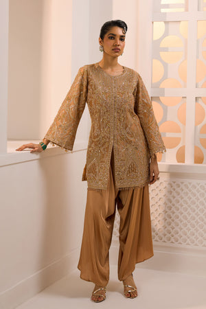 • This striking gold ensemble pairs a rich, intricately hand-embroidered tunic jacket with fluid dhoti-style trousers for a look of regal ease. Featuring dramatic bell sleeves and delicate tassel detailing, it is modern ethnic glamour designed to make a grand, editorial entrance.