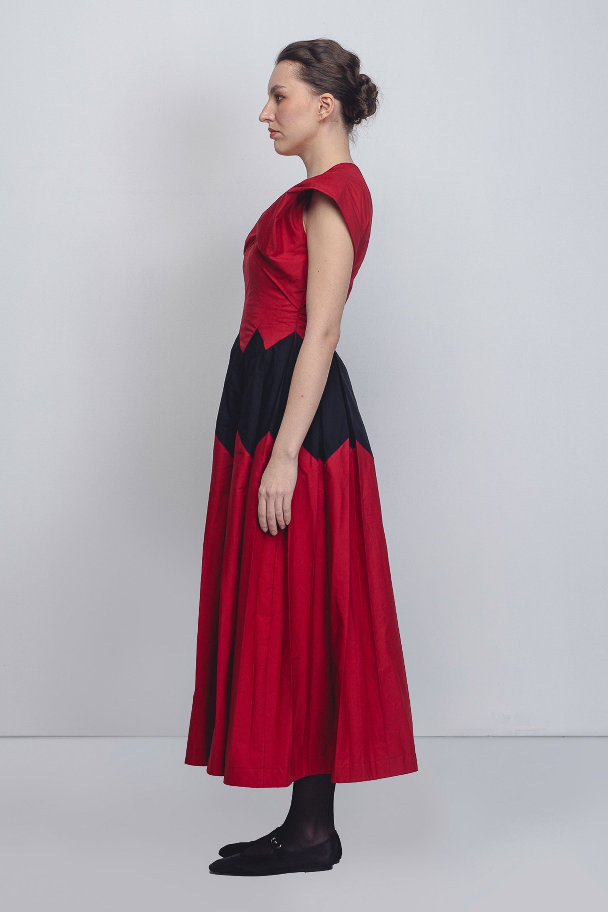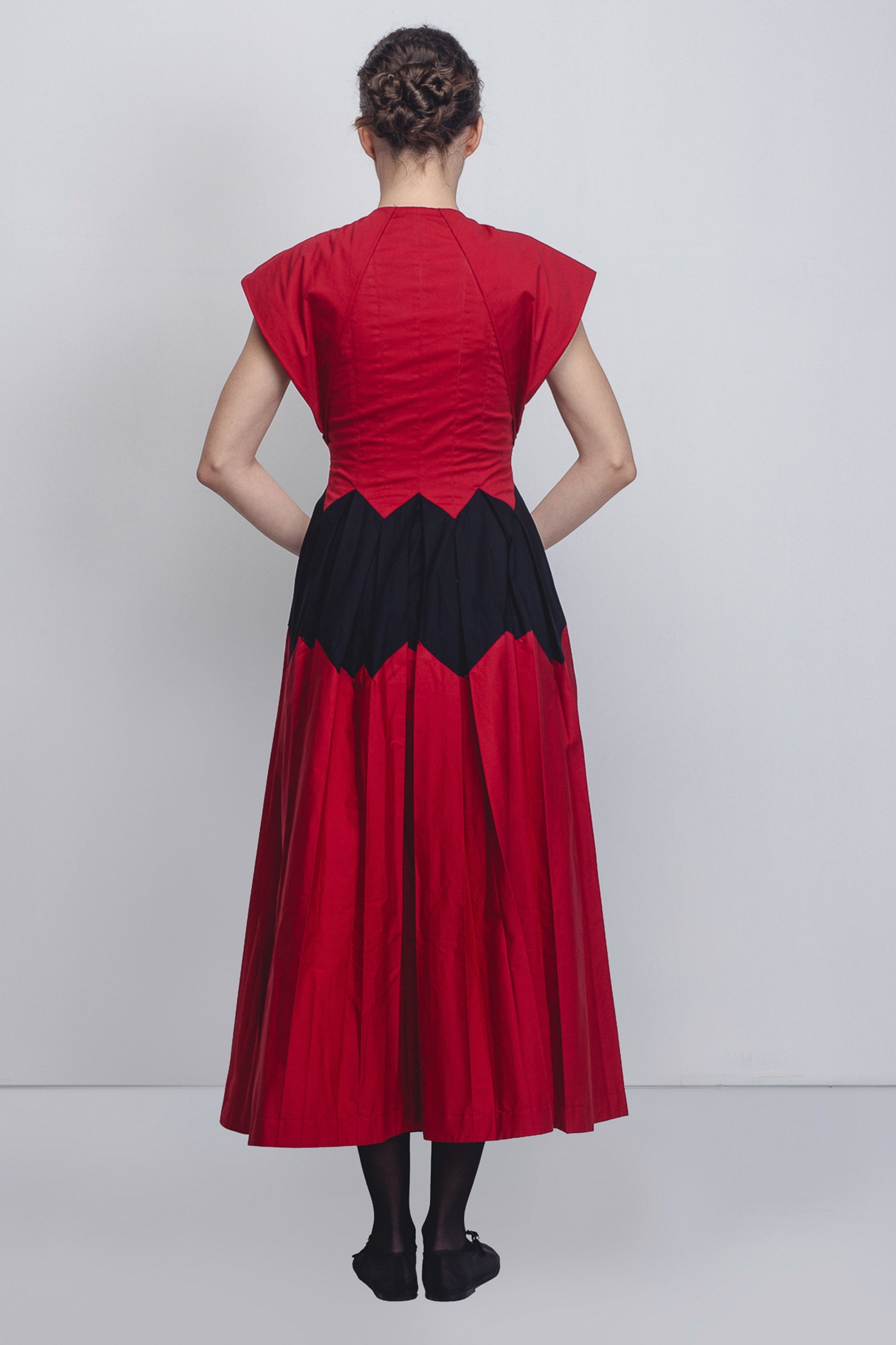 • This dress features a V-neckline with an integrated bow detail that creates elegant draping across the bust, leading into sharp, structured cap sleeves. It has a zigzag chevron waistline, where the red bodice meets a black-and-red box-pleated skirt. The model is 5'10, and the garment length is 55 inches.
