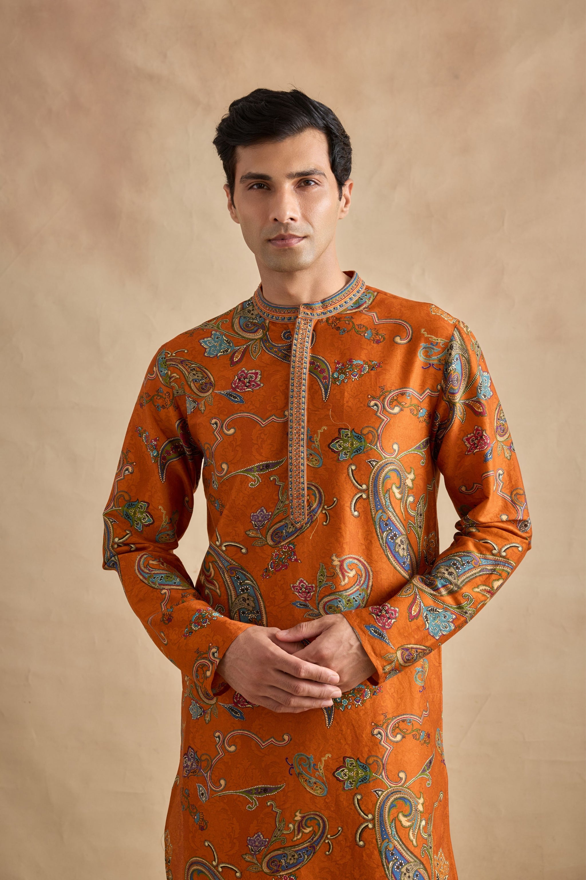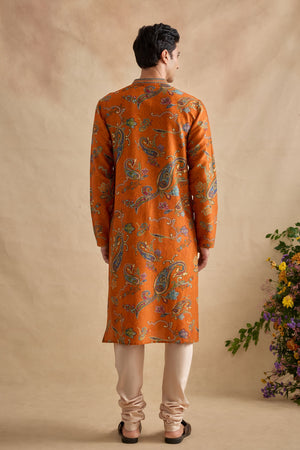 • Style yourself in our artistically pleasing kurta in an all-over chintz print and resham embroidery on the neck. It is paired with a contrast colour churidaar. The kurta length is 45 inches and the churidar length is 58 inches.