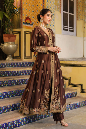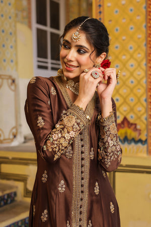 • This beautiful 3-piece kalidar set showcases heavy embroidery on the hem and sleeves of the kalidar, complemented by delicate butis spread all over. It is paired with straight pants and a heavily embroidered dupatta, creating a complete and sophisticated ensemble.