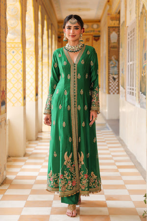 • This exquisite 3-piece kalidar set features heavy embroidery on the hem and sleeves of the kalidar, adorned with delicate butis spread all over. It is paired with straight pants and a heavily embroidered dupatta, completing a graceful and sophisticated ensemble.