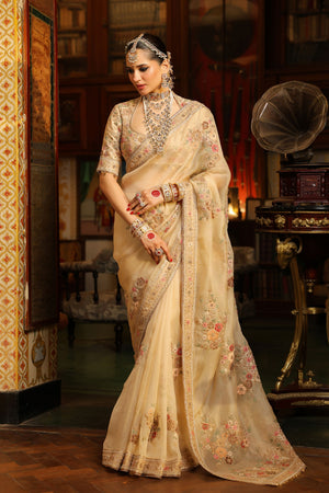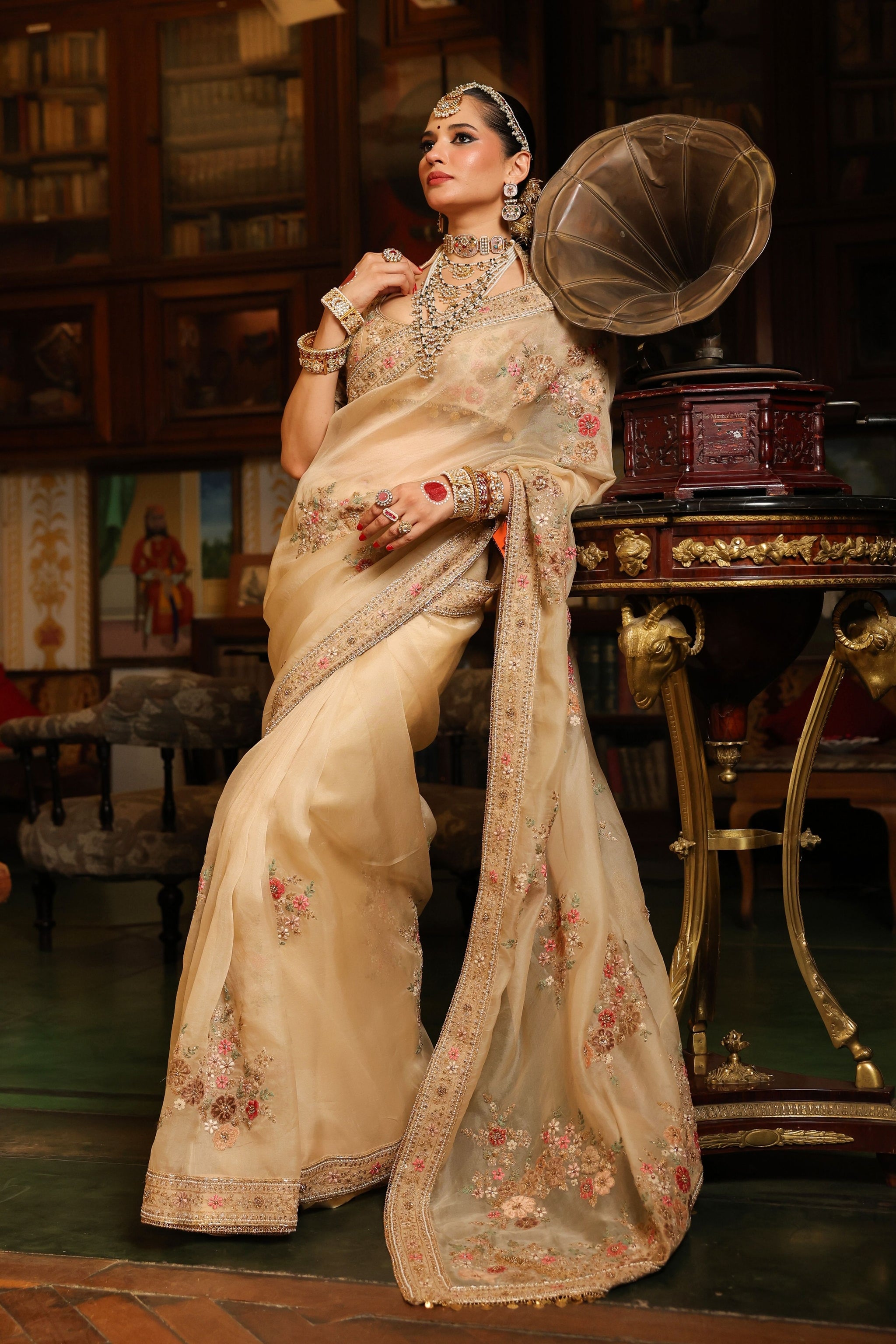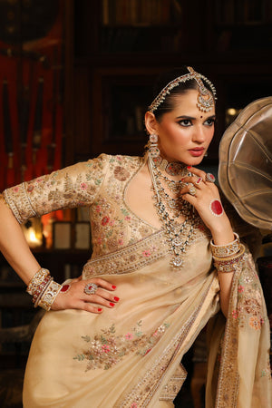 • This elegant saree set features heavy appliqué embroidery enhanced with exquisite zardosi, tikki, and beadwork. It is paired with a heavily embroidered blouse, completing the ensemble with rich detailing and sophistication.