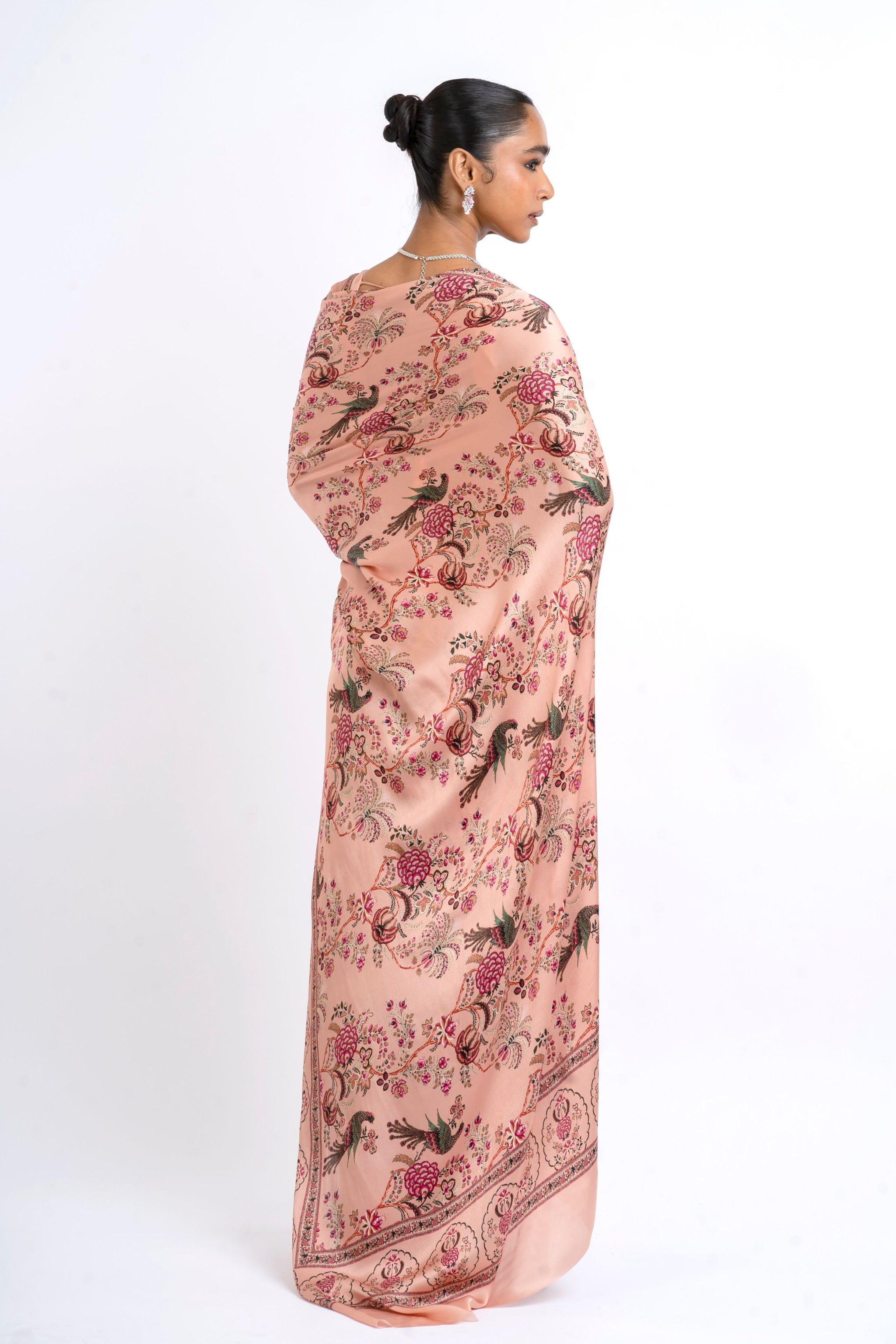 • Experience elegance with this satin silk saree, offering a classic dusty rose base adorned with dynamic peacock Chintz prints. The rich colors stand out beautifully against the soft, luxurious fabric.