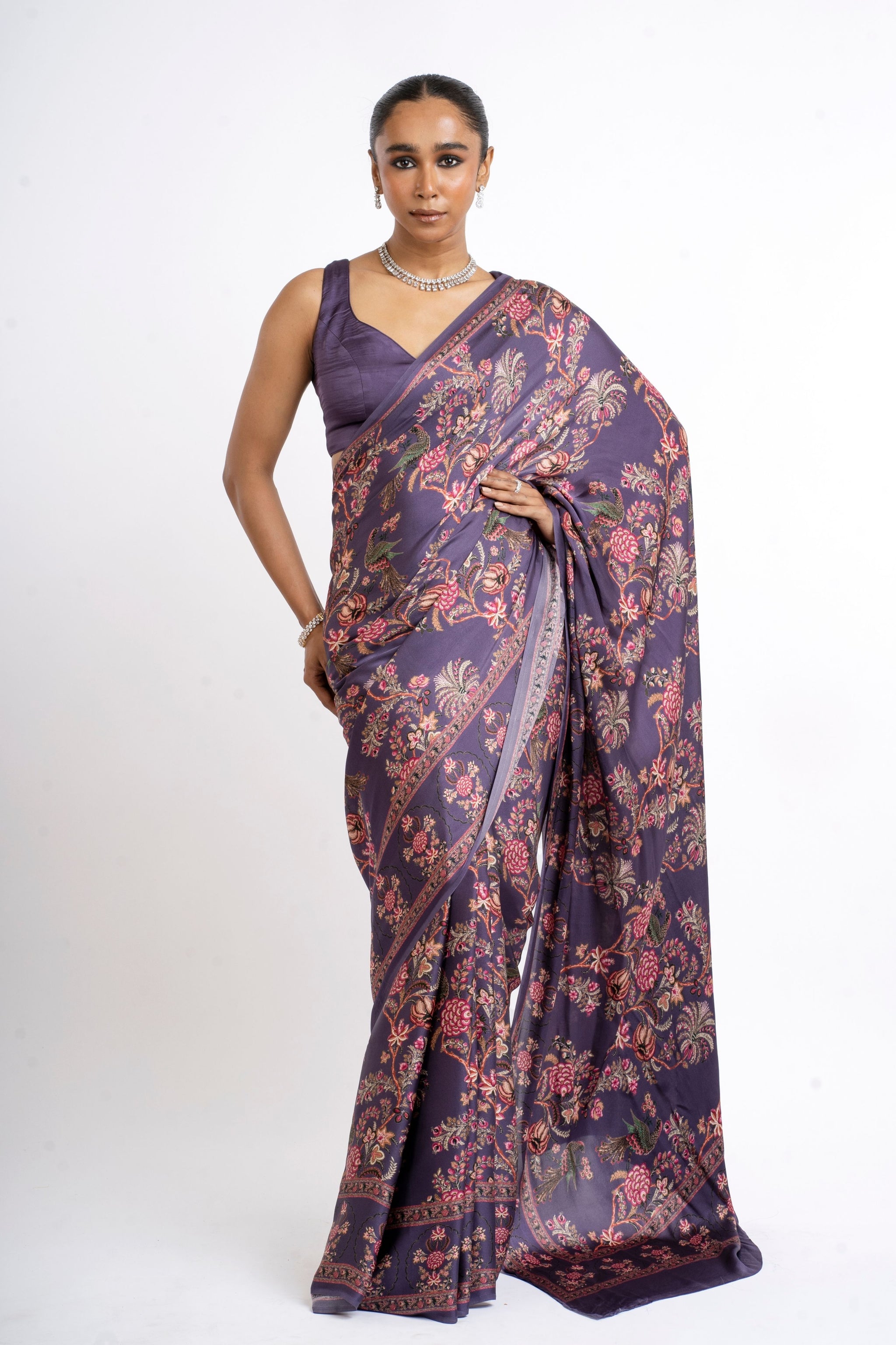 • Experience elegance with this satin silk saree, offering a classic plum base adorned with dynamic peacock Chintz prints. The rich colors stand out beautifully against the soft, luxurious fabric.