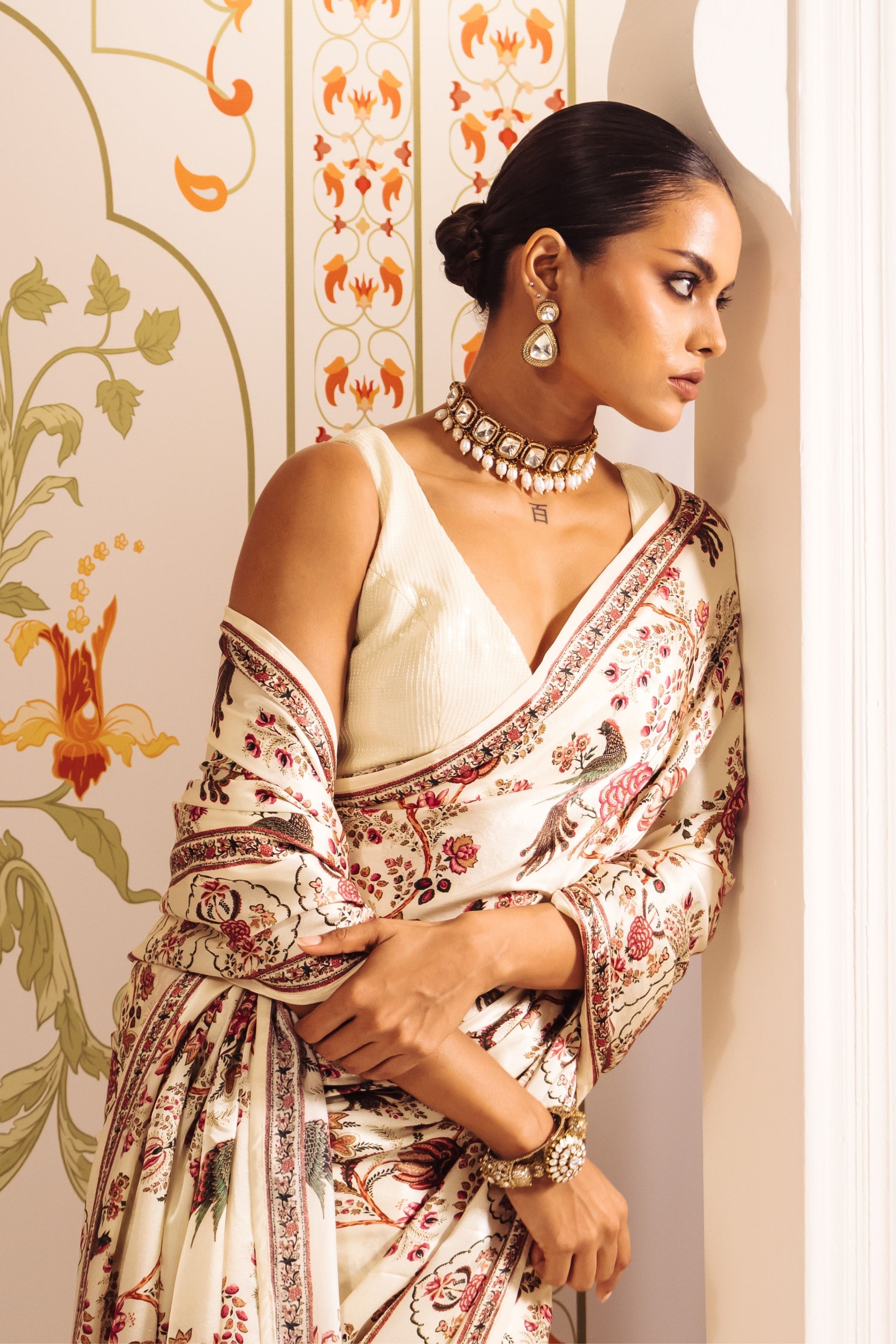• Experience elegance with this satin silk saree, offering a classic white base adorned with dynamic peacock Chintz prints. The rich colors stand out beautifully against the bright, luxurious fabric.