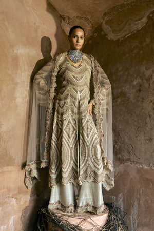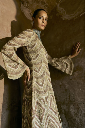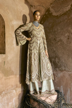 • A regal gold ensemble featuring a hand-embroidered kurta with intricate geometric beadwork, paired with wide flared trousers. The look is elevated by bell sleeves and a scallop-embroidered dupatta that adds fluid elegance. A perfect blend of grandeur and modern sophistication, ideal for festive and wedding celebrations.