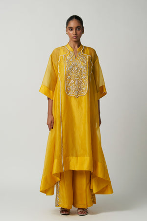 • Elevate your festive wardrobe with this pure organza hand embroidered flared kurta, crafted for elegance and comfort. Featuring a beautifully flowing a-line silhouette with generous flare, this piece drapes effortlessly on all body types, making it a forgiving and flattering fit. The kurta is adorned with delicate hand embroidery, adding timeless charm and artisanal detailing that stands out at any celebration.