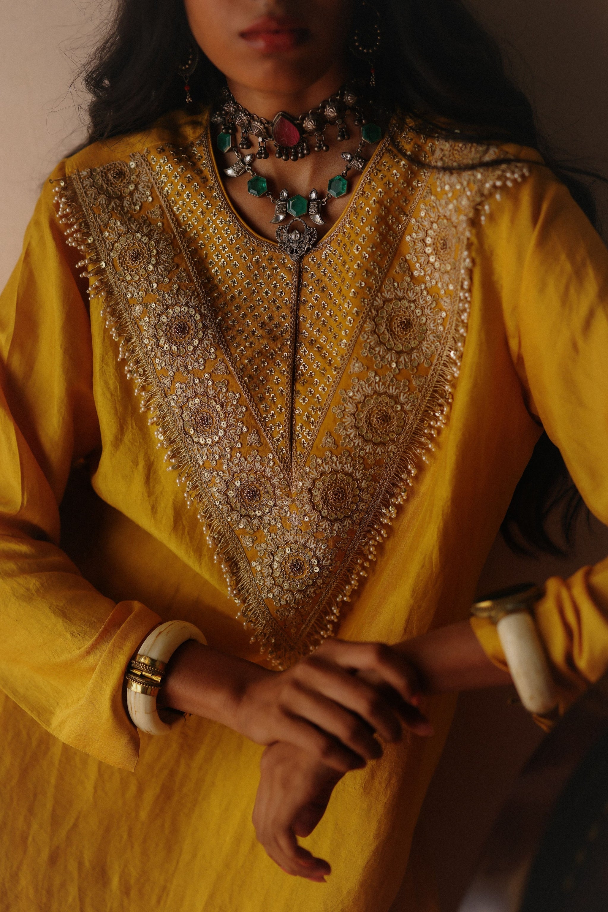 • Crafted in pure Silk, this Kurta highlights a dori-worked yoke with fine pearl detailing, paired with matching dhoti pants for an elegant ensemble